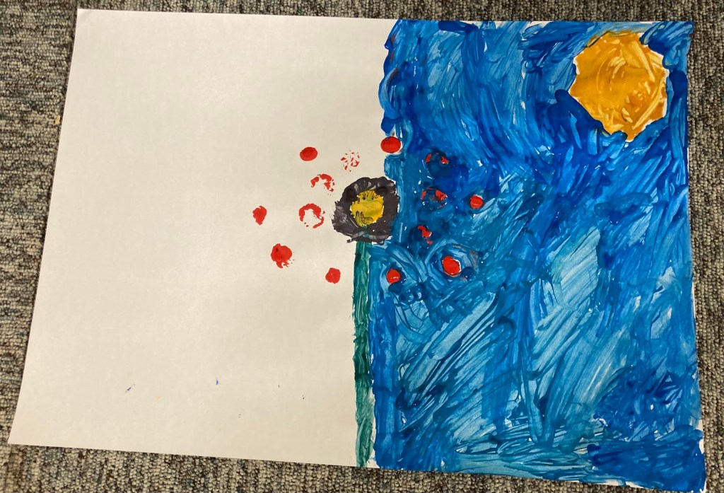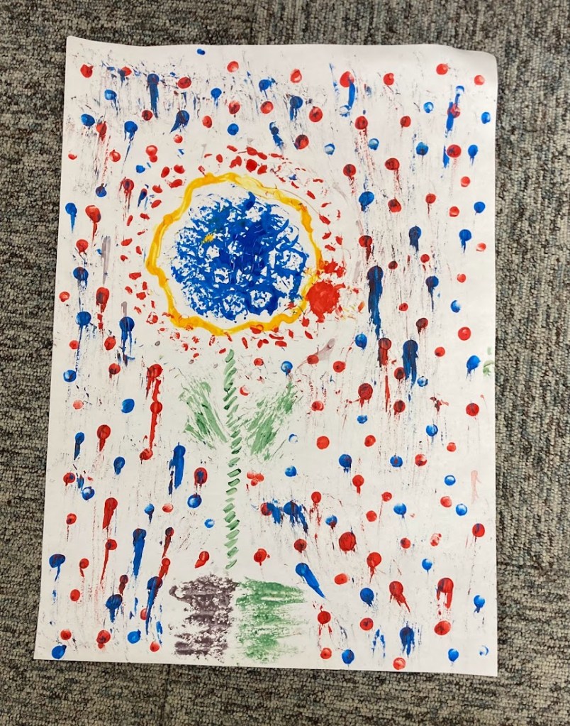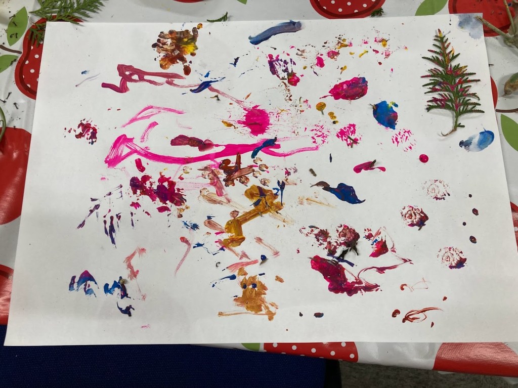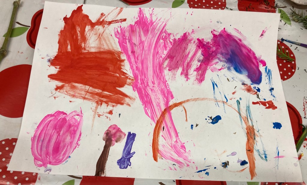 Today we have been experimenting with using different parts of several different plants to paint some pictures. We had daffodils, snowdrops, fir tree leaves, dried poppy seed pods, buddleia, strawberry leaves and dried rudbeckia flower heads. Everyone chose their own colours and what plants they wanted to use. The daffodils were the most popular tool! Their stems were really good for making lines and the petals could make a variety of interesting marks depending on how you use them.