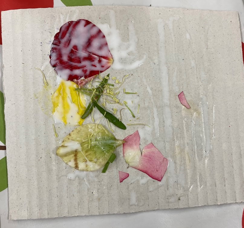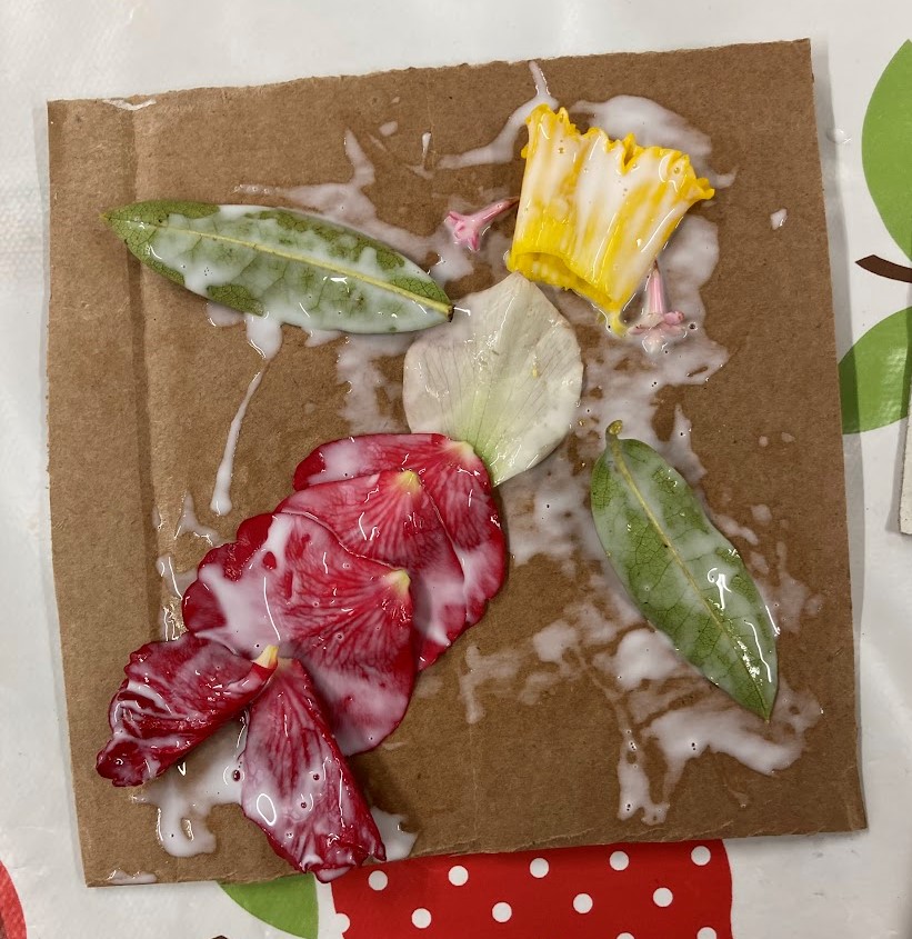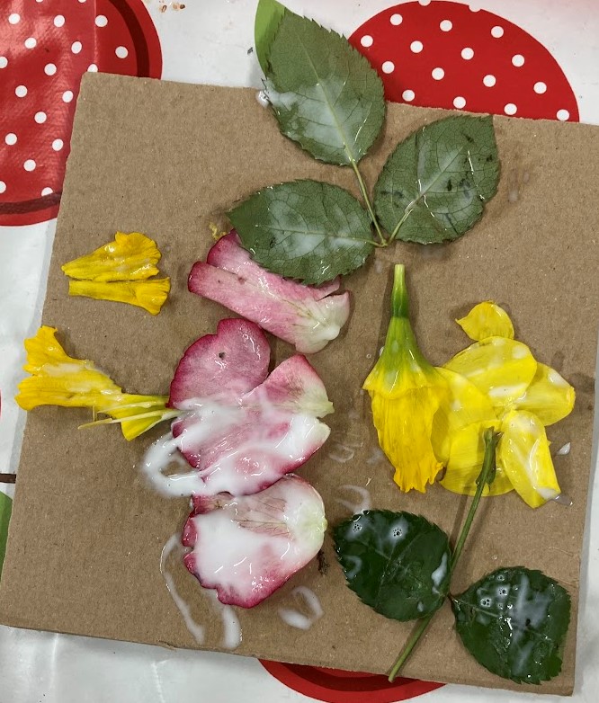This week we made some D.I.Y. nature printing pads using flowers, leaves, cardboard and glue!
