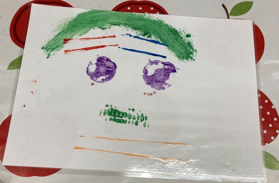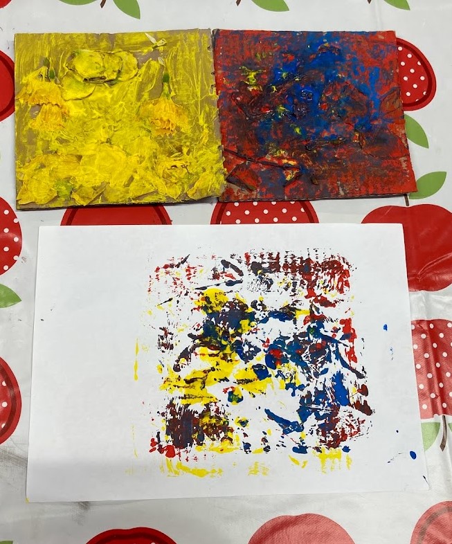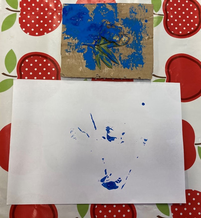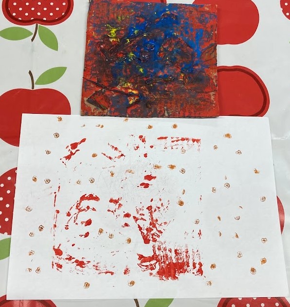 We have been very busy today! The first thing we did was test out our printing pads we made last week. We put paint on the pads and then placed them on paper, next we pushed down on them for a few seconds before lifting them up and seeing the result! One of the children used both their printing pads in order to make a print with lots of layers.