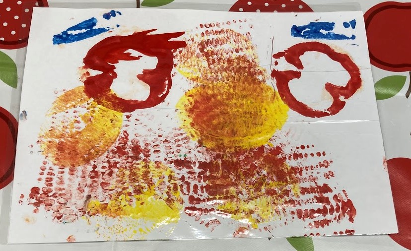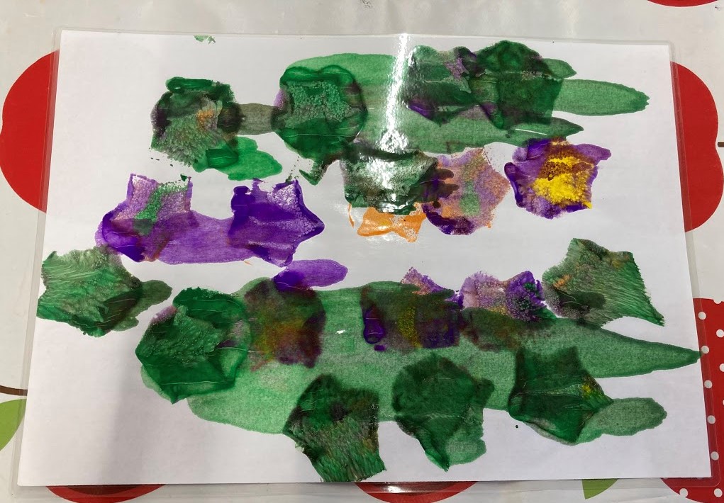 After we finished testing our printing pads we made some placemats by doing some vegetable printing on paper and then laminating them (after drying the paint). Everyone had the most fun with the sweetcorn, especially using it to mix colours!