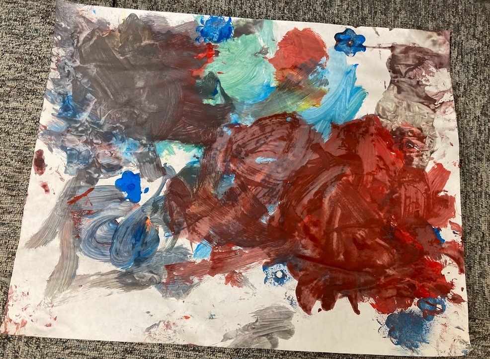 There was a choice of different sized brushes, sponges, cotton wool, wool, cardboard, bubble wrap and plastic palette knives to use. Everyone had their own palette with red, blue, yellow, black and white to use to practice their colour mixing skills.