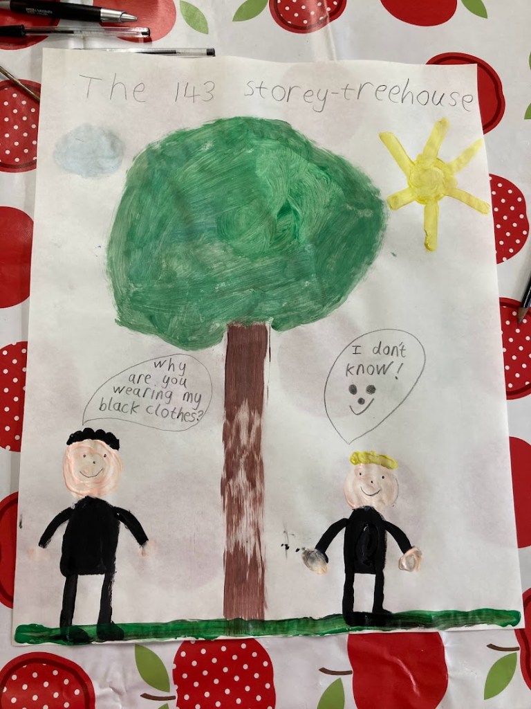 Today we had lots of fun painting pictures based on our favourite stories. Some chose to paint scenes from their chosen stories and others had a go at recreating the book covers.
