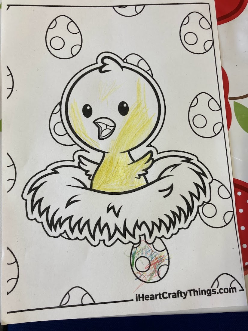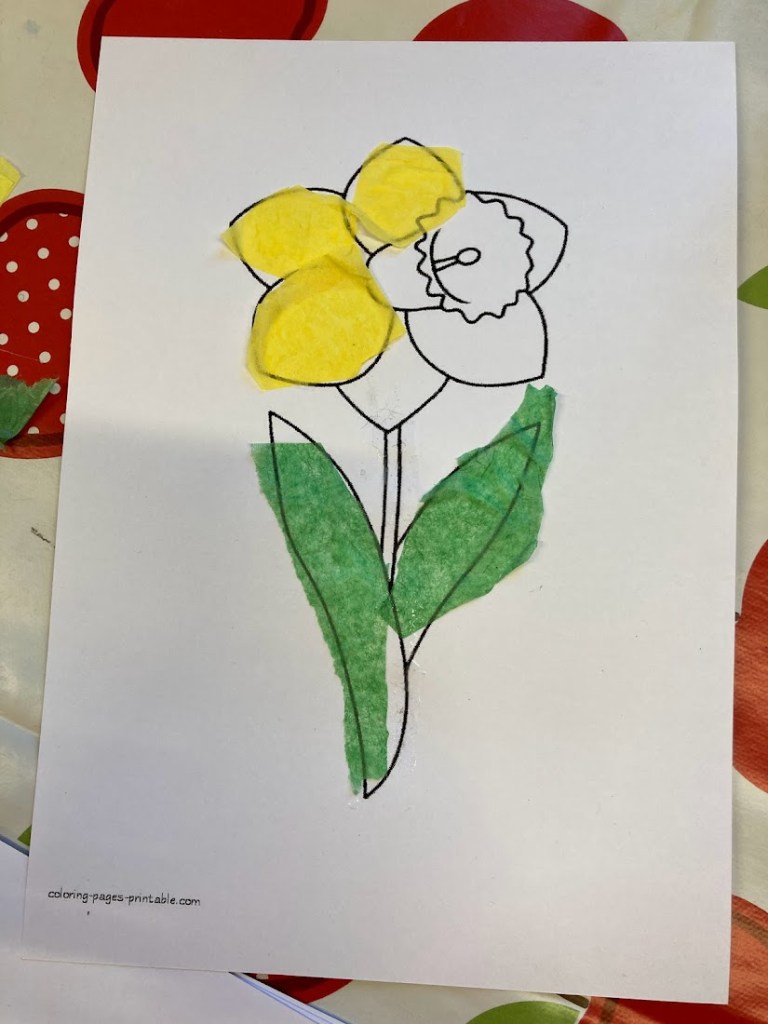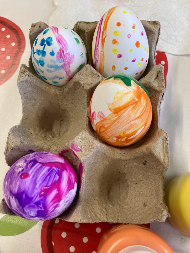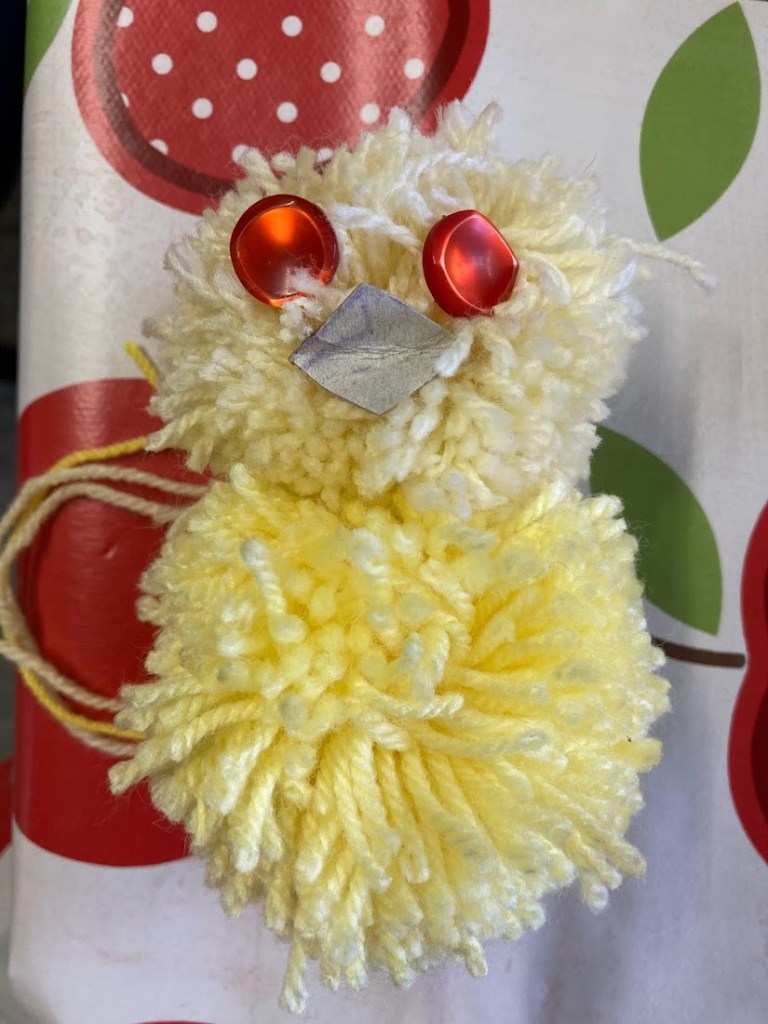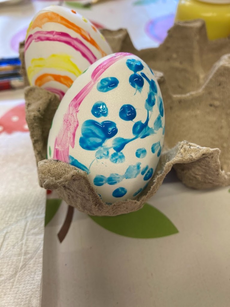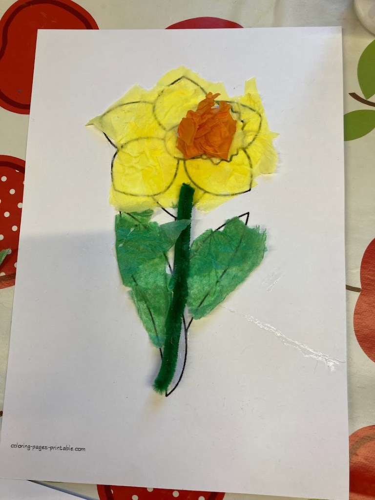 As something a little bit different this week we had several activities available today. We had egg painting, daffodil collages, pom-pom chicks and Easter colouring pages. Everyone loved painting eggs and making collages! The pom-poms were tricky and we ended up only getting three done, we probably need more time if we make pom-pom chicks again, but the pom-poms we successfully made look awesome!