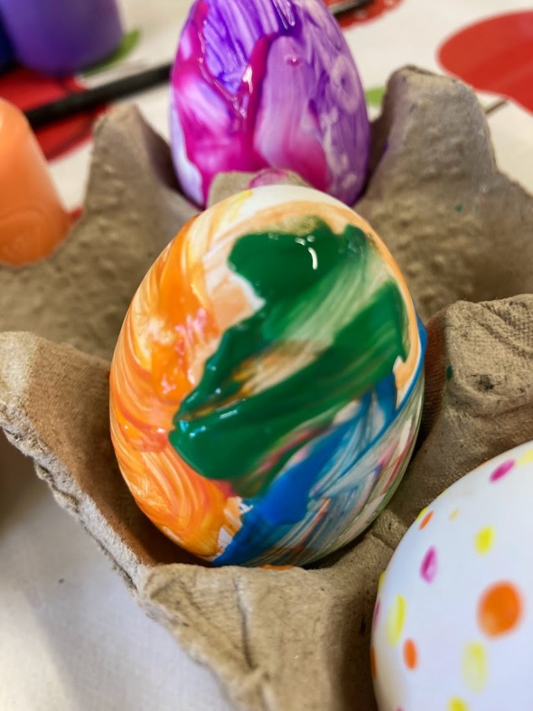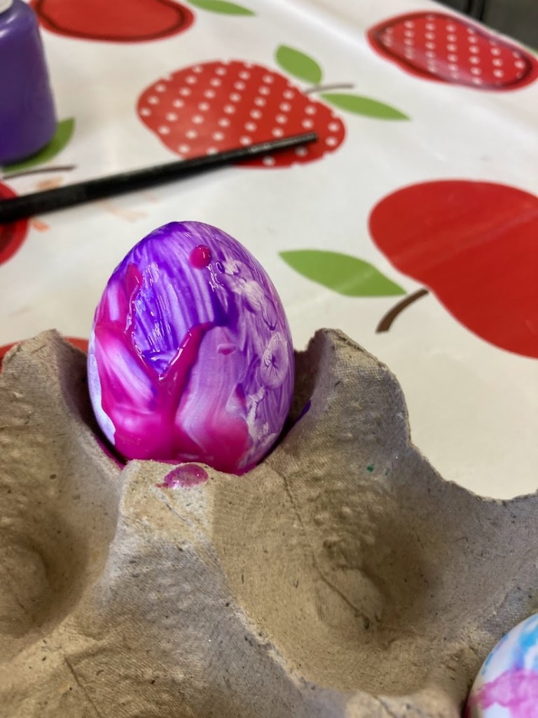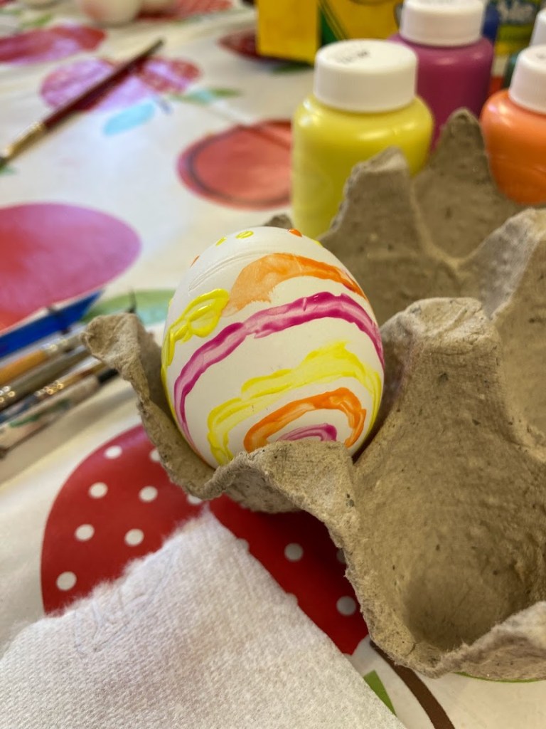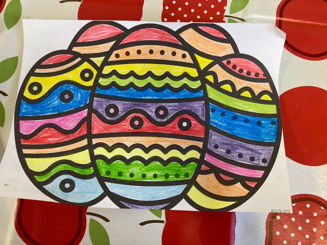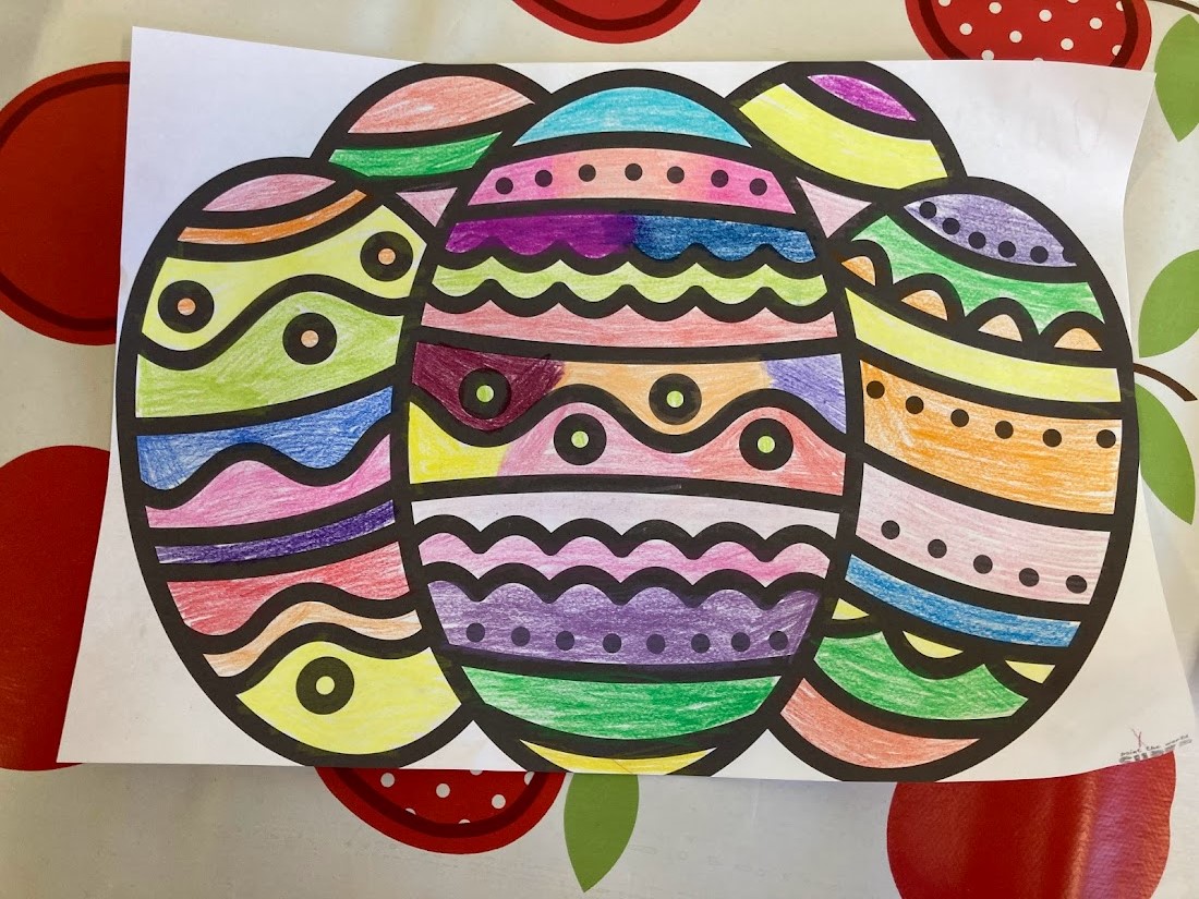 As something a little bit different this week we had several activities available today. We had egg painting, daffodil collages, pom-pom chicks and Easter colouring pages. Everyone loved painting eggs and making collages! The pom-poms were tricky and we ended up only getting three done, we probably need more time if we make pom-pom chicks again, but the pom-poms we successfully made look awesome!
