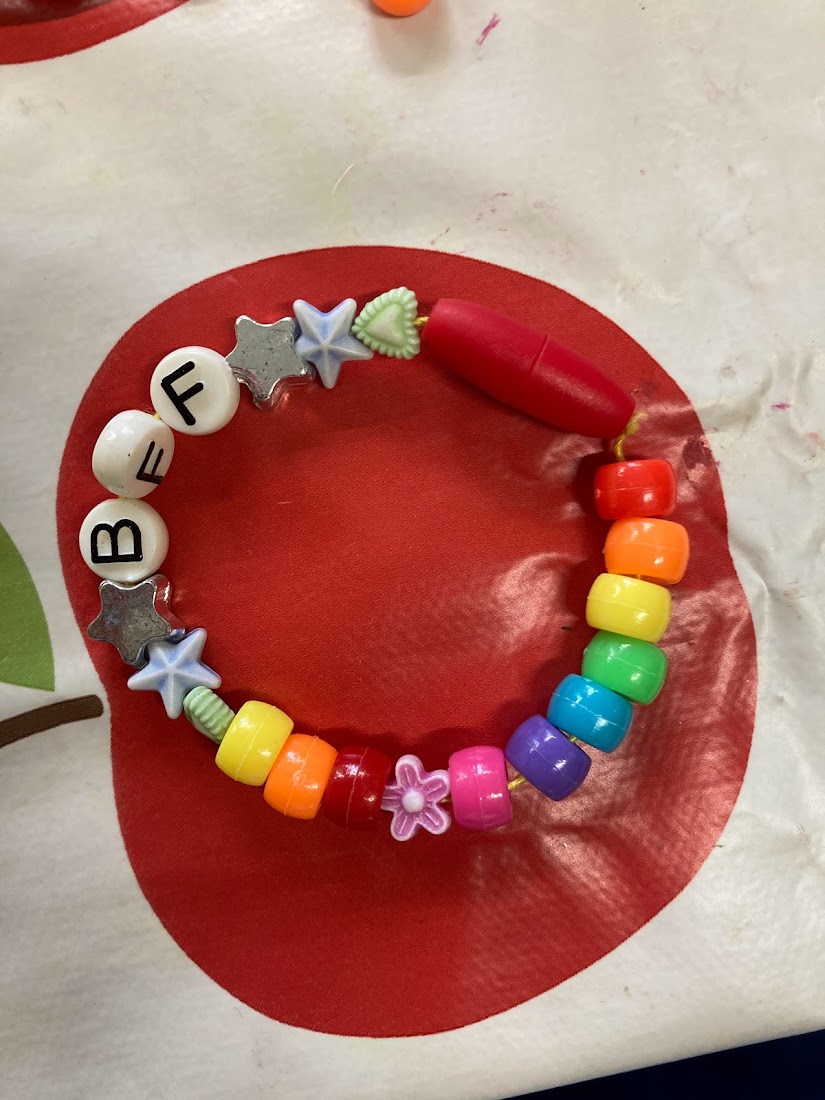 This week the children made the finishing touches to their canvas paintings. Once they were satisfied with their art they then spent the second half of the session making bracelets. They enjoyed looking through the bead box and choosing which beads to use.