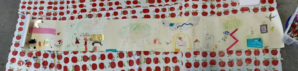 We spent today’s session finishing off our Fairy Grotto picture. Most of the children managed to complete their part of the Grotto. They enjoyed thinking up ways to use collage materials and pencil crayons together, such as collage dresses for fairies with pencil crayon bodies or shiny wrapping paper pond surrounded by pencil crayon gnomes and grass. One of the children also thought it would be fun to add a dragon, specifically an ender dragon, as well as a portal from minecraft.