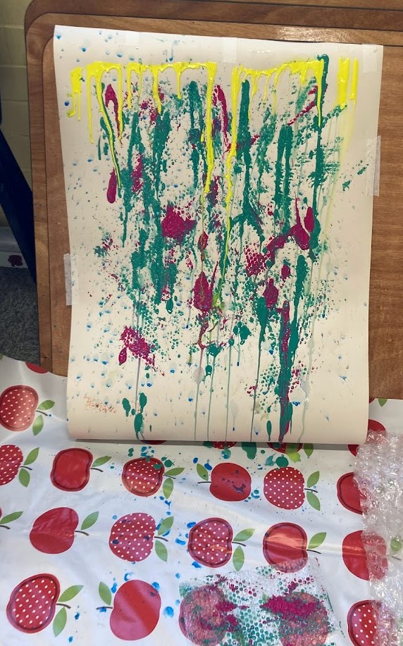 After this the group decided to continue with the idea of dripping paint on paper to make a collection of interesting and vibrant paintings. One of the paintings also had bubble wrap mark making worked into it (first image to the left below) and another had a small paper plate dinosaur stuck on top of rainbow rain (far right, below).