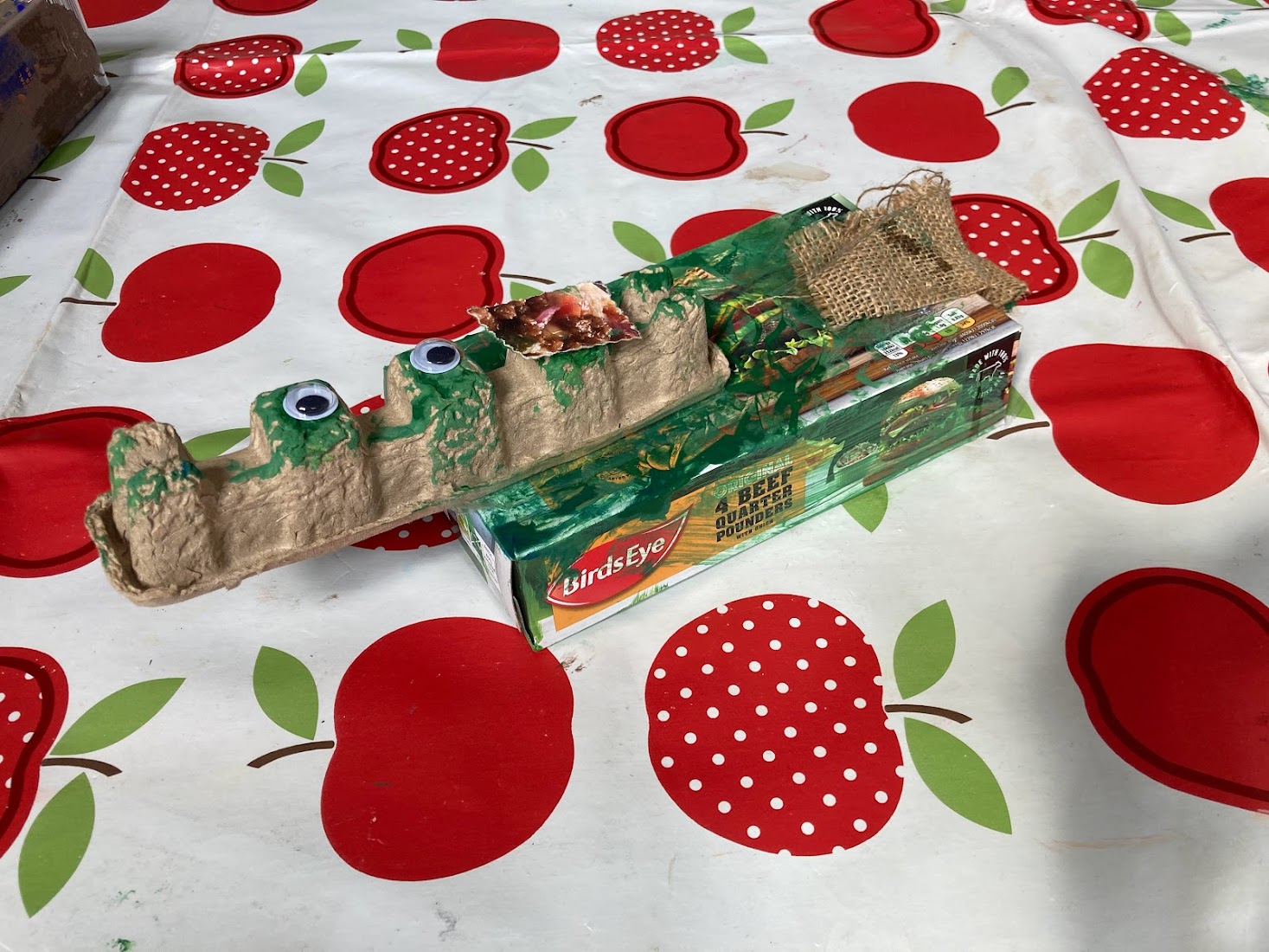 Today we had loads of fun making 3D animals! We used paint, boxes, fabric, googly eyes, glue and cellotape. The Toddler group made two snappy crocodiles and one sleepy hippo, we mixed our own green and brown paint so that we could make our animals the right colours.