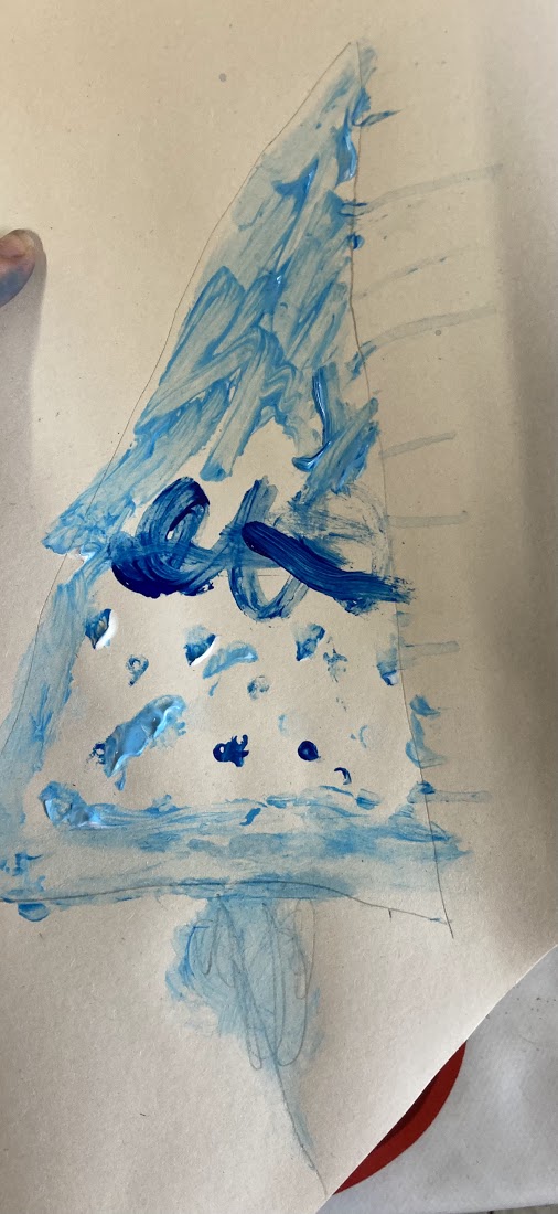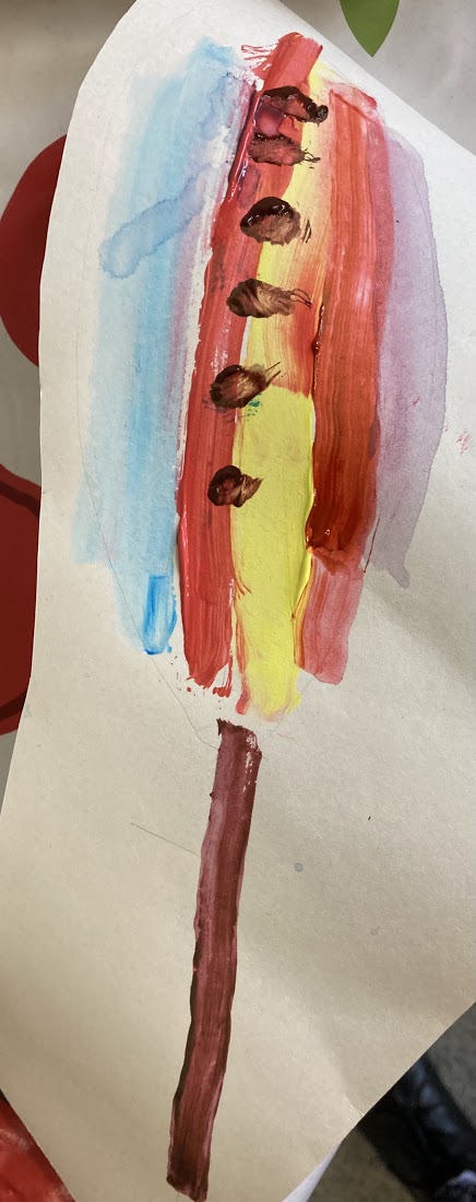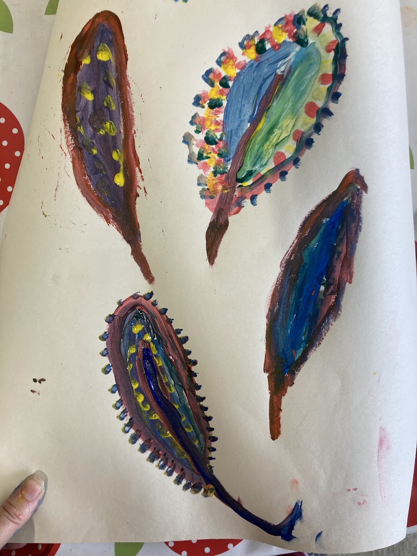 One of the children decided to try painting a bird during the last ten minutes, they enjoyed mixing paint to create orange, two different shades of brown and green.
