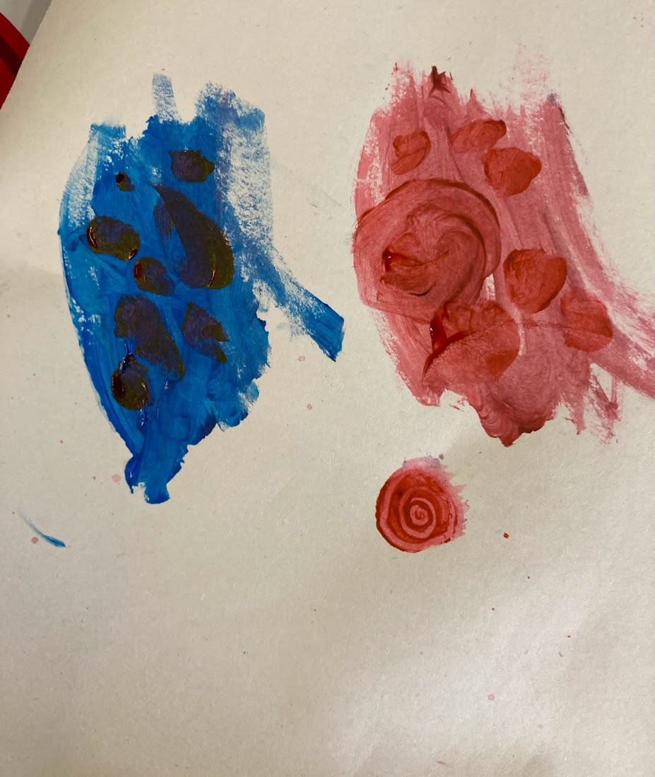 For our first Thursday 4-9 year old session we drew some budgie and cockatiel feathers like the Wednesday group did before half term (click HERE), but instead of monochrome patterns we experimented with colour mixing. We had red, light blue, dark blue, yellow and white paint long with different sized paint brushes to experiment with!