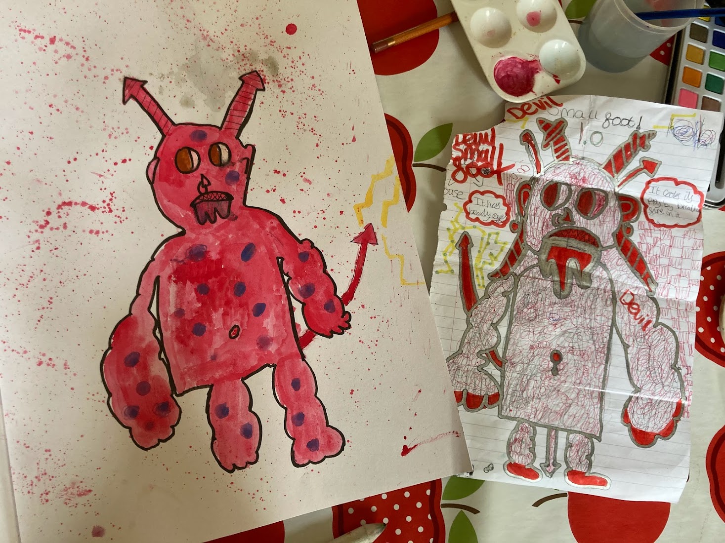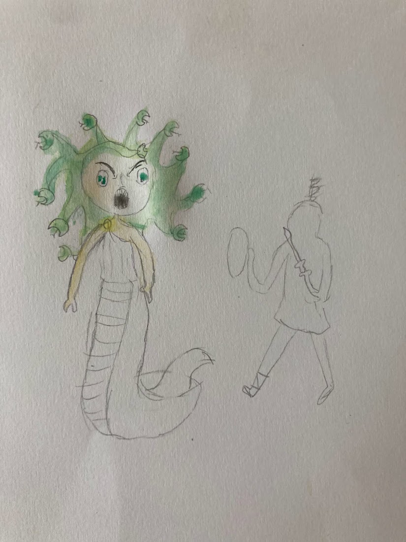 Continuing on with the Harry Potter theme our Friday group pretended to be magizoologists discovering new magical creatures within the world of Harry Potter. We ended up with a mixture of horror inspired creatures, a medusa, an Egyptian art styled bird/human hybrid, an octofly and a chimera with a lions head, goose wings and orangutan body. The children used pencil to sketch their creations, watercolour paint to add colour to them and drawing pens to add detail and strengthen outlines.