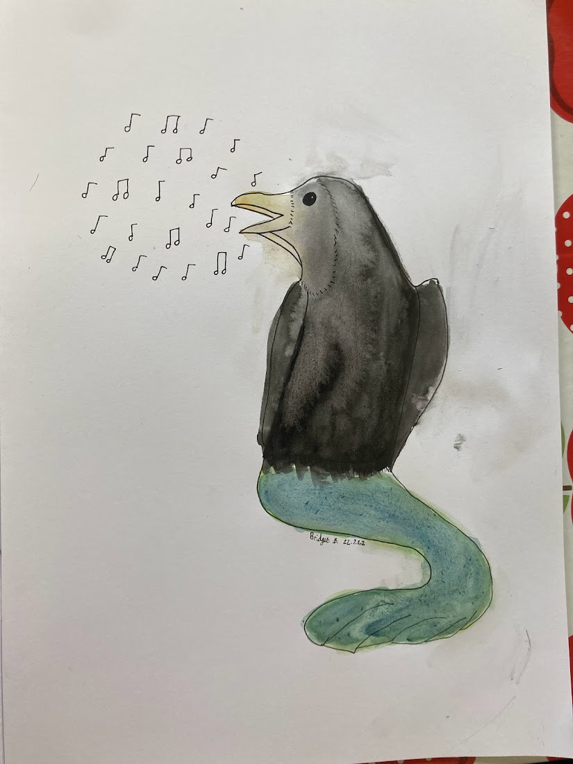 This week the Friday group created their magical creature pictures for our display, some of the children practiced a few ideas in their sketchbook first before creating their final piece. They created their magical beasts by combining different real animals using some animal encyclopaedias we had available to look through as inspiration. Some of the children also thought about mythological whilst creating their creatures. Birds ended up being a very popular source of inspiration for everyone.