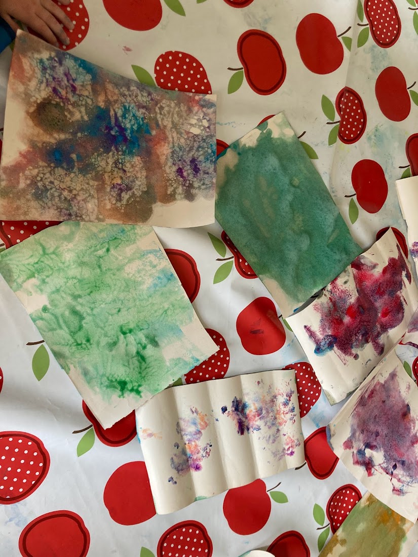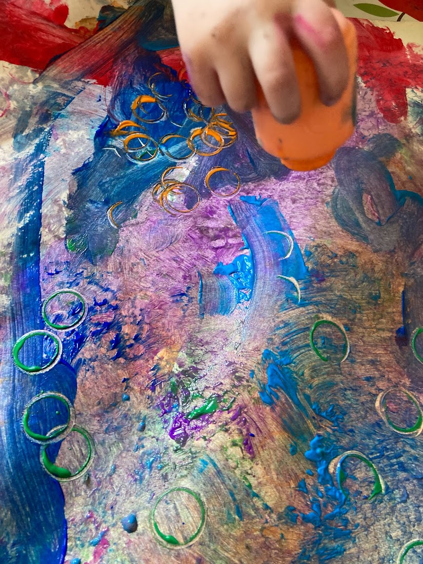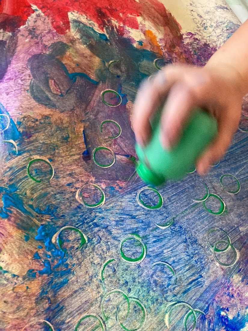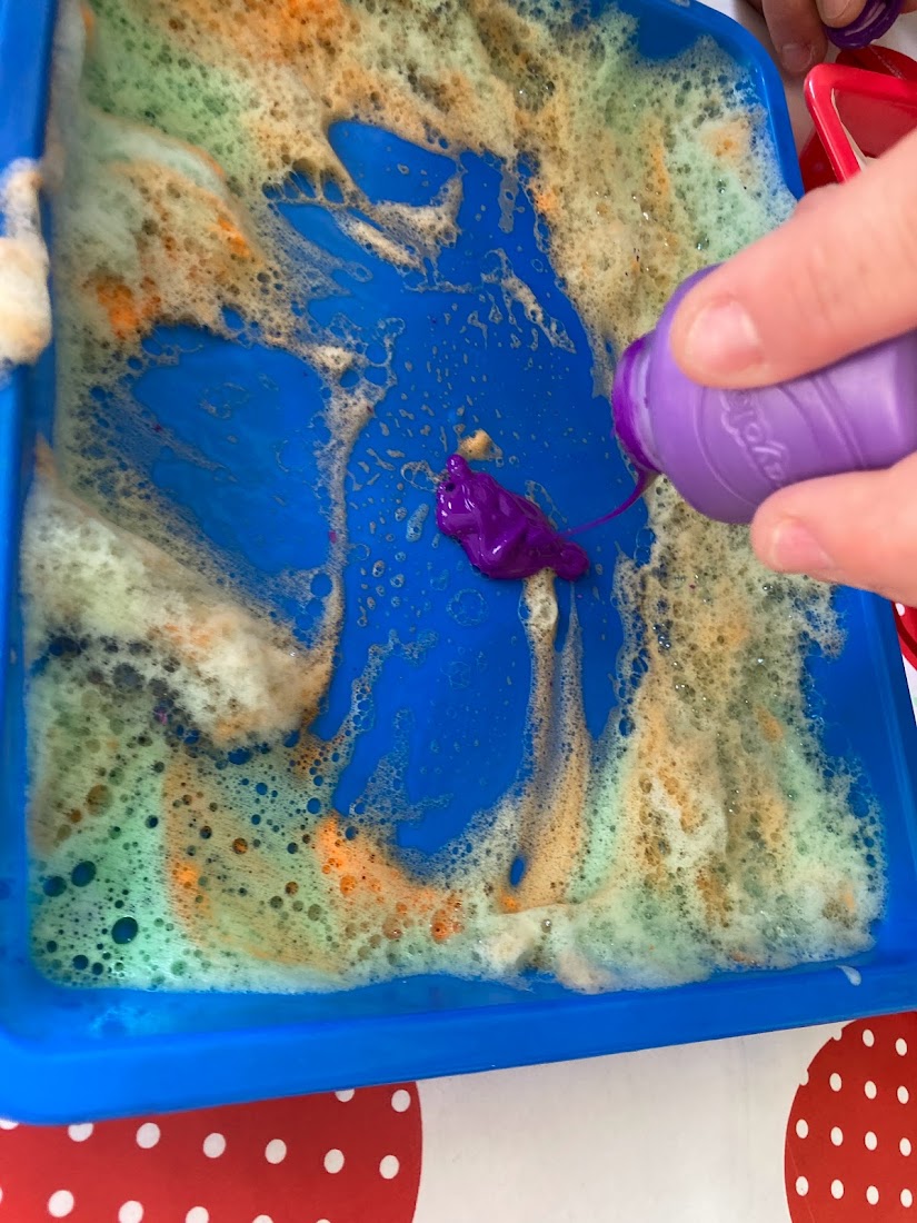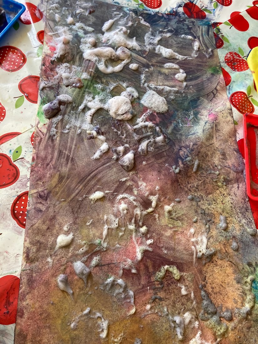 We had the little Crayola paint pots so it was easy to add extra colours to our palette trays and see what happens when we only partially mix colours. The bubbly textures were lots of fun! We even tried popping the bubbles!