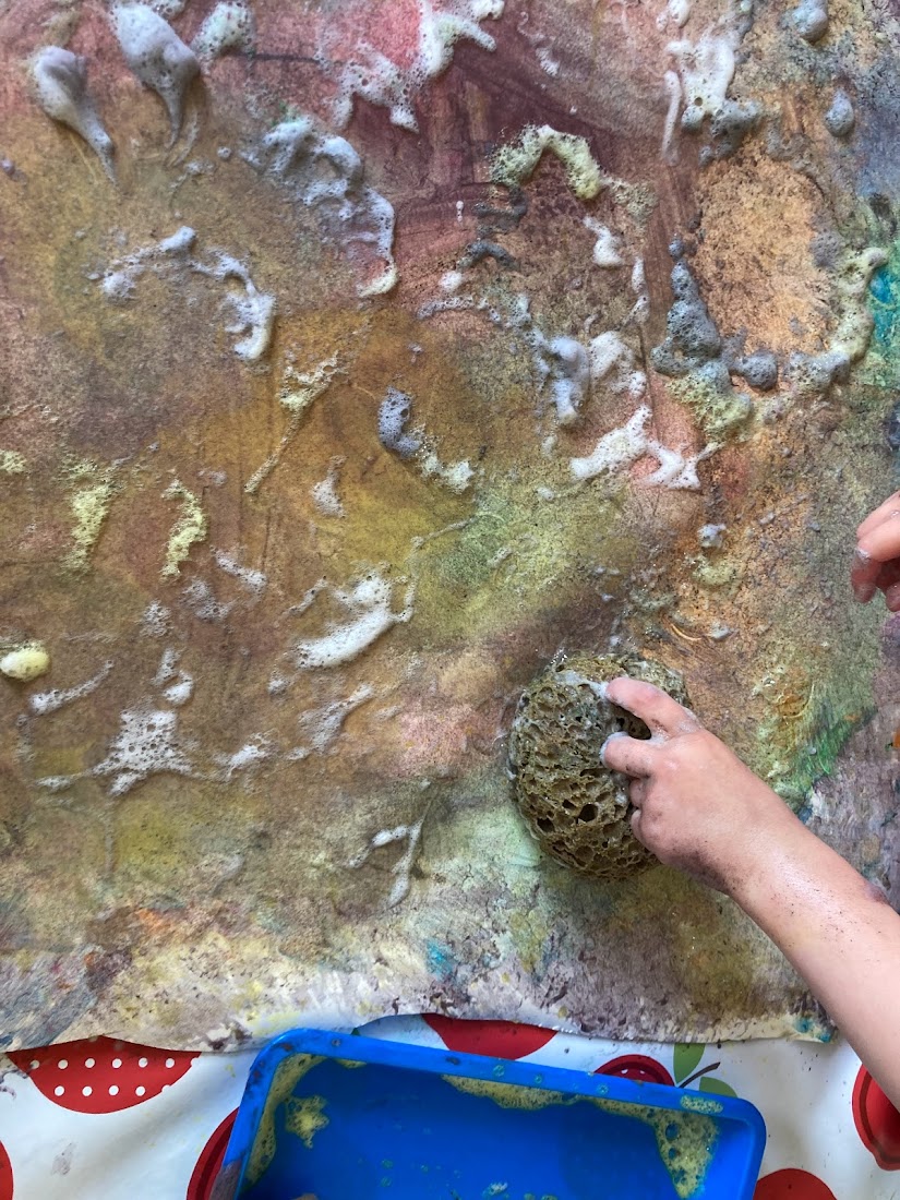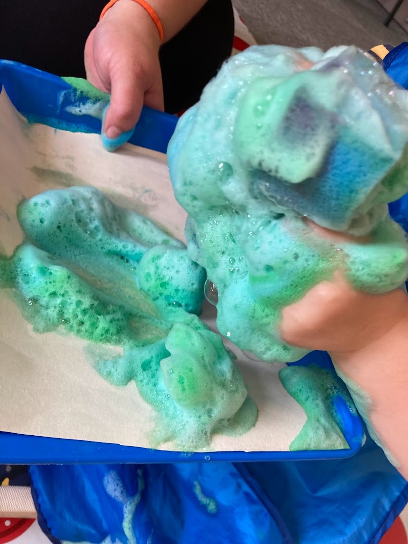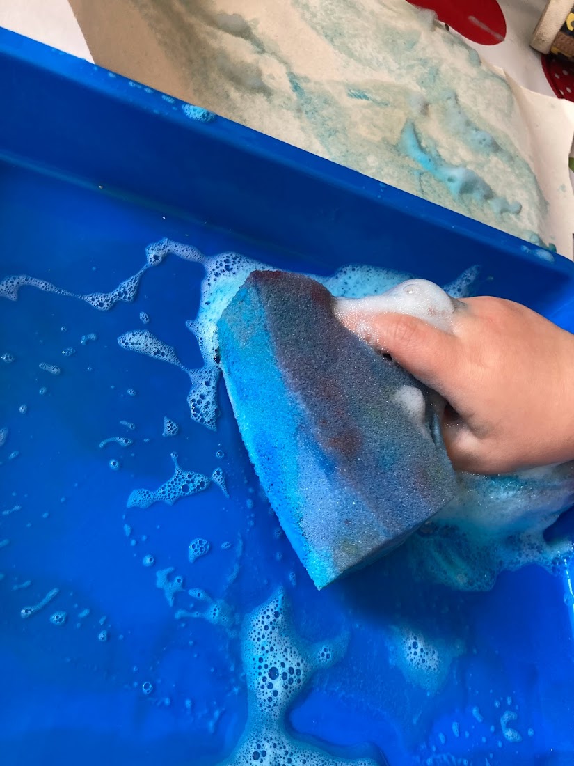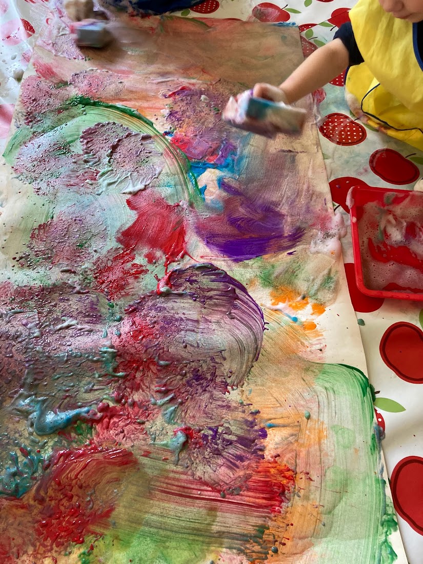This week the toddlers had lots of fun exploring bubble painting! We mixed paint with washing up liquid and a small amount of water, we then used sponges to mark make on the paper!