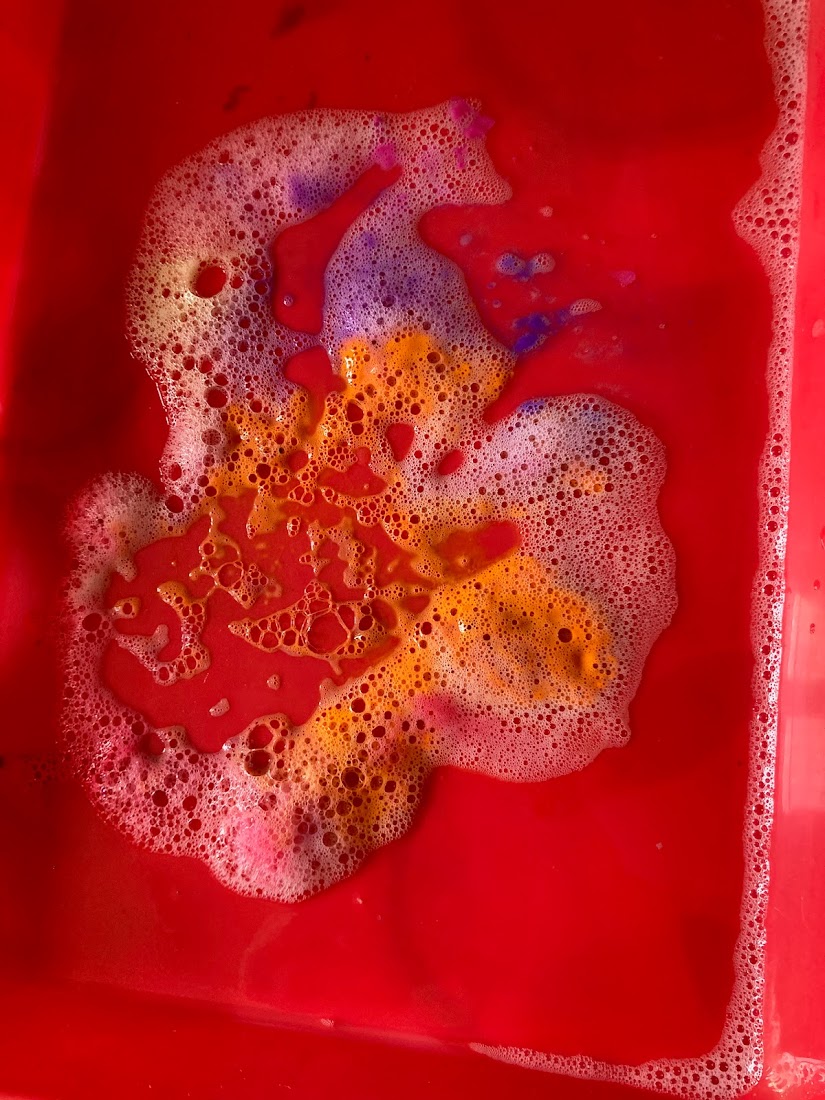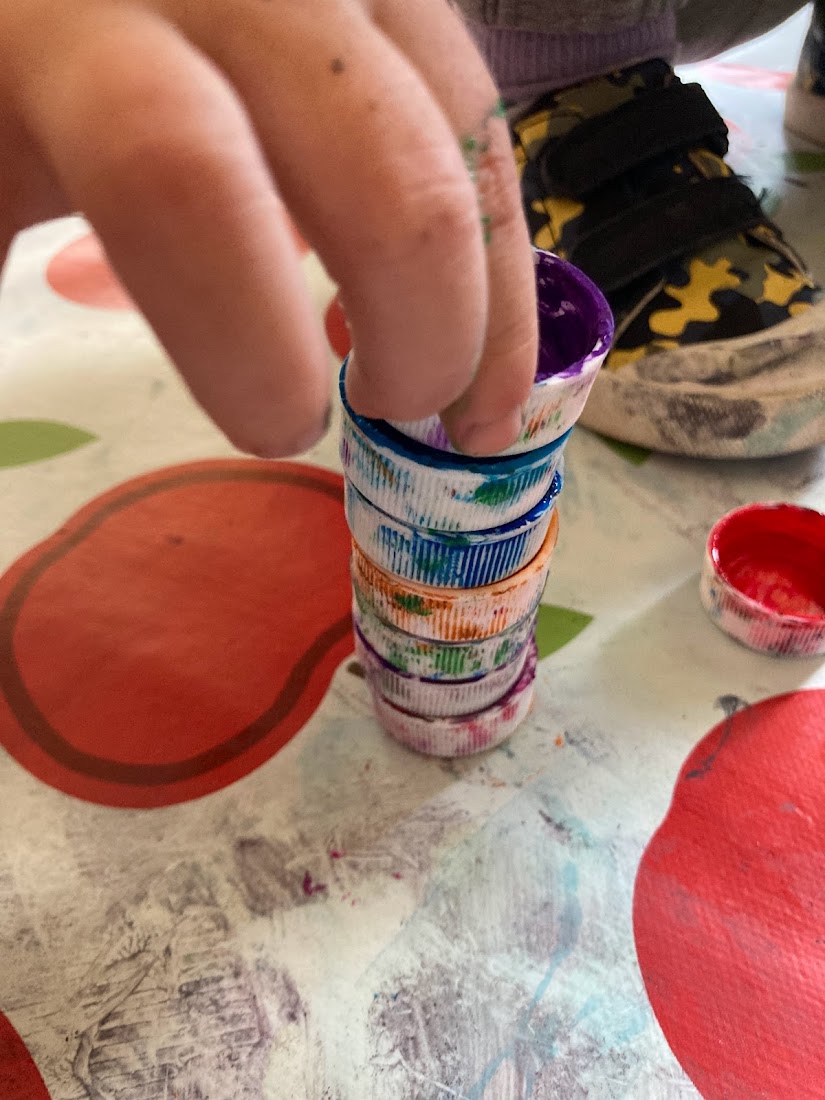 During the last fifteen minutes we all worked together to make one big picture with the bubble paint and finished it off with three of us making prints with the empty paint pots, whilst another child made an awesome tower by stacking the lids.