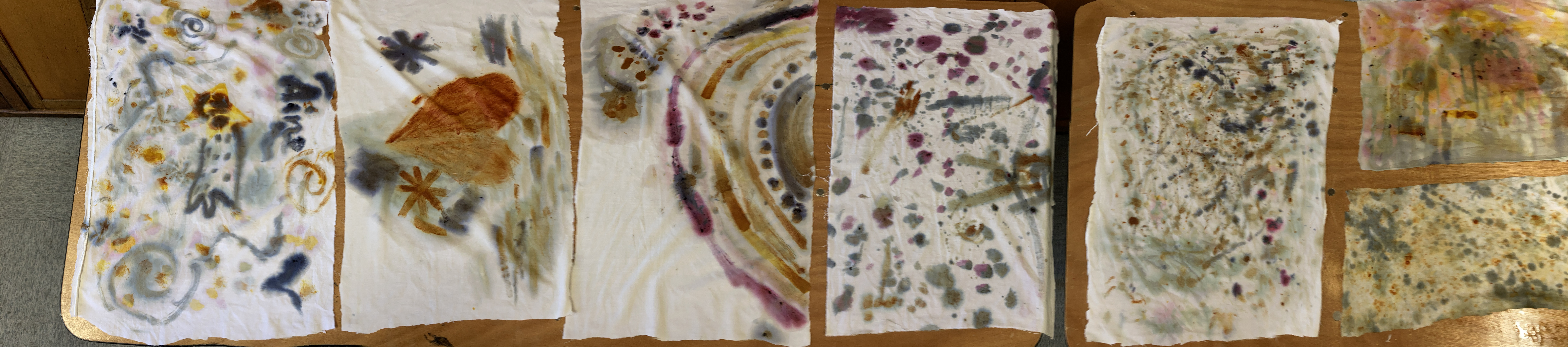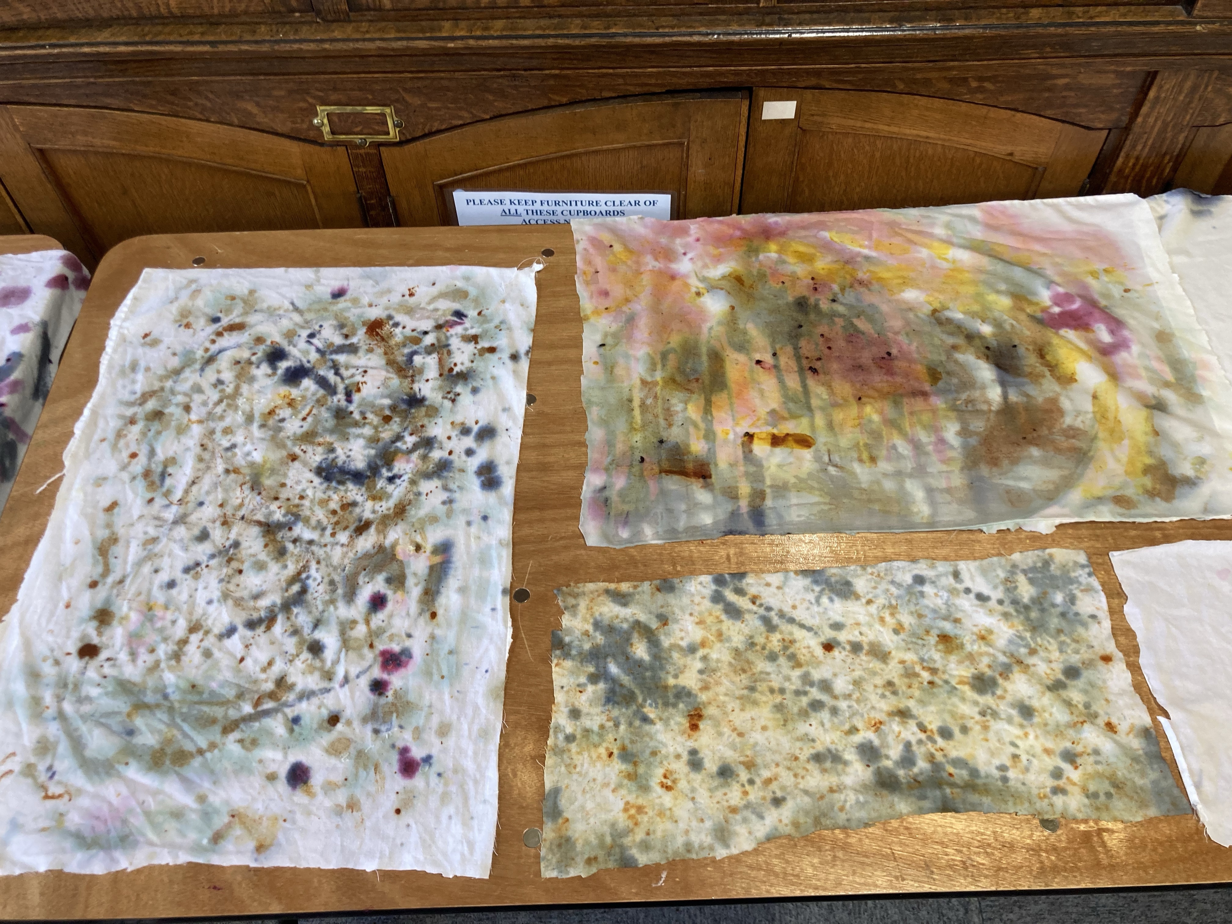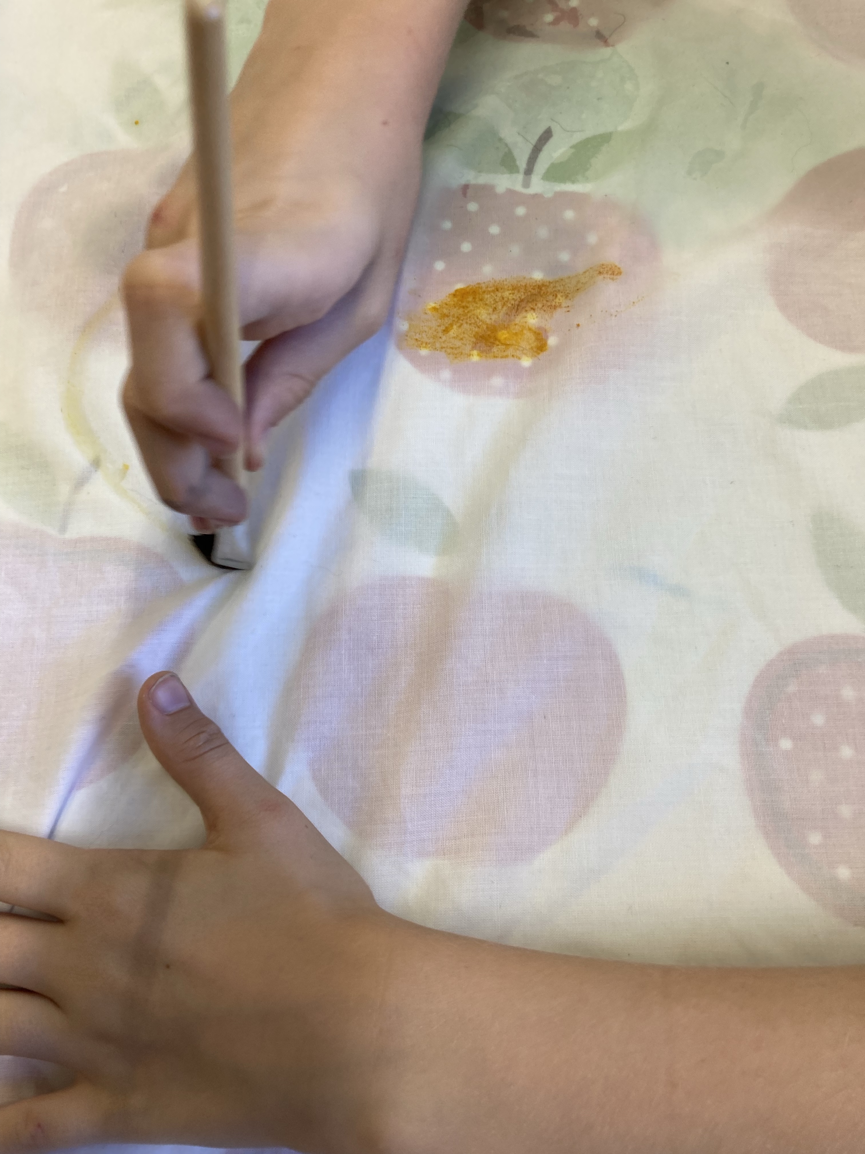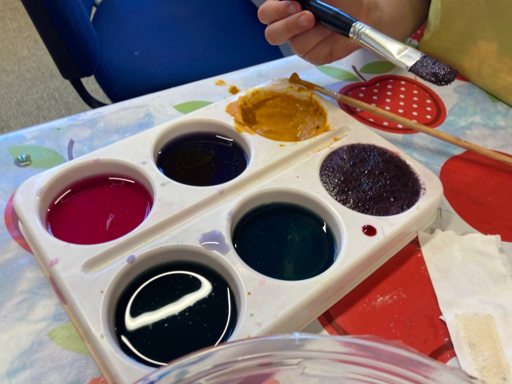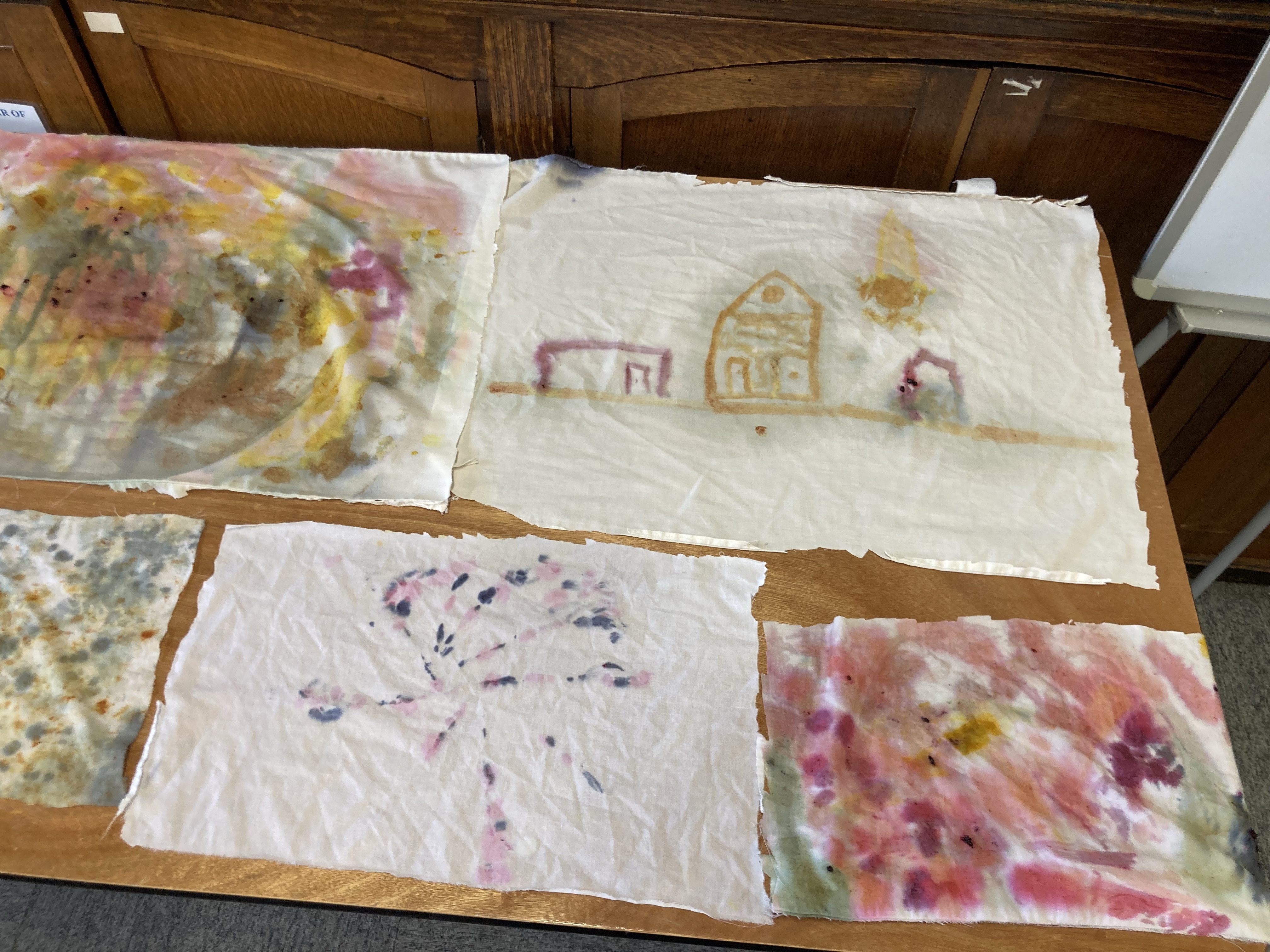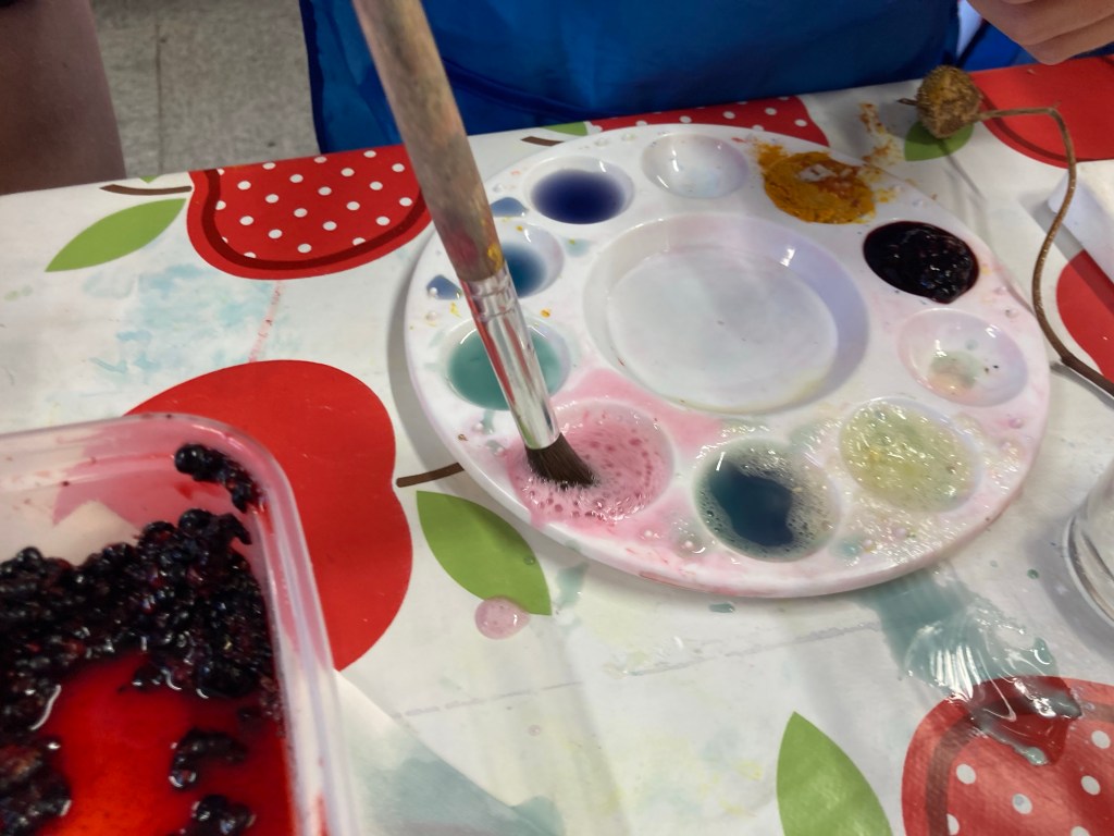 Today we had lots of fun exploring some of the natural dyes we can make using vegetables and berries that we can buy from the shops. We used red cabbage, blackberries, spinach and turmeric to make our dyes.