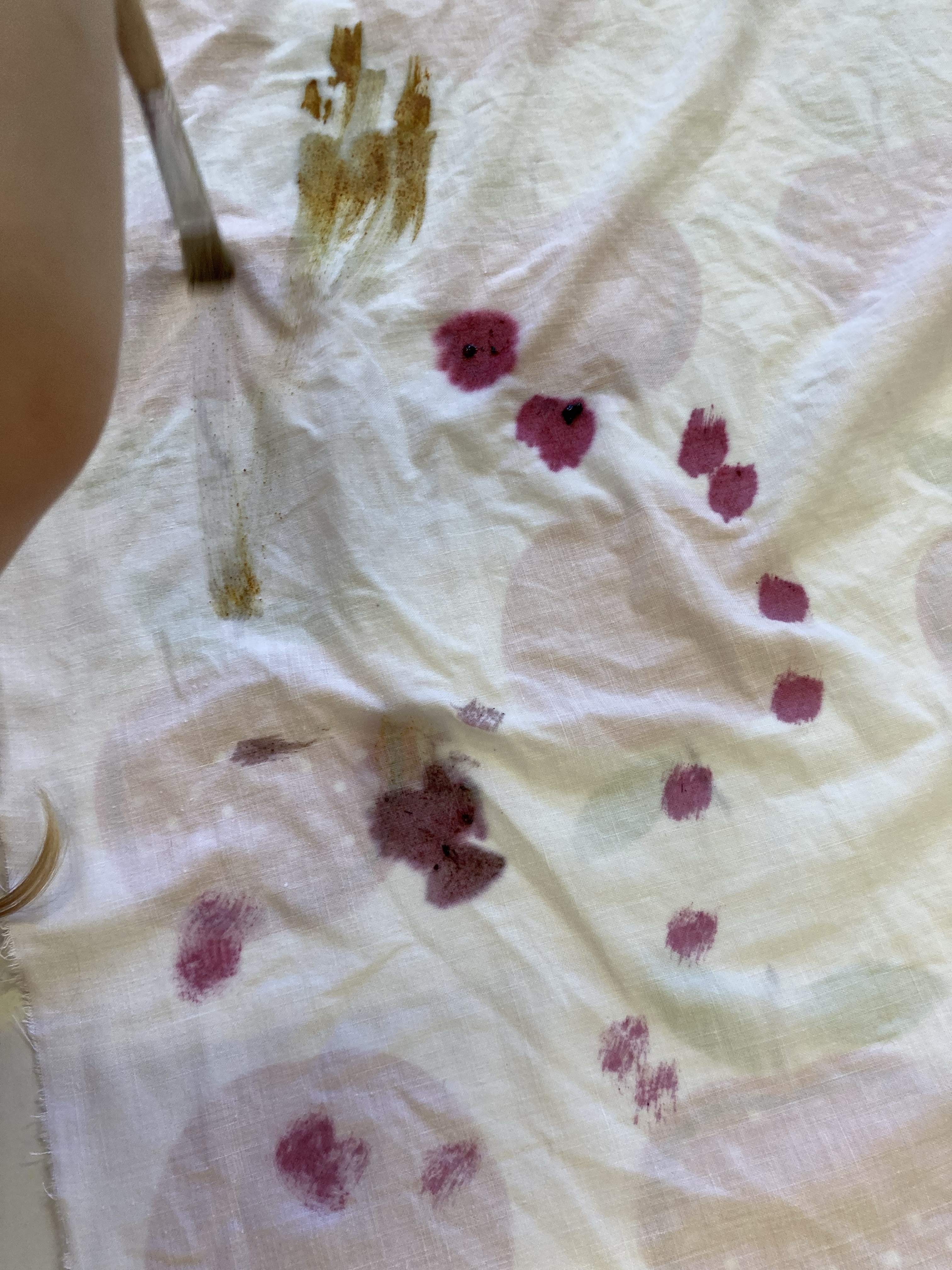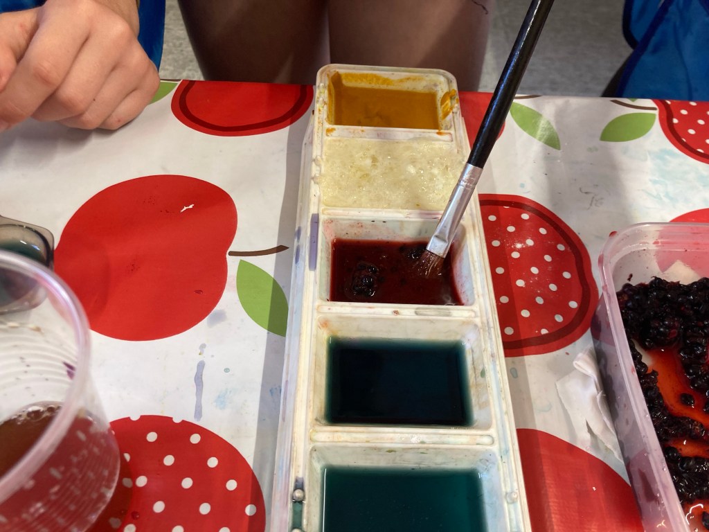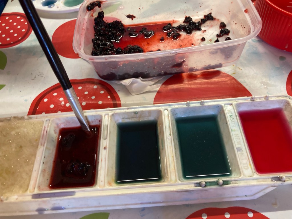 For the turmeric and blackberries we mashed them up and added water to form a colour paste. The turmeric made yellow and the blackberries made a dark red. With the spinach we soaked it in boiled water for 20 minutes to make green.