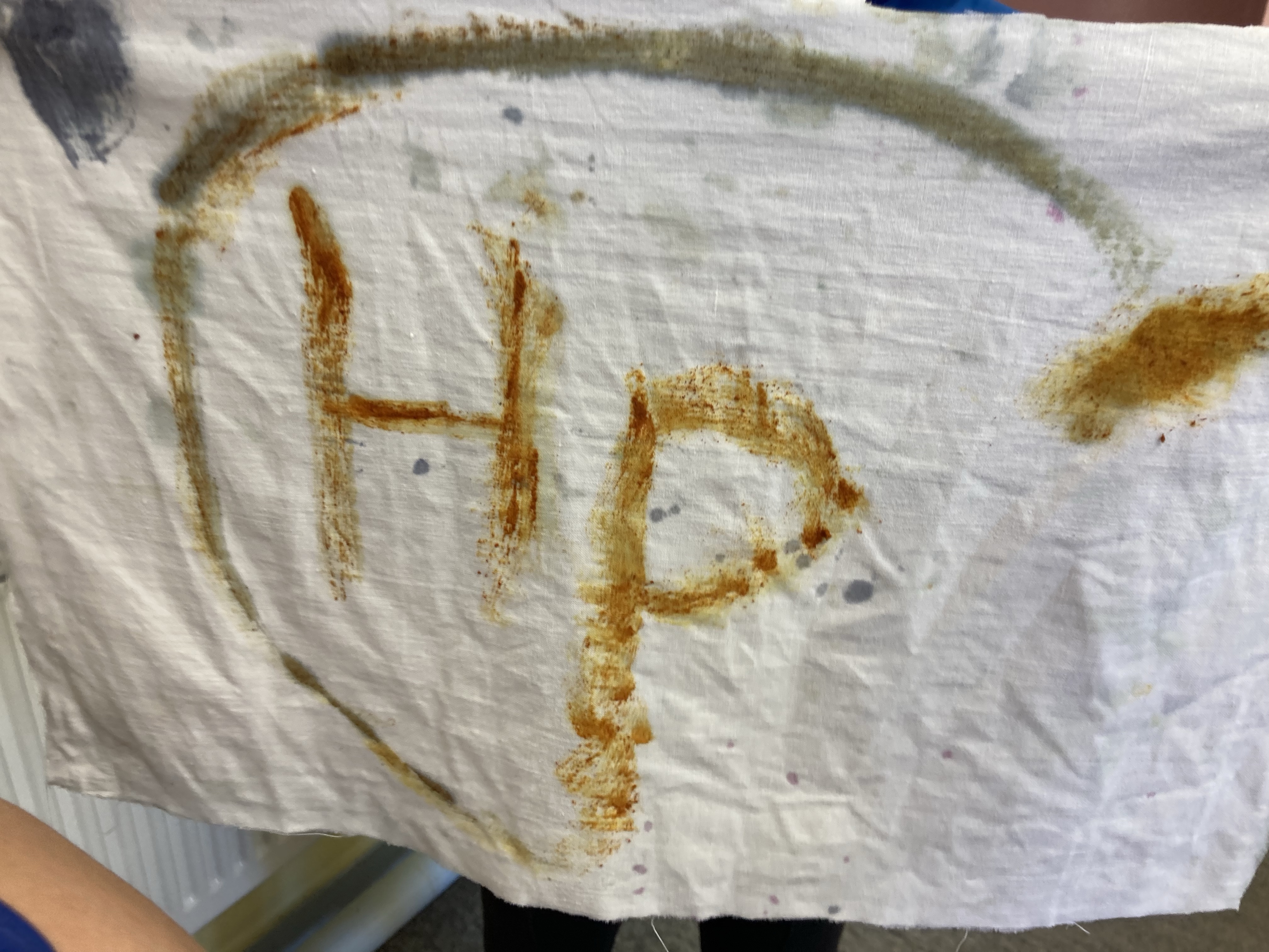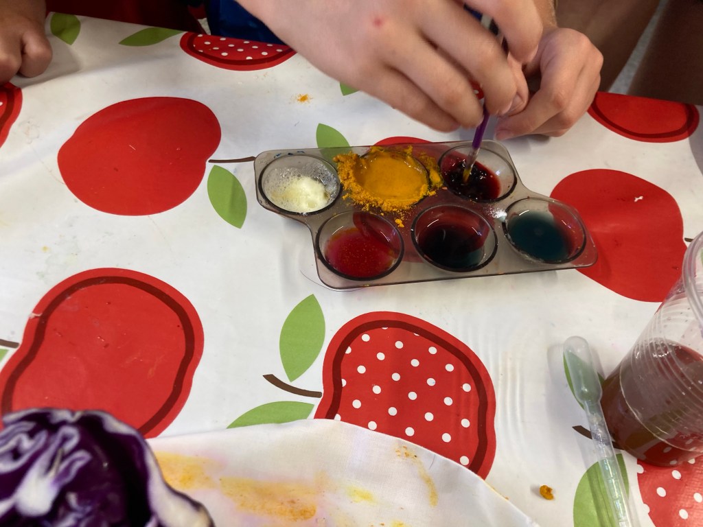We actually used the red cabbage to make three different colours thanks to a fun from science experiment! The dye we made boiling the cabbage for three hours was purple, when the children added bicarbonate of soda to the dye it turned green. They also experimented with adding lemon juice to the dye which turned it red. The colour of the dye is affected by how acidic or alkaline the solution is!