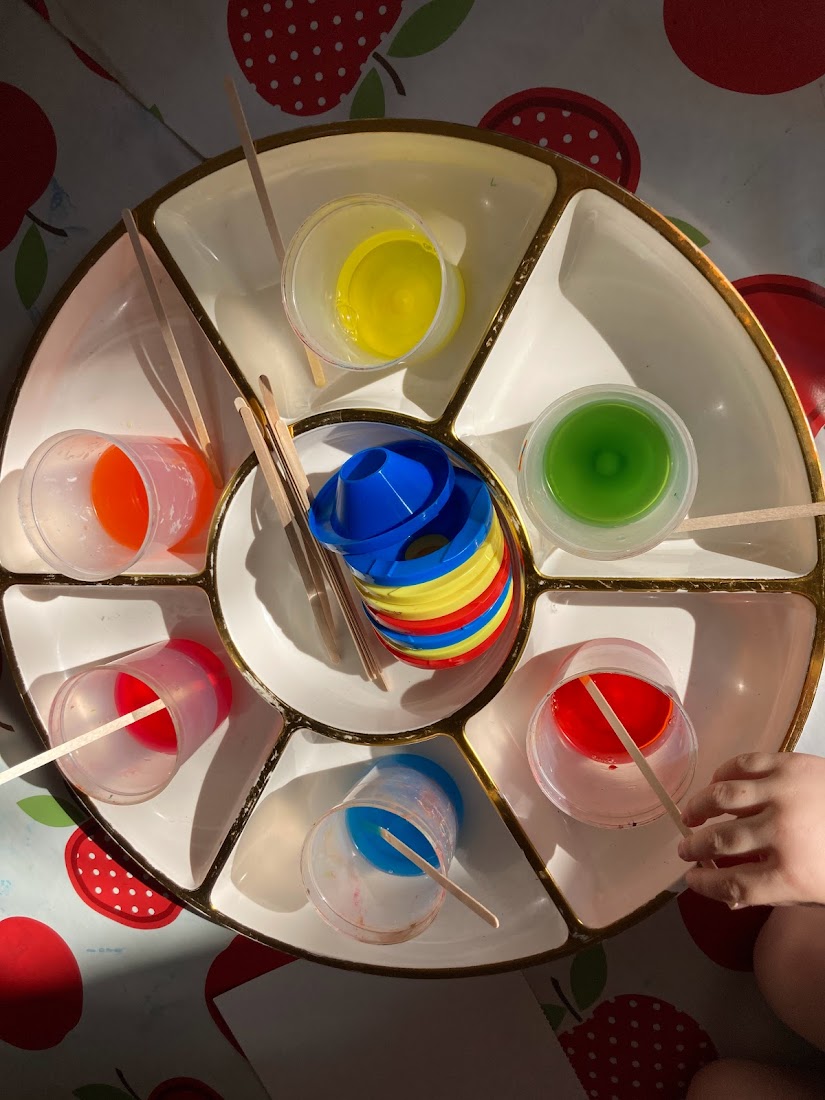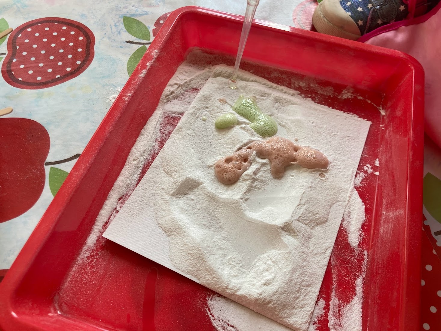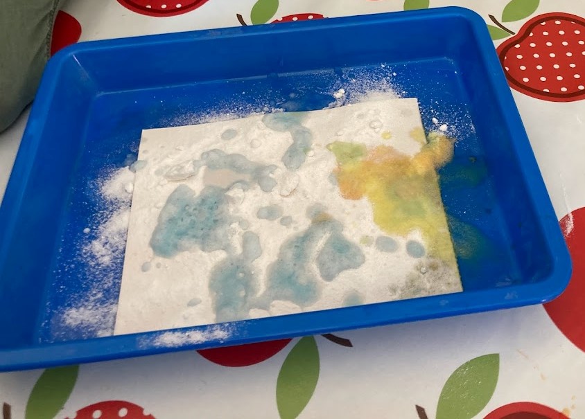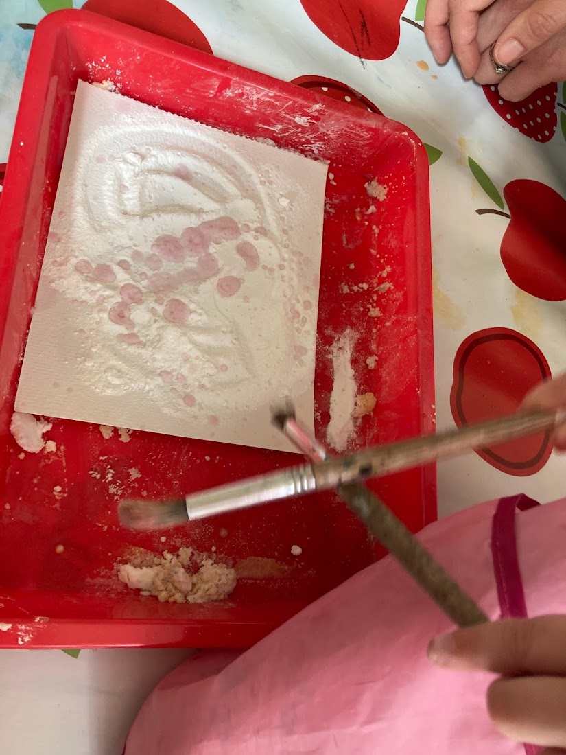 This week the children had lots of fun exploring fizzy painting. To make a fizzy painting you need bicarbonate of soda, plastic cups, distilled vinegar, food colouring, pipettes and water colour paper.