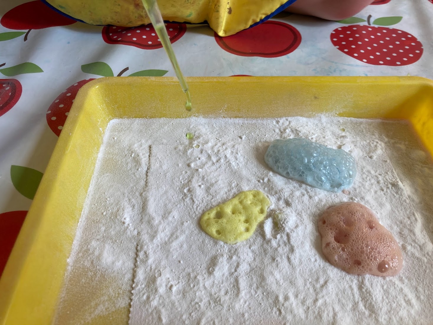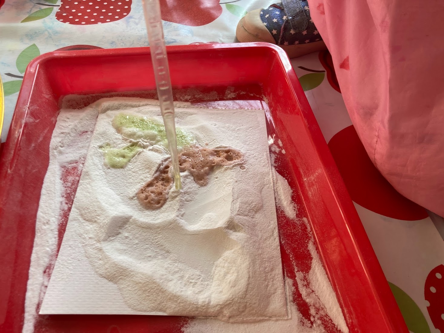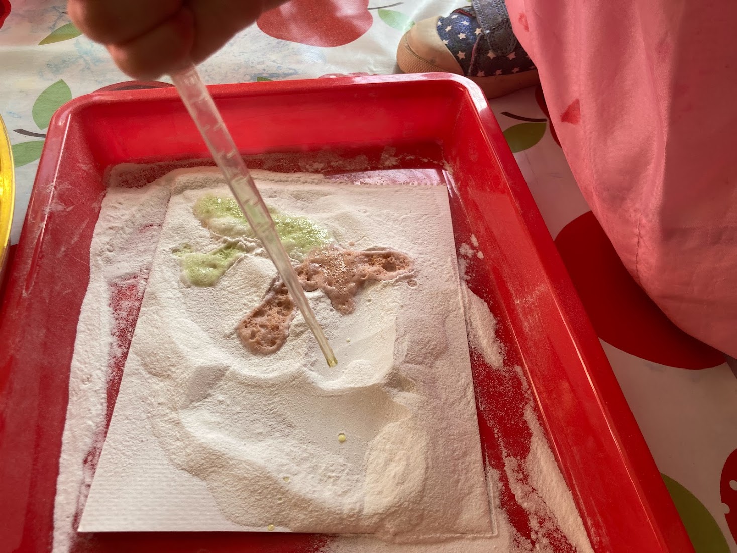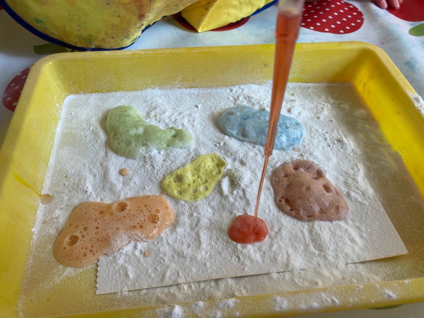 Next using the pipettes we added the colourful vinegar to the bicarbonate of soda. We watched it fizz and the colours mix as more were added.