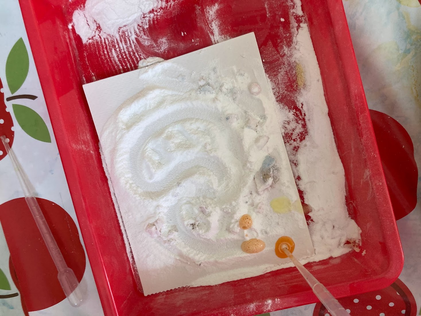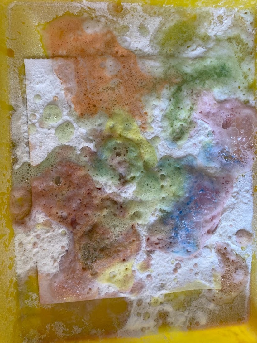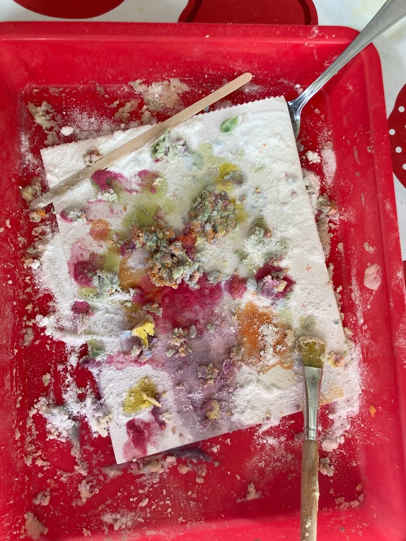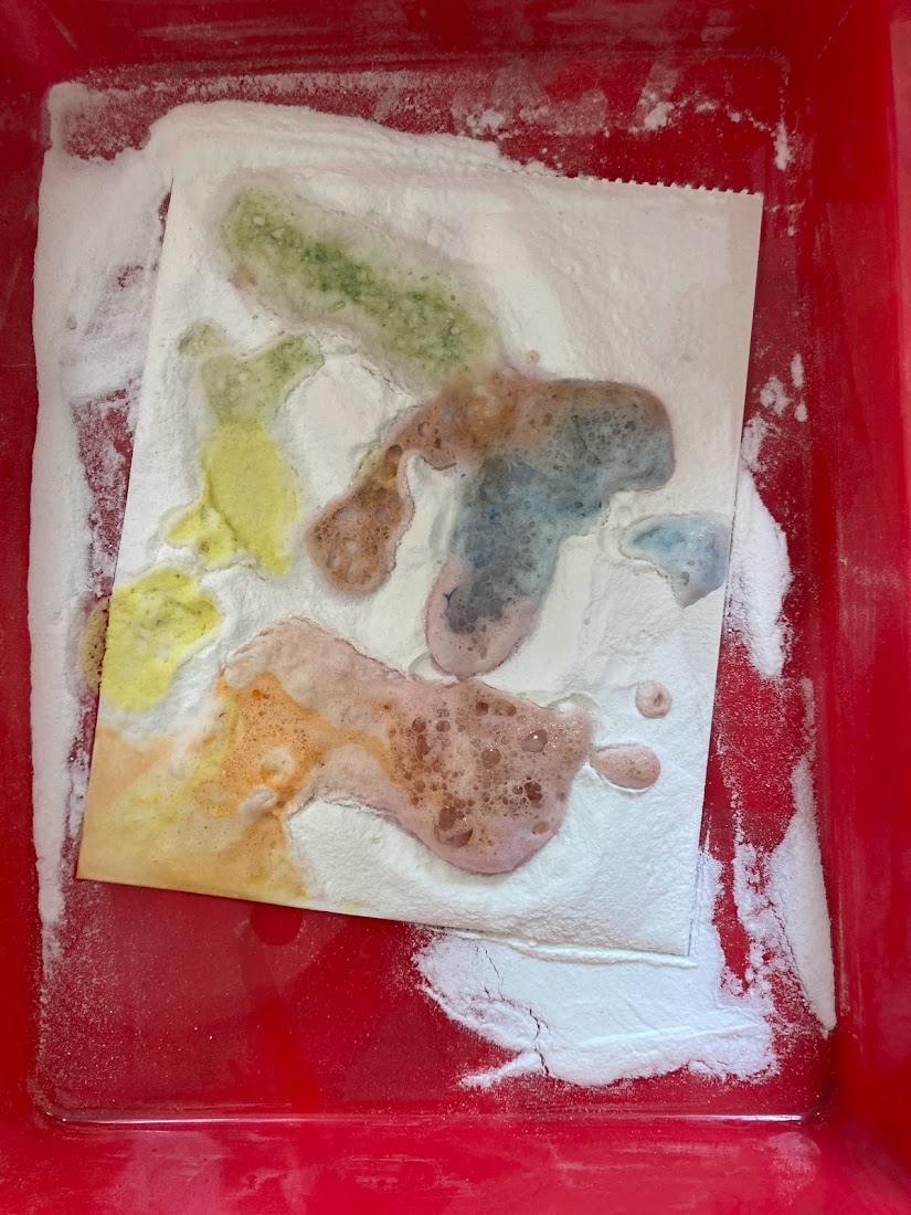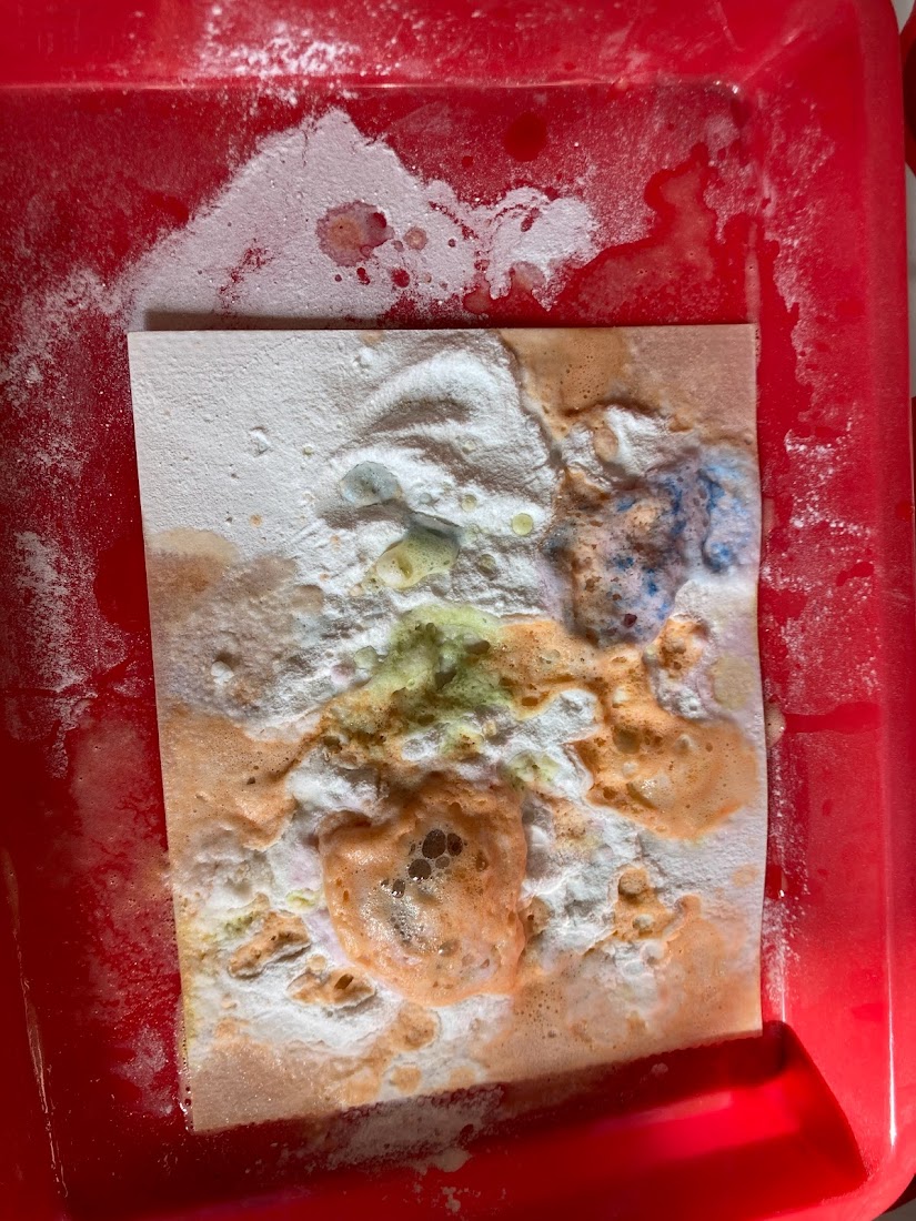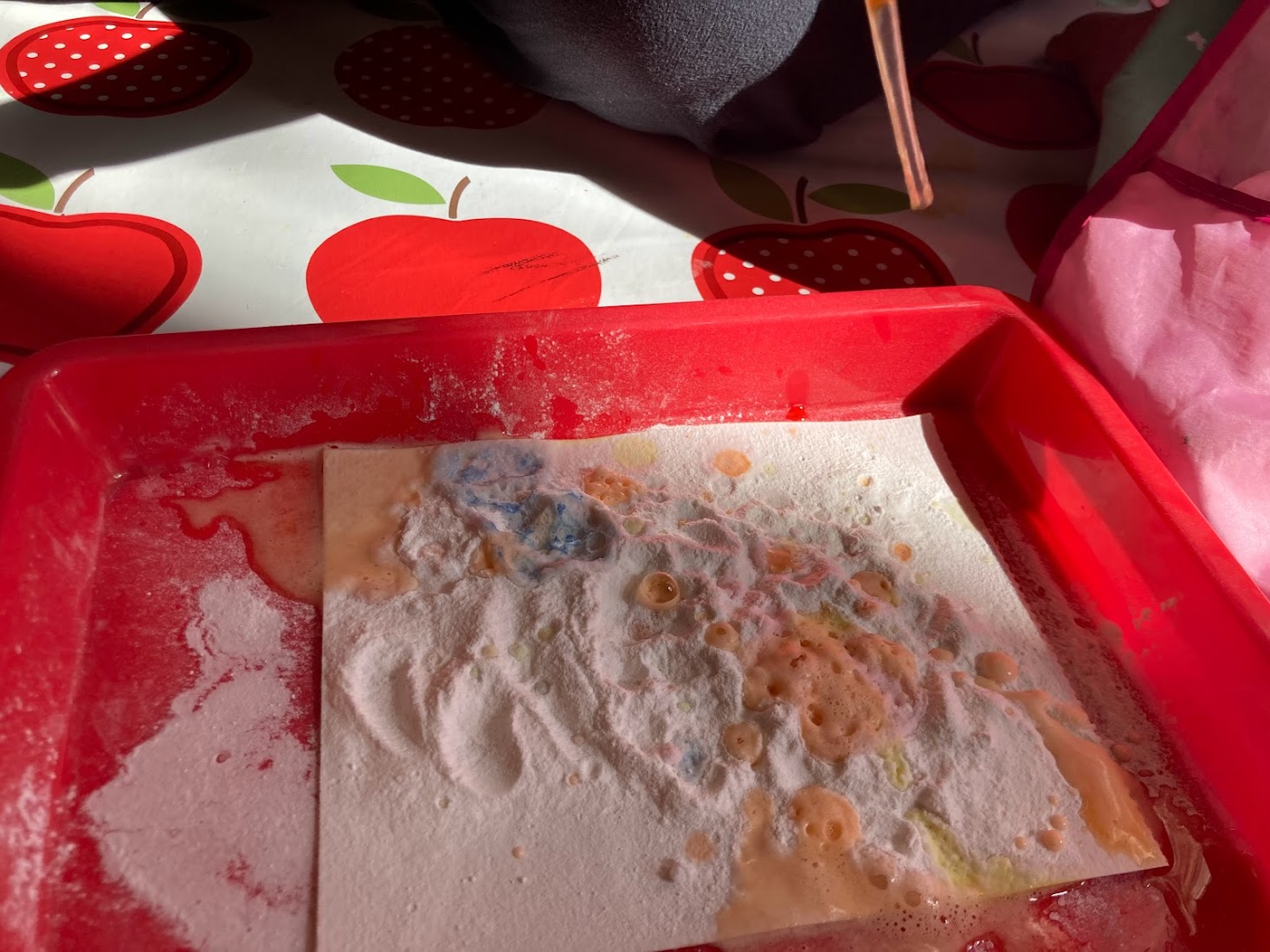 The first thing we did was mix food colouring with the distilled vinegar (the red, pink and orange look very similar in colour on the photo). We then sprinkled bicarbonate of soda on top of our watercolour paper.