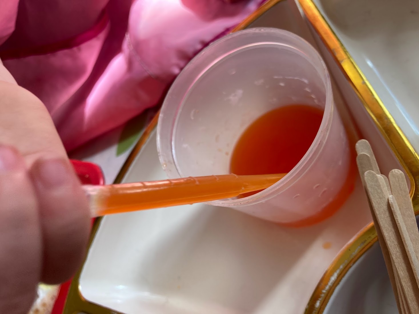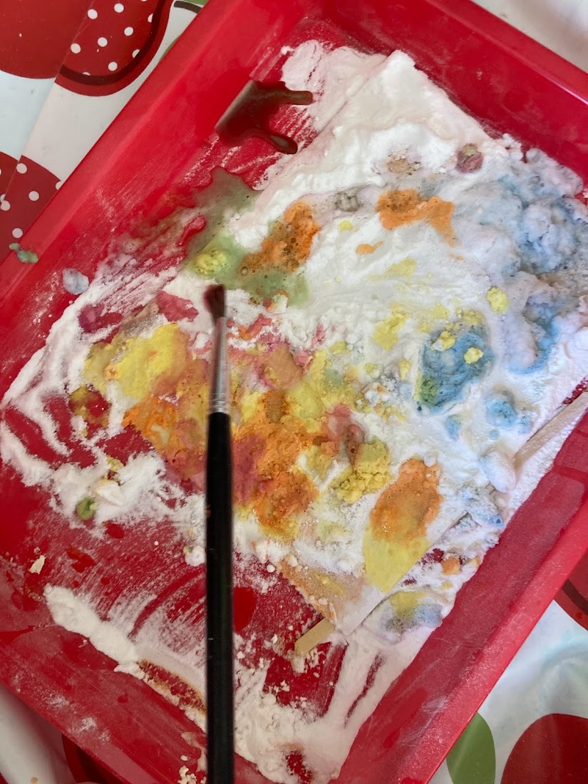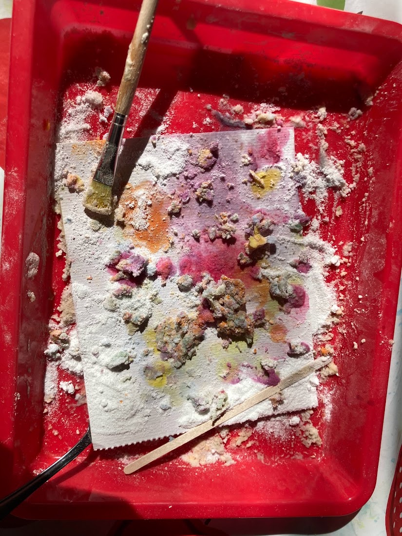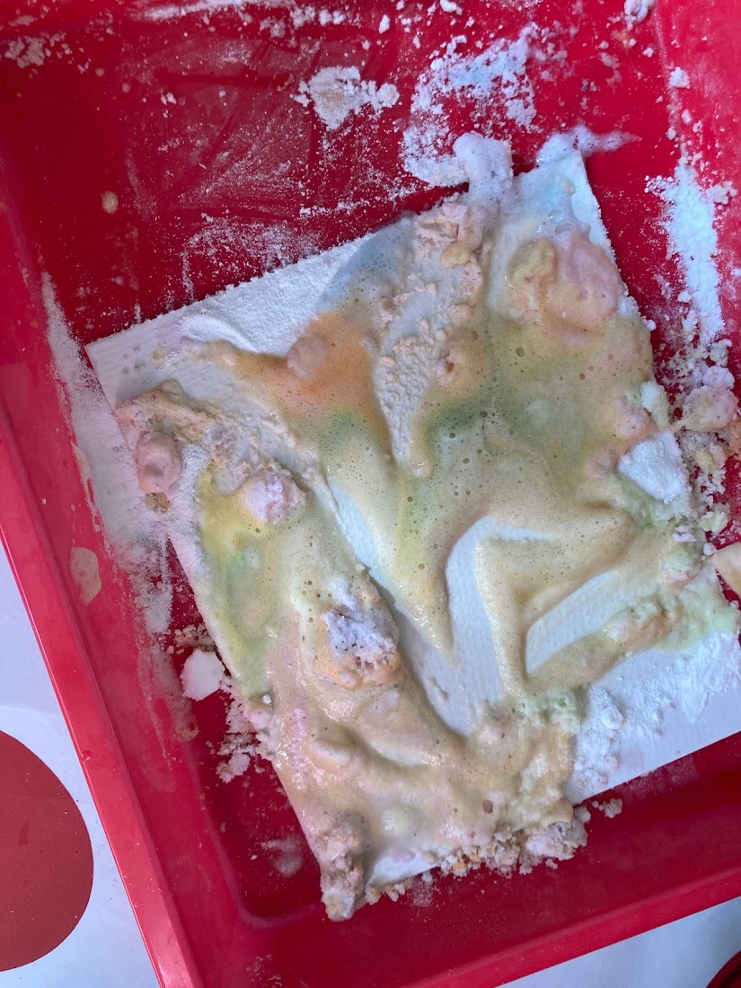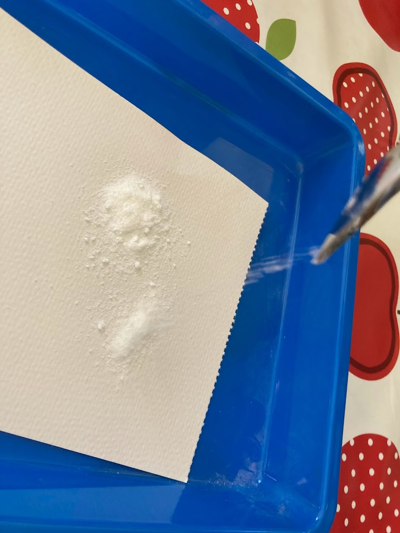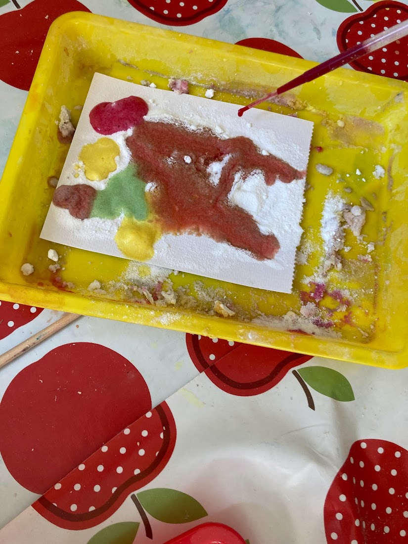 The first thing we did was mix food colouring with the distilled vinegar (the red, pink and orange look very similar in colour on the photo). We then sprinkled bicarbonate of soda on top of our watercolour paper.