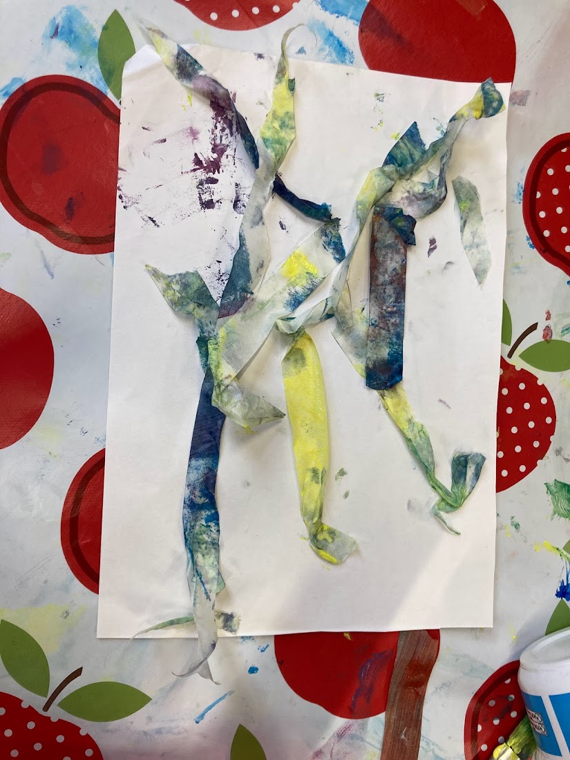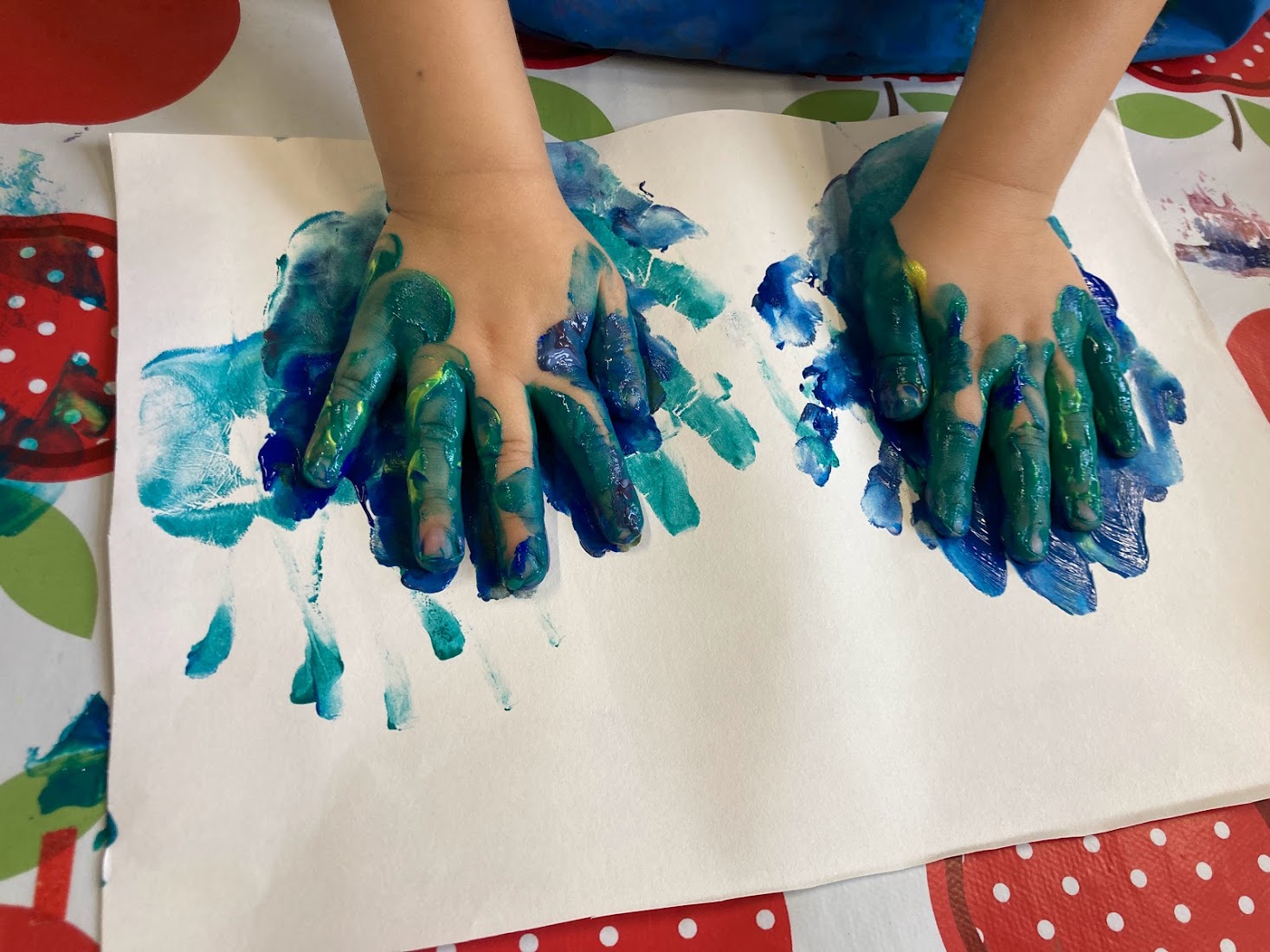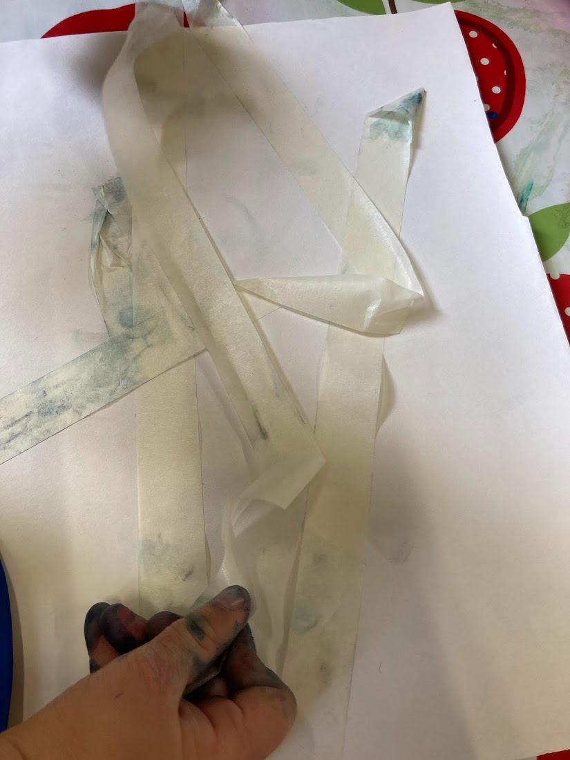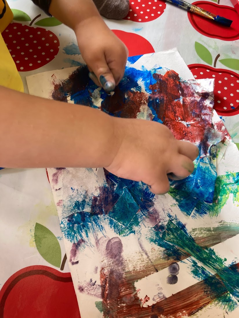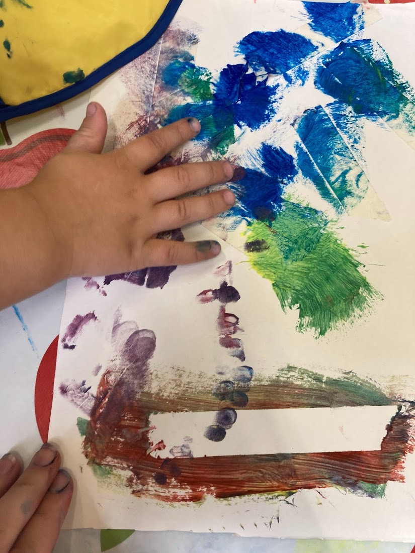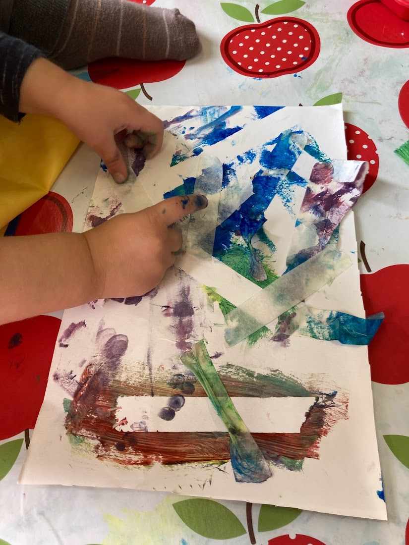 This week our Toddler group had lots of fun exploring the texture of paint with their hands and experimenting with tape resist painting! We also had brushes available for anyone who was worried about touching the paint at first. In the end everyone enjoyed getting stuck in and loved peeling the masking tape off and putting it back on the paper to paint over again.