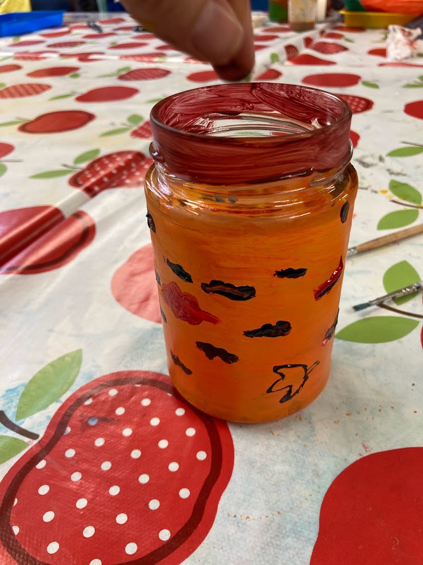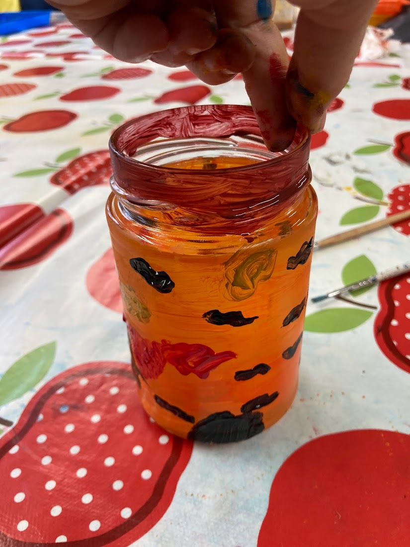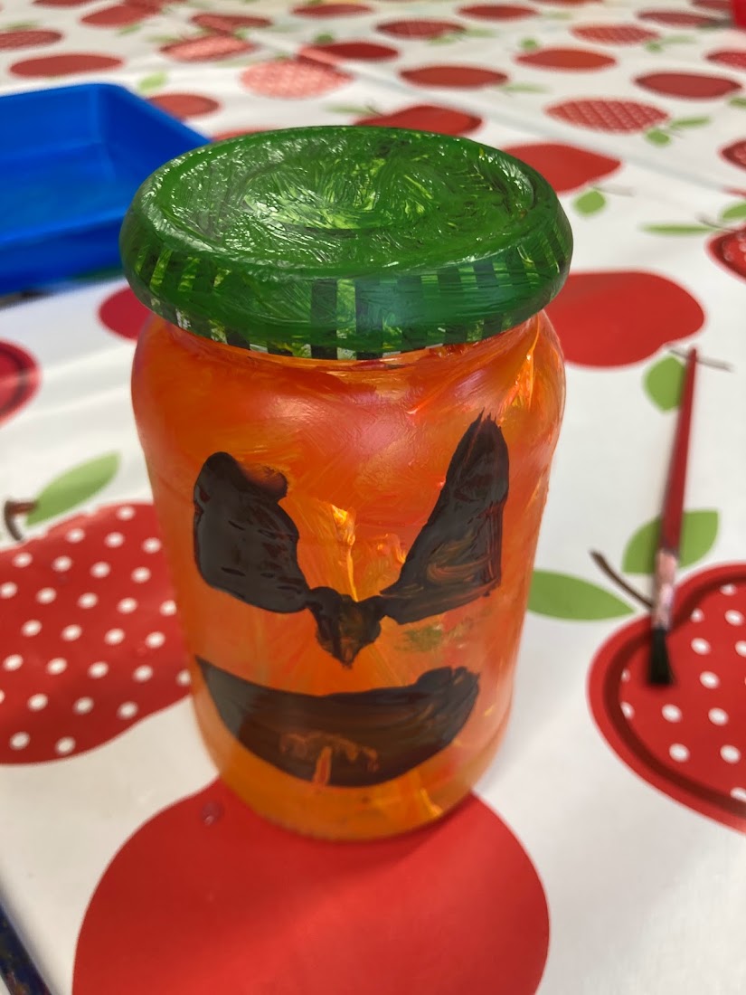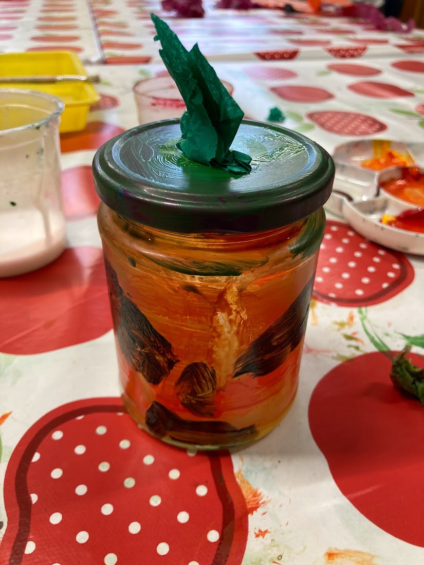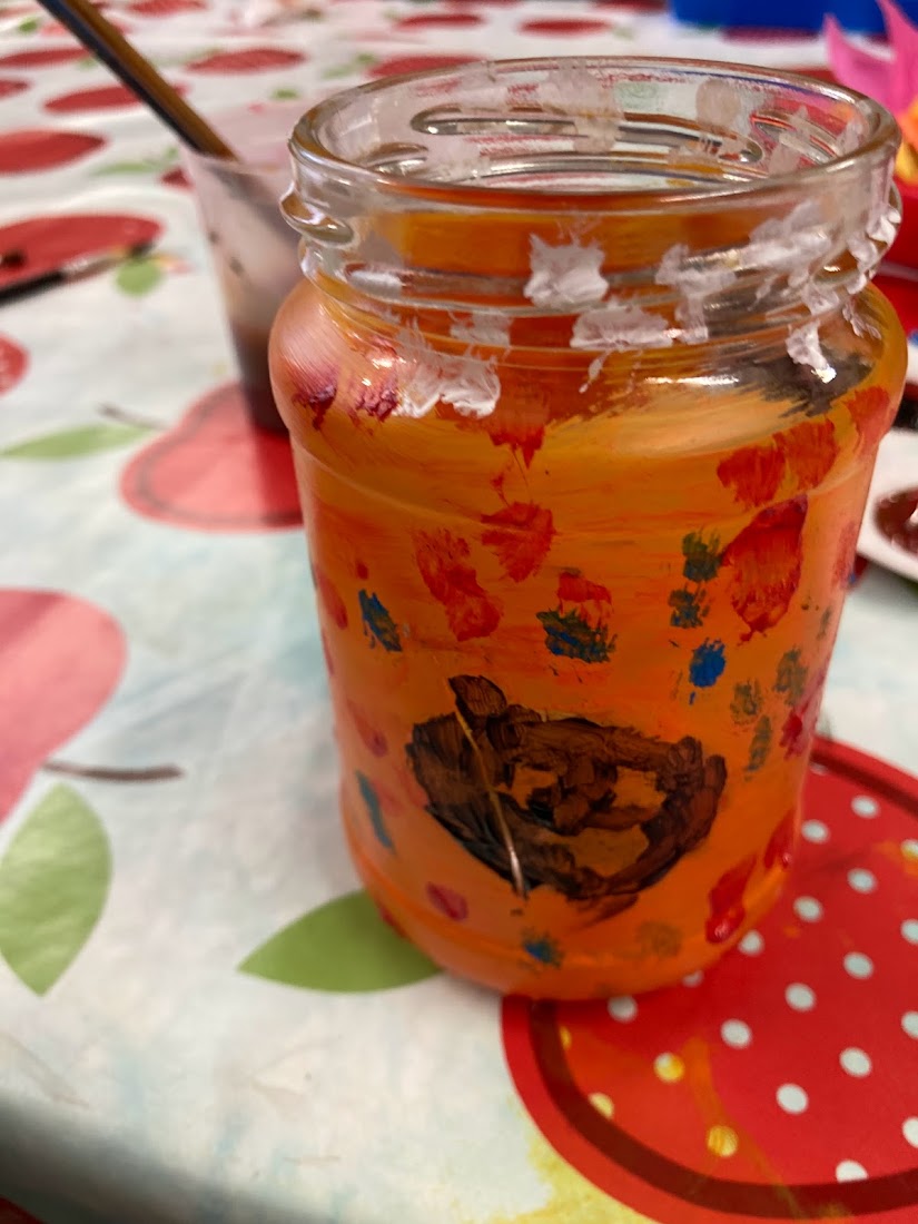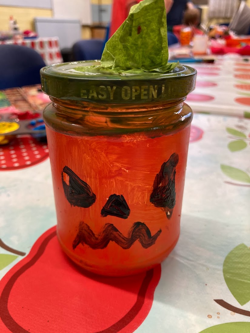 The children were given the option of making Halloween themed lanterns if they wanted to instead of autumn themed. Some of the lanterns had different pictures on each side of the lantern, the pumpkin lanterns were all orange except for their front and a couple of the lanterns had a repeating pattern on all sides. One child made a Bonfire lantern, they painted the jar and then stuck leaves all over it.