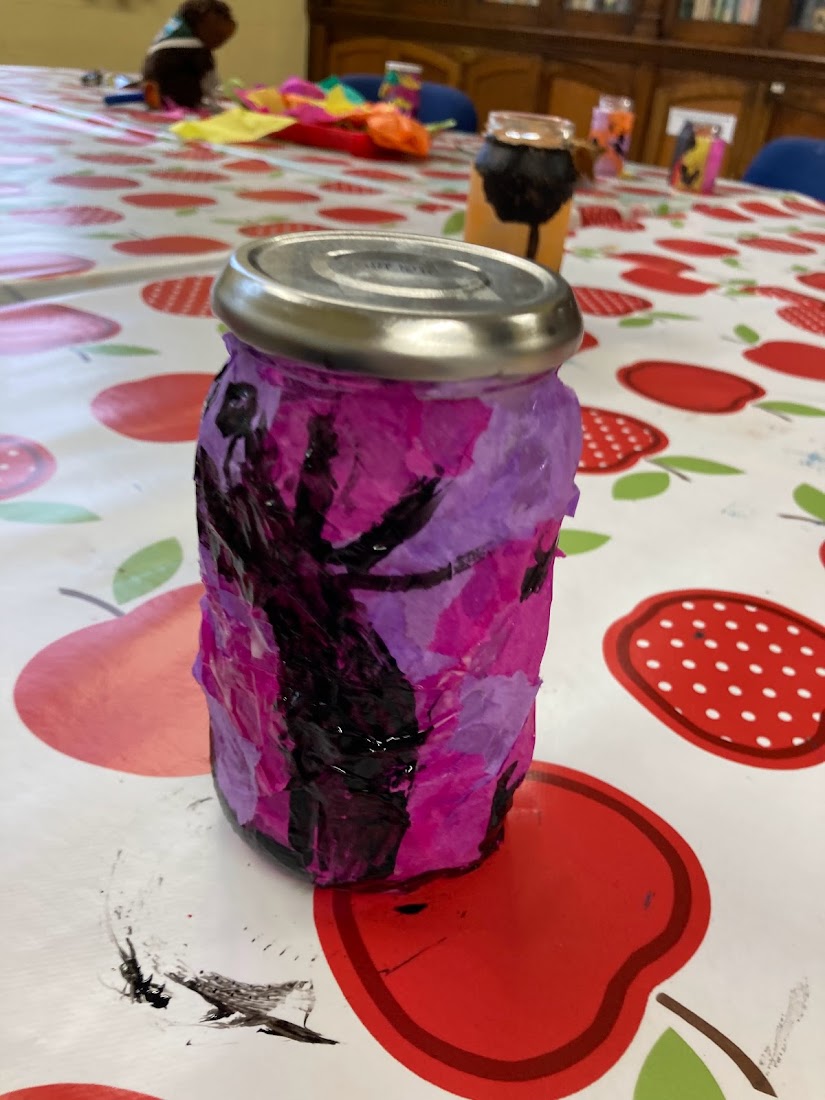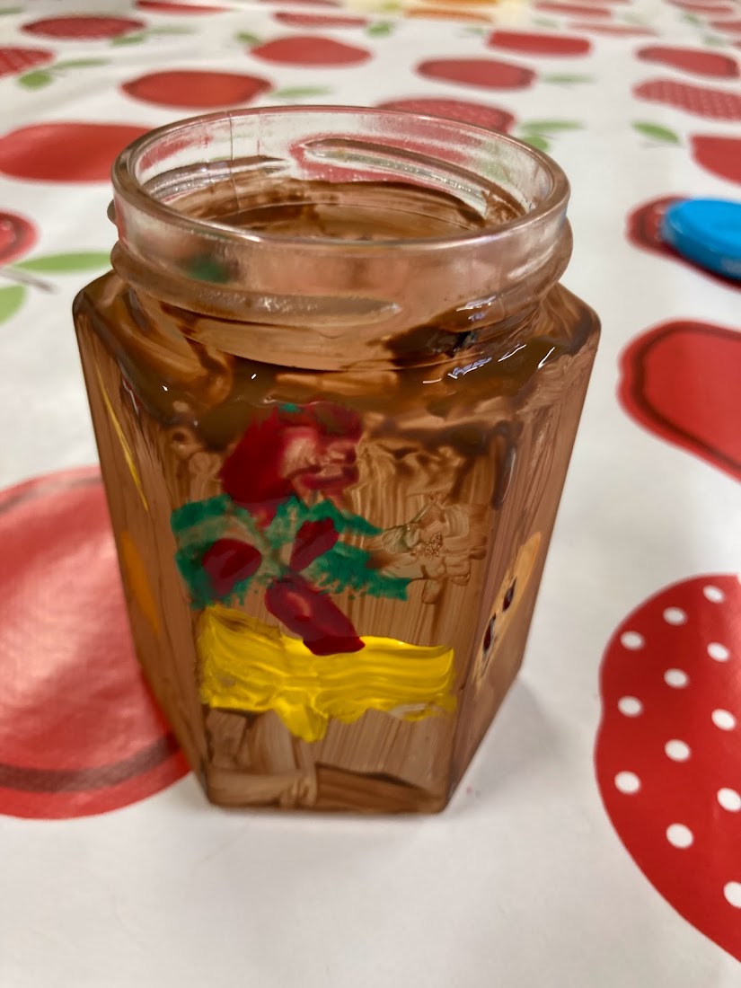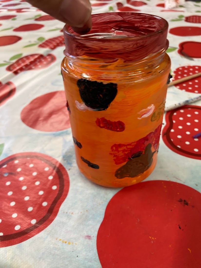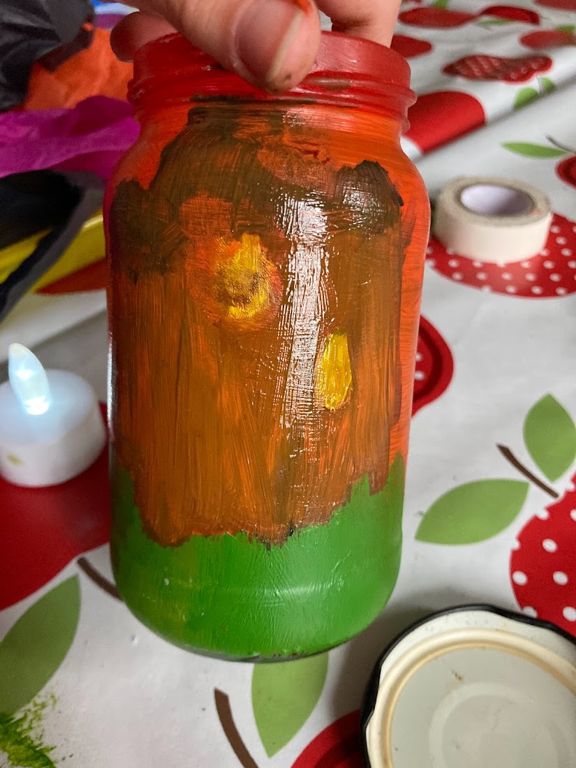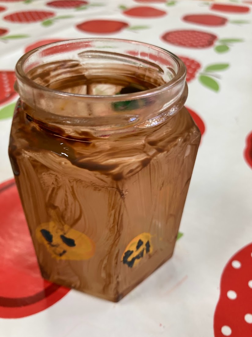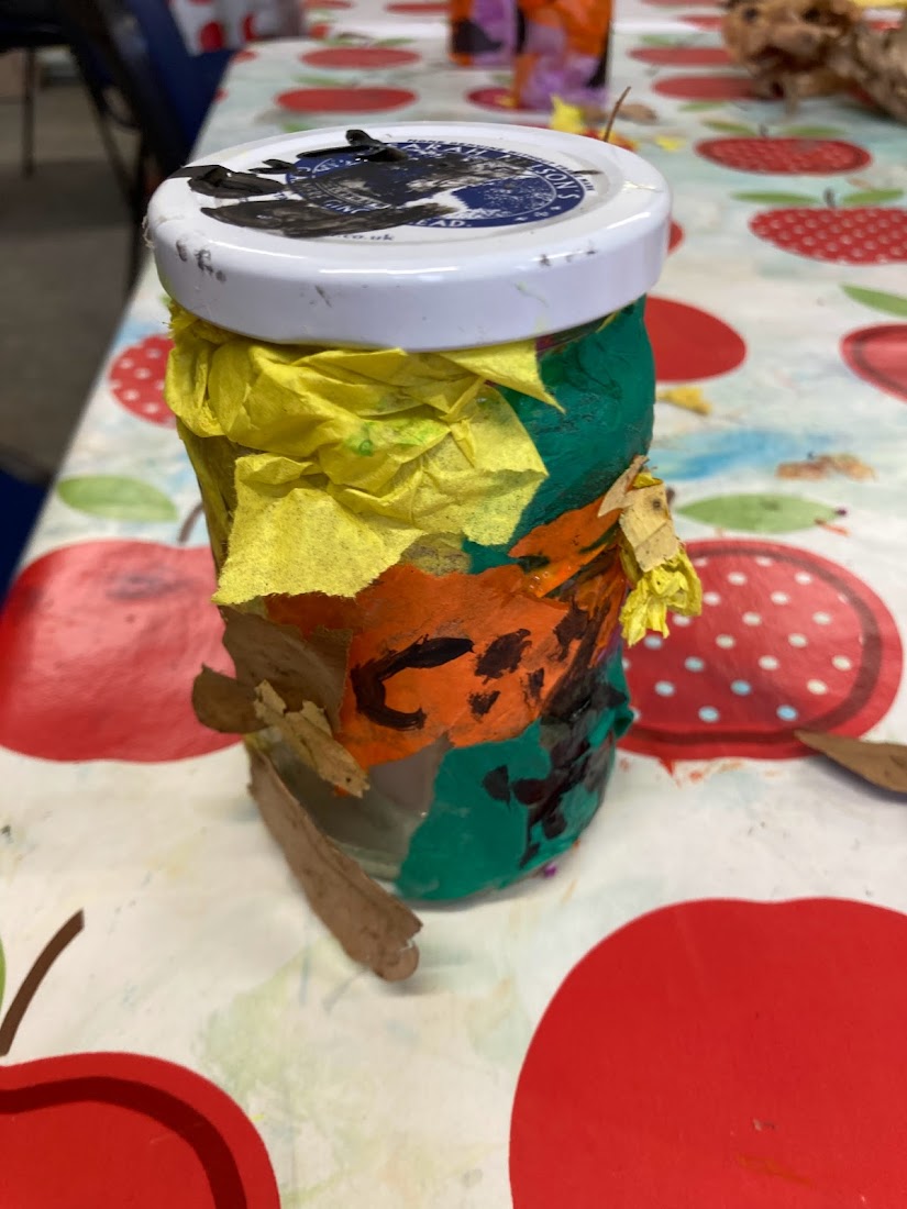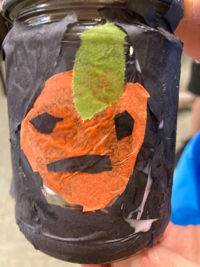 The children were given the option of making Halloween themed lanterns if they wanted to instead of autumn themed. Some of the lanterns had different pictures on each side of the lantern, the pumpkin lanterns were all orange except for their front and a couple of the lanterns had a repeating pattern on all sides. One child made a Bonfire lantern, they painted the jar and then stuck leaves all over it.