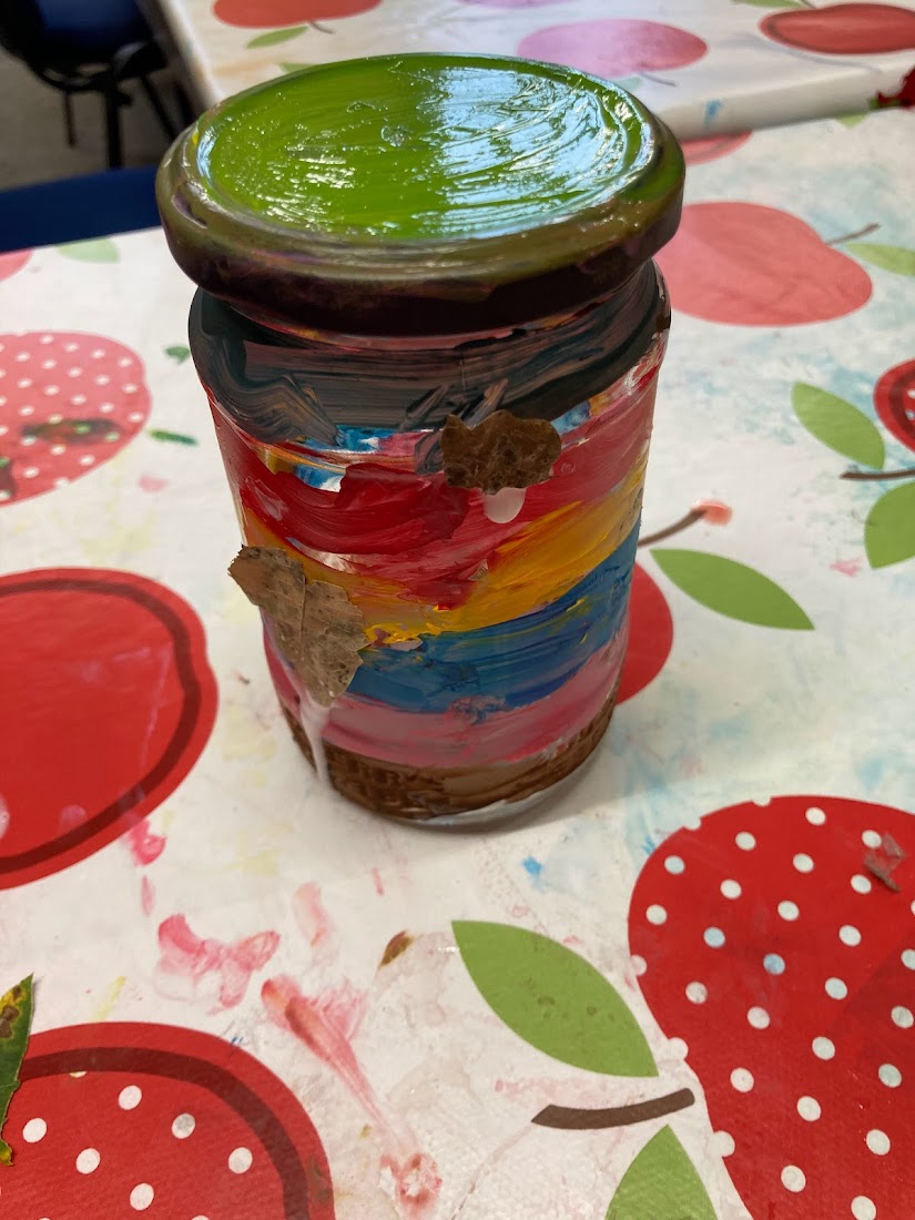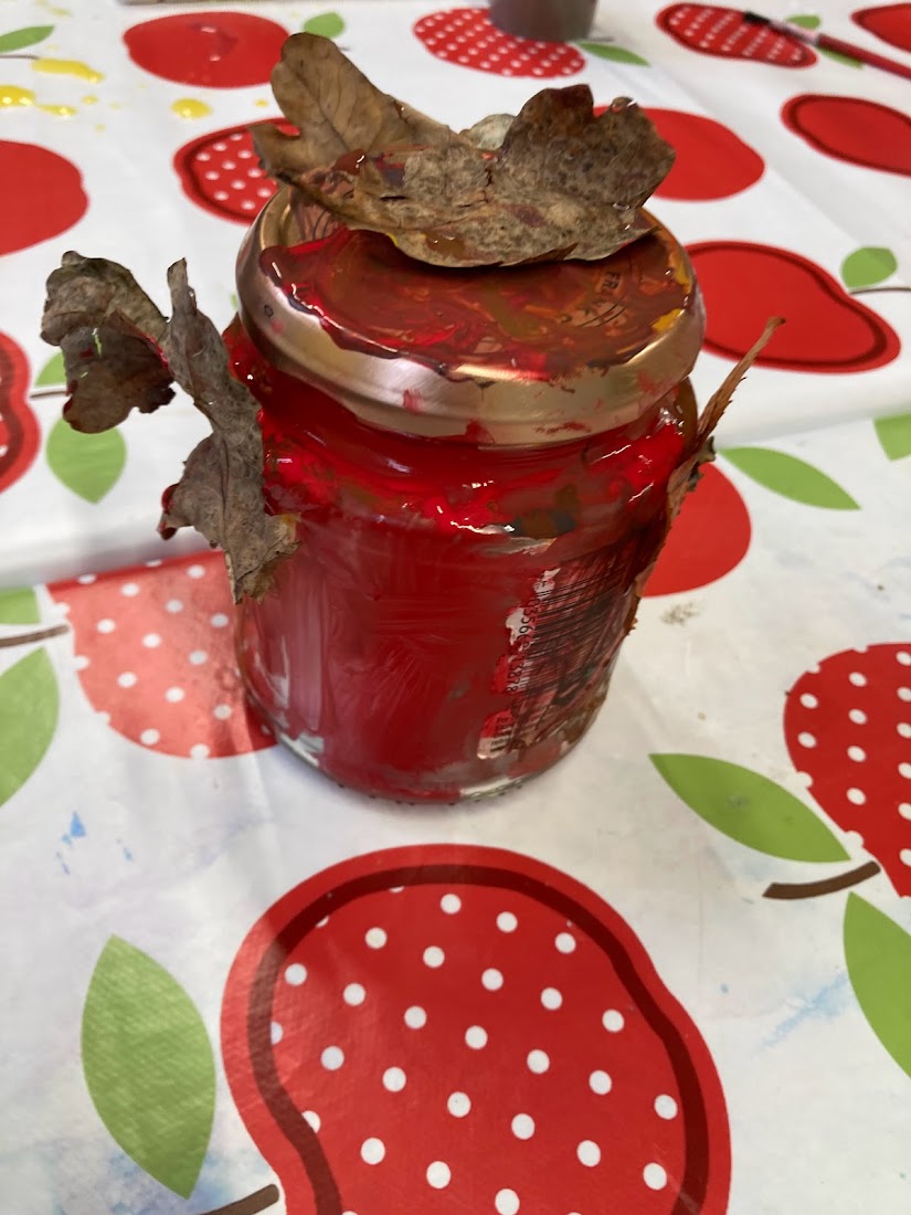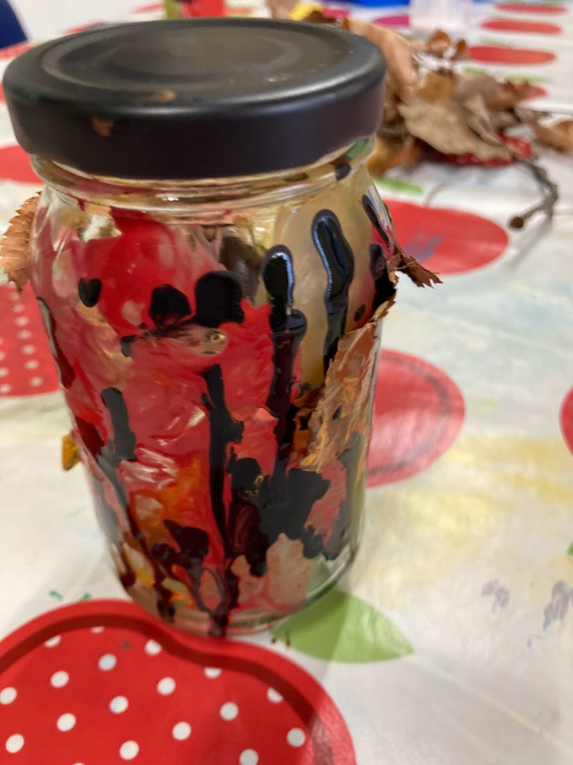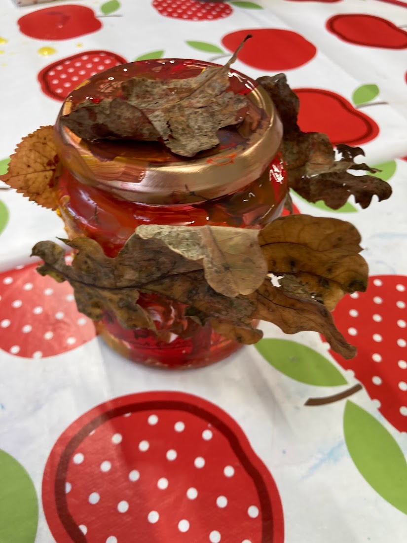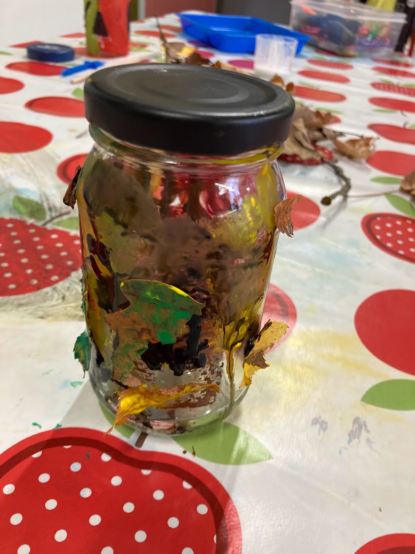 This week our 4-9 year olds have been making some Autumnal Lanterns using recycled jam jars, acrylic paint, tissue paper, leaves, glue and tea light candles. We had a battery operated candle available so we can test out the lanterns before taking them home.