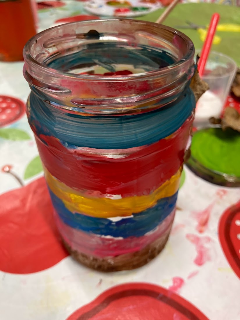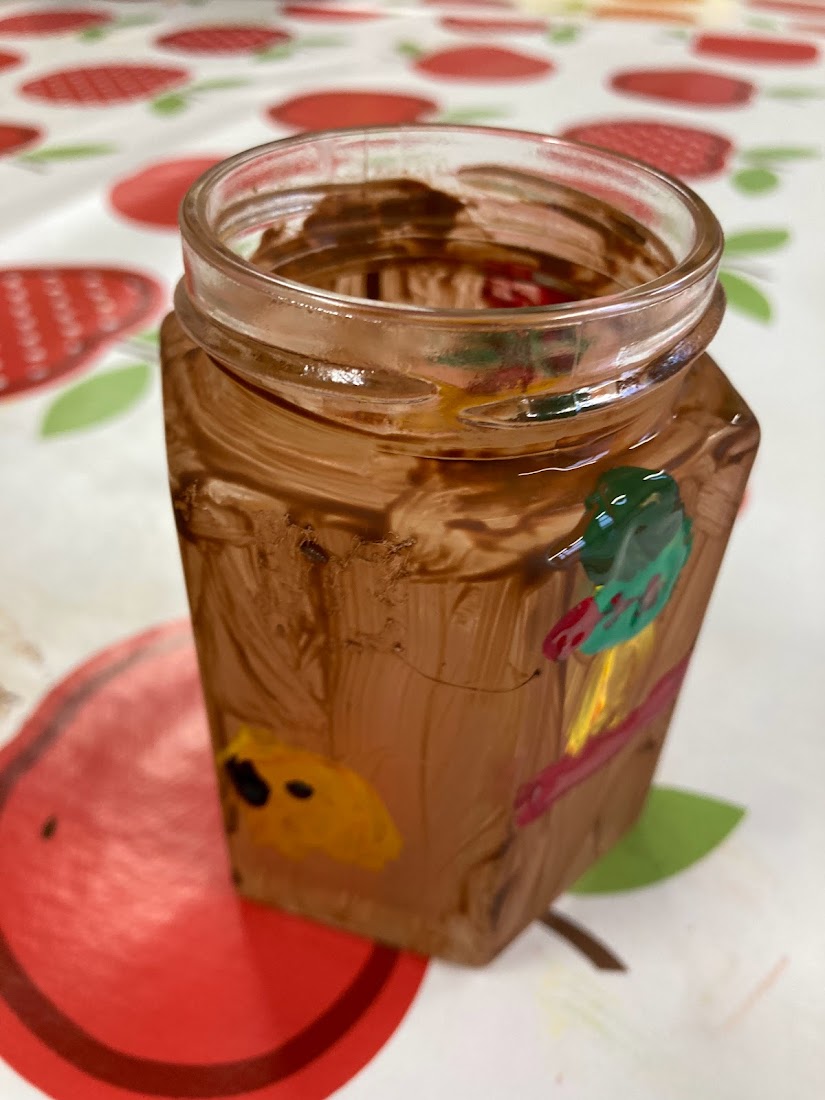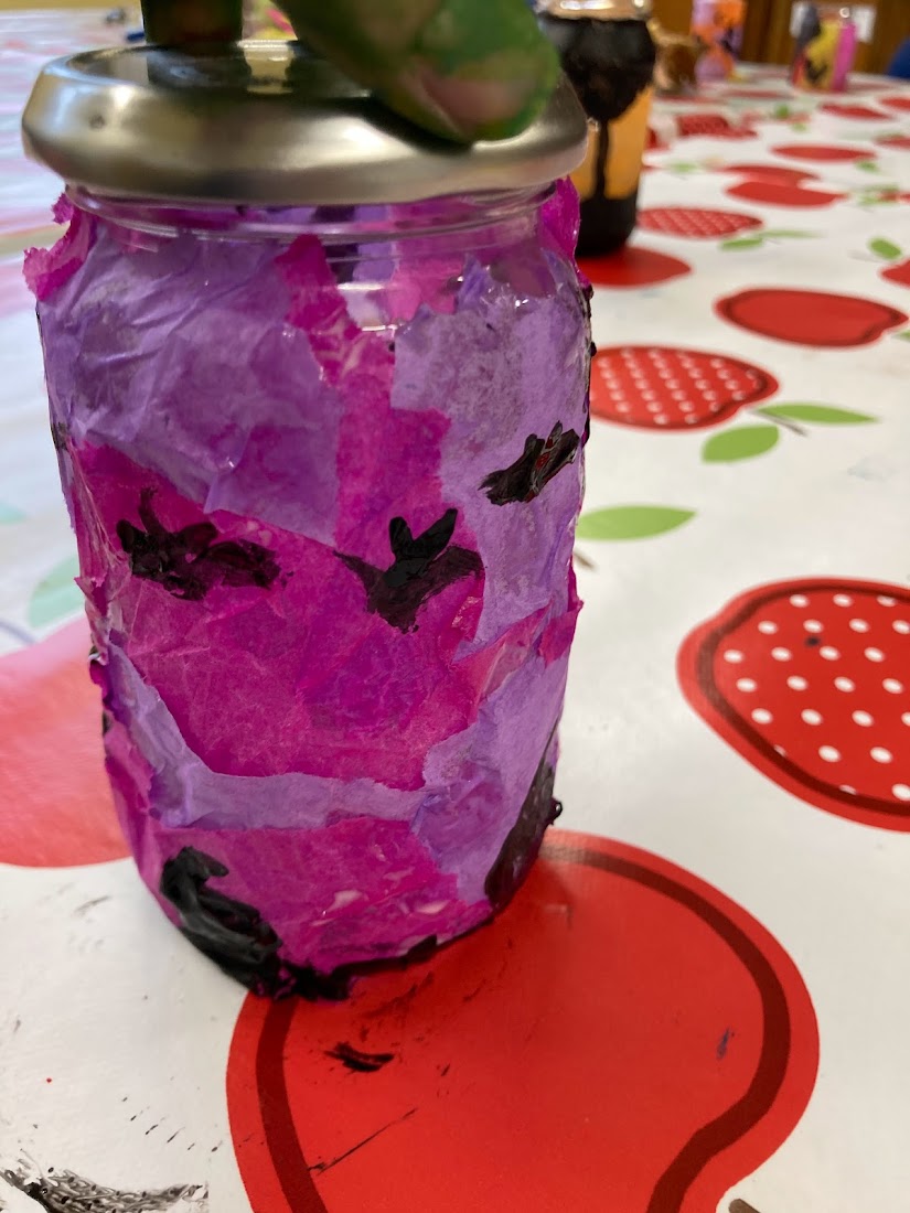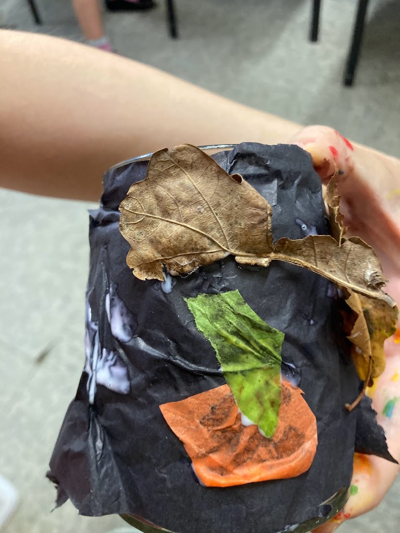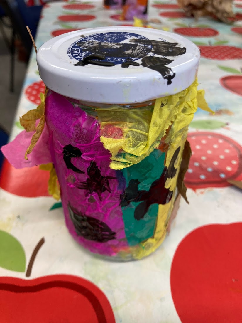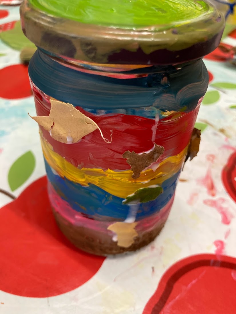 This week our 4-9 year olds have been making some Autumnal Lanterns using recycled jam jars, acrylic paint, tissue paper, leaves, glue and tea light candles. We had a battery operated candle available so we can test out the lanterns before taking them home.