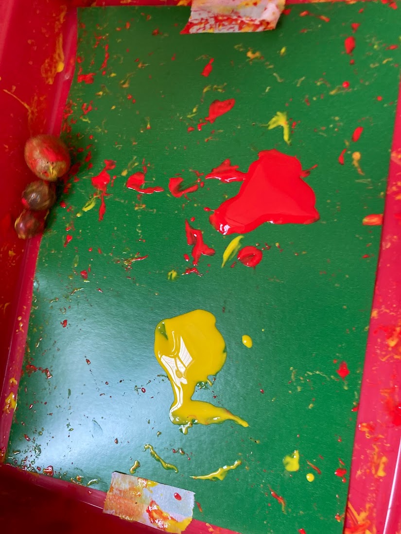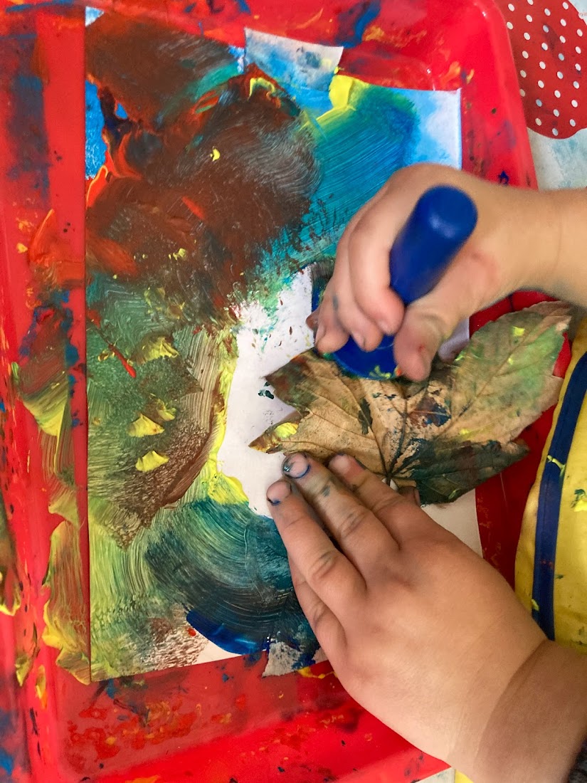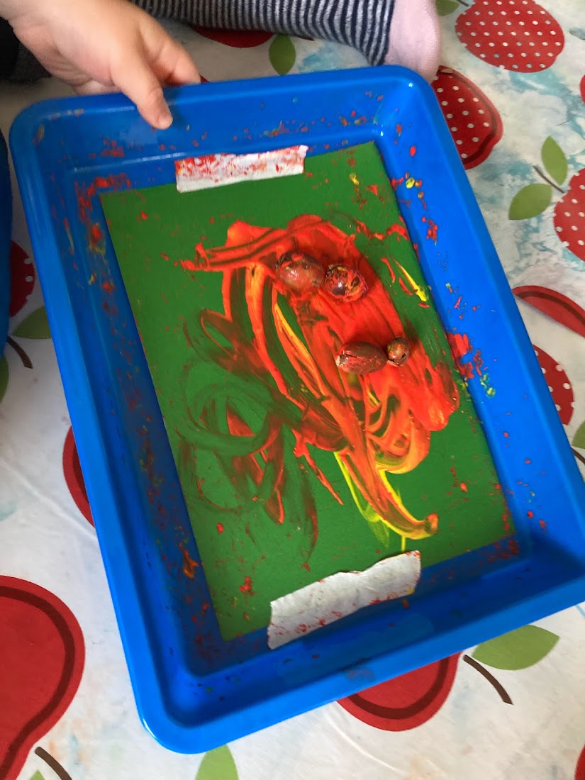 This week the toddlers have enjoyed exploring mark making with paint, acorns, pine cones, leaves and sponges.