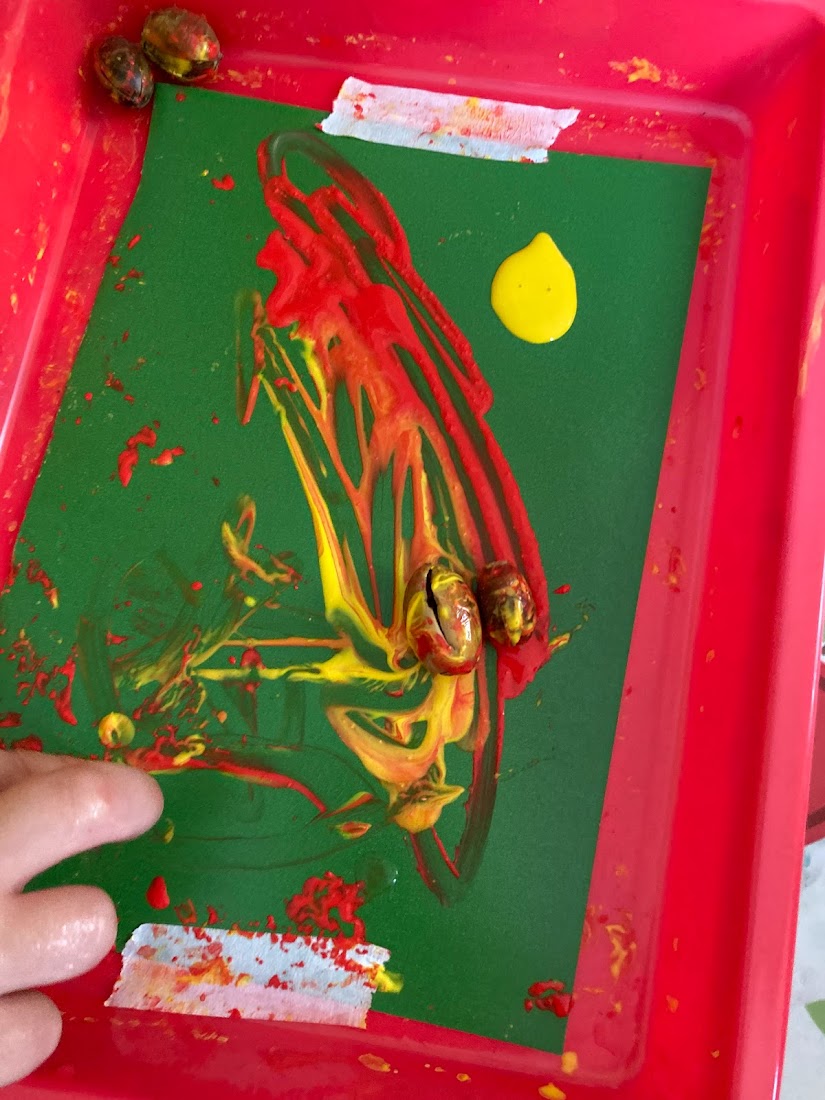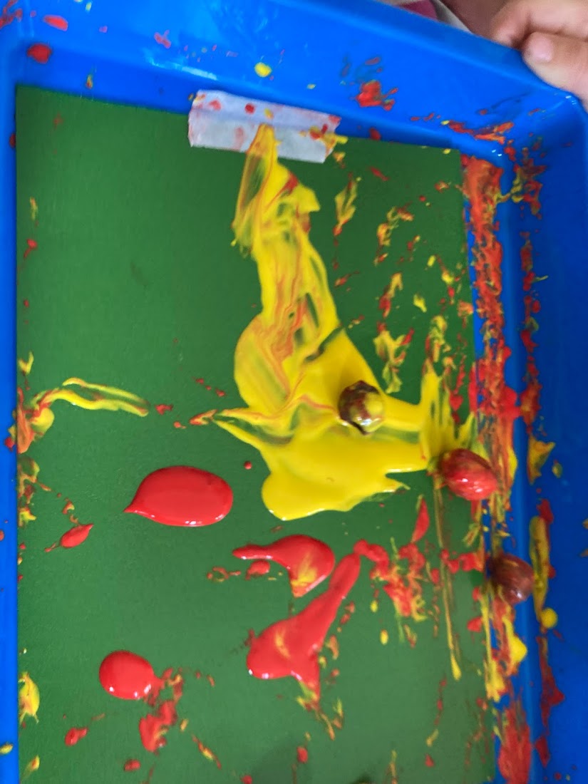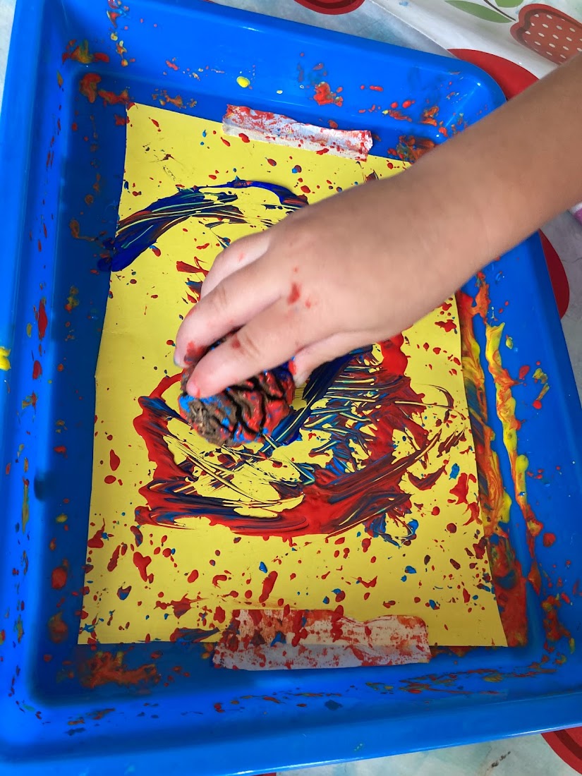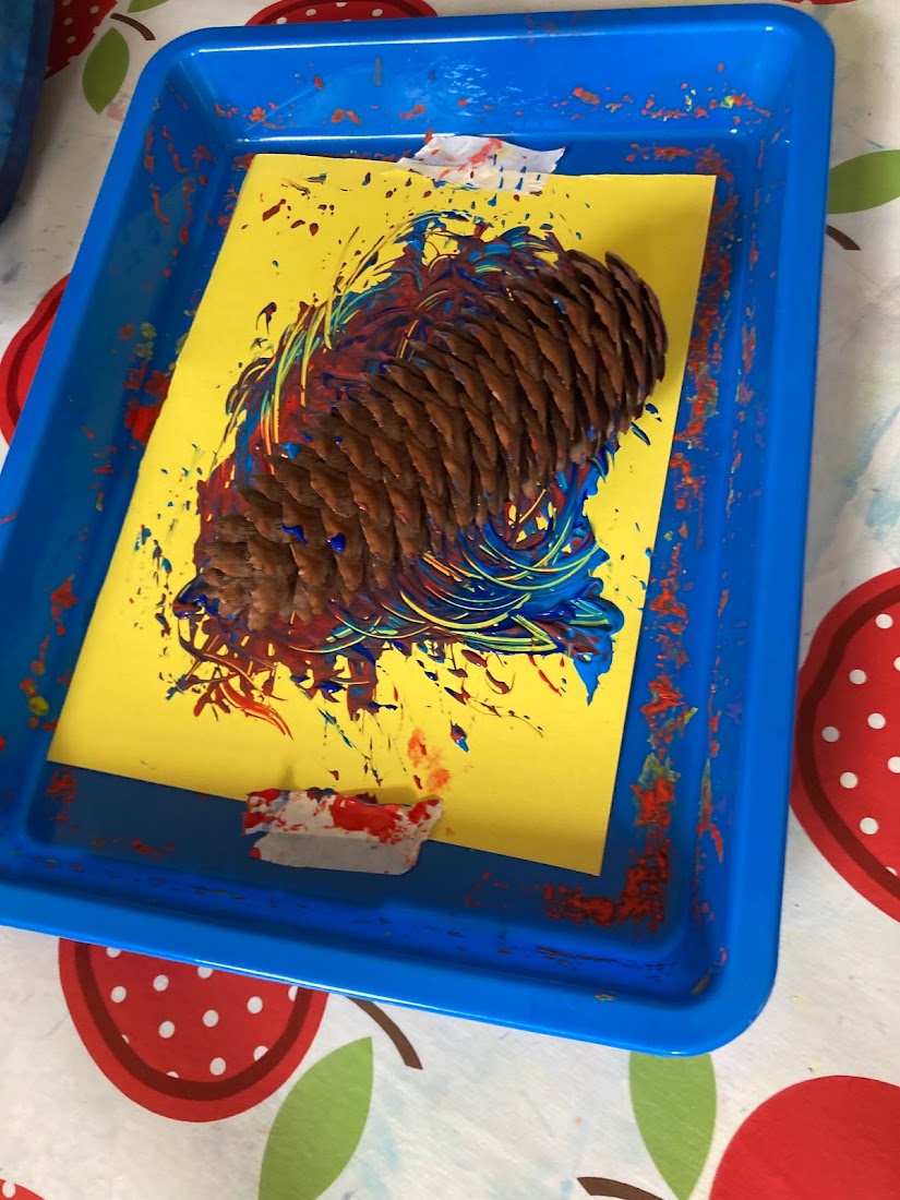 This week the toddlers have enjoyed exploring mark making with paint, acorns, pine cones, leaves and sponges.
