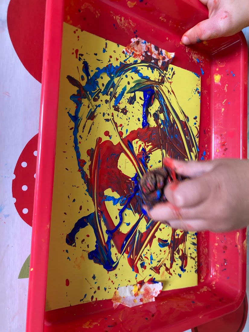 Some of the toddlers were enjoying squeezing the paint in their hands so we showed them a fun colour changing experiment where you paint each hand a different primary colour and then rub them together to change the colour. Some of the parents/guardians kindly allowed the toddlers to use their hands for the experiment if the toddler did not want paint on their hands.