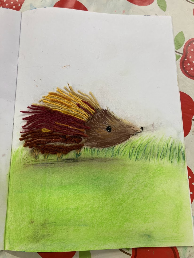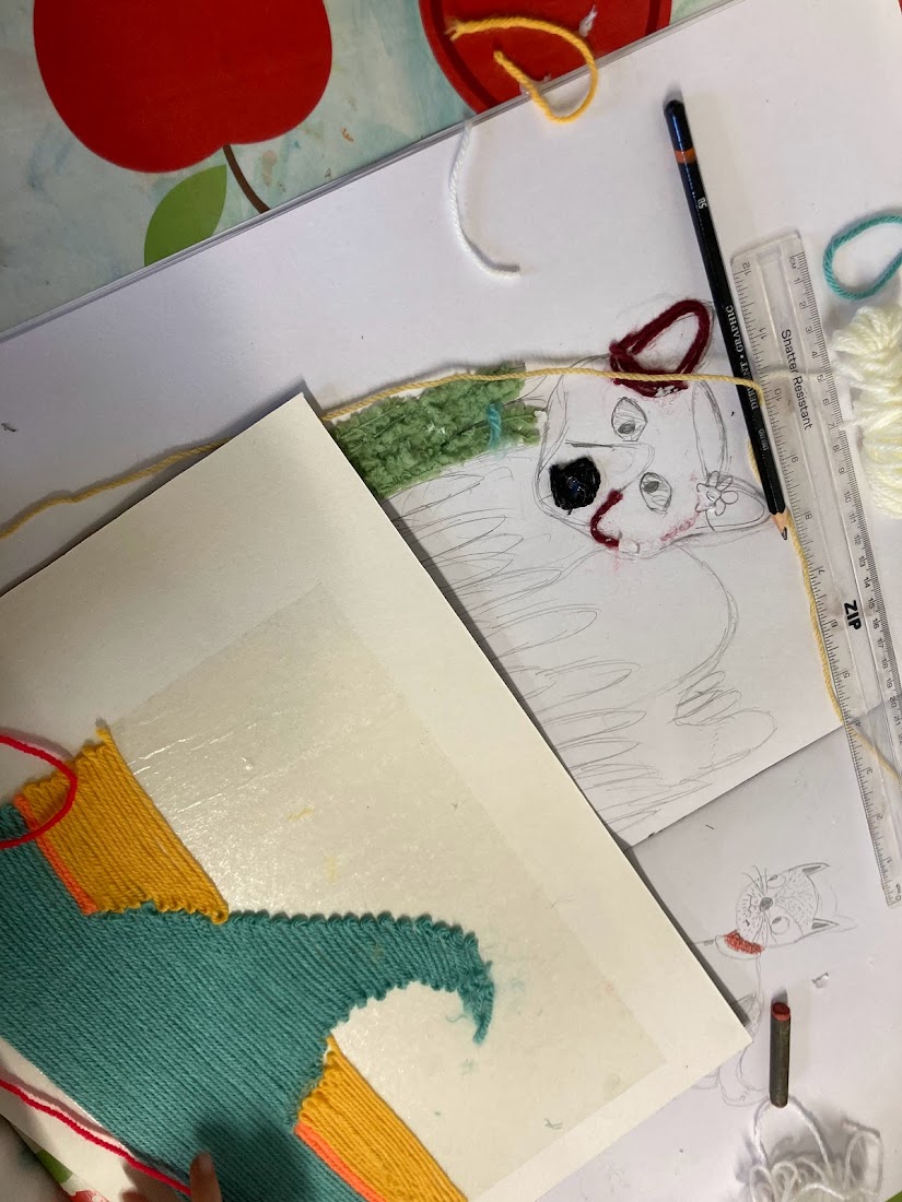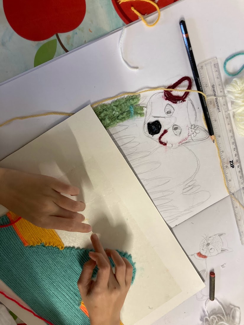 During our second drafting session two of the children finished their draft ideas and the third tested out yarn painting with adhesive paper instead of glue. They found the adhesive paper worked a lot better as any folds and bends stayed in place a lot better than previous attempts in their sketchbook with glue. The other children ended up being quite taken with the appearance of yarn painting so all three have ended up deciding on using it in their final pieces.
