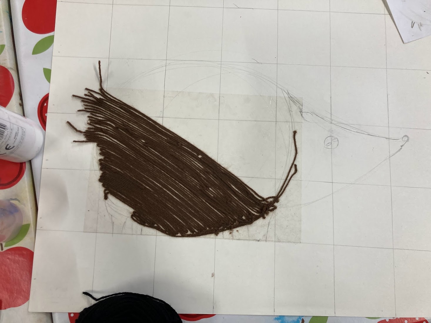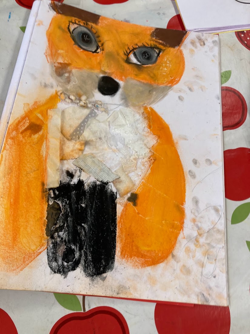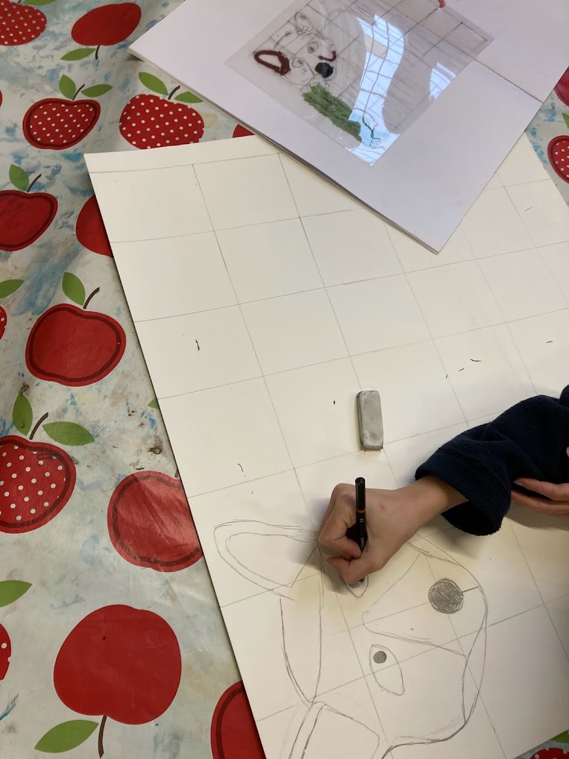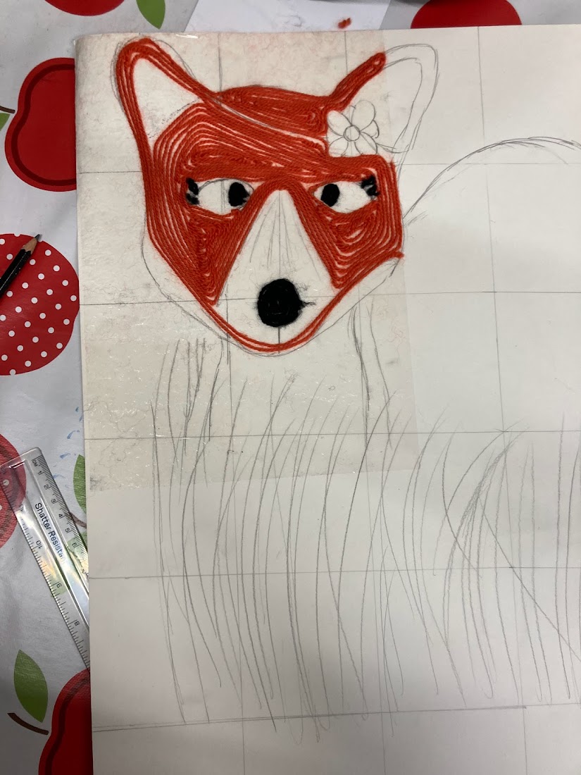 Today the children began their final pieces for our display. Using the grid method we practiced last month they created larger version of the artwork in their sketchbooks, this took most of the session. The children also began adding yarn and paint to their drawings.