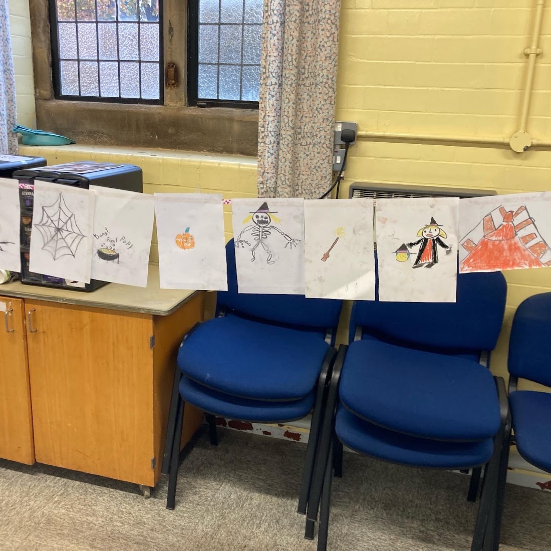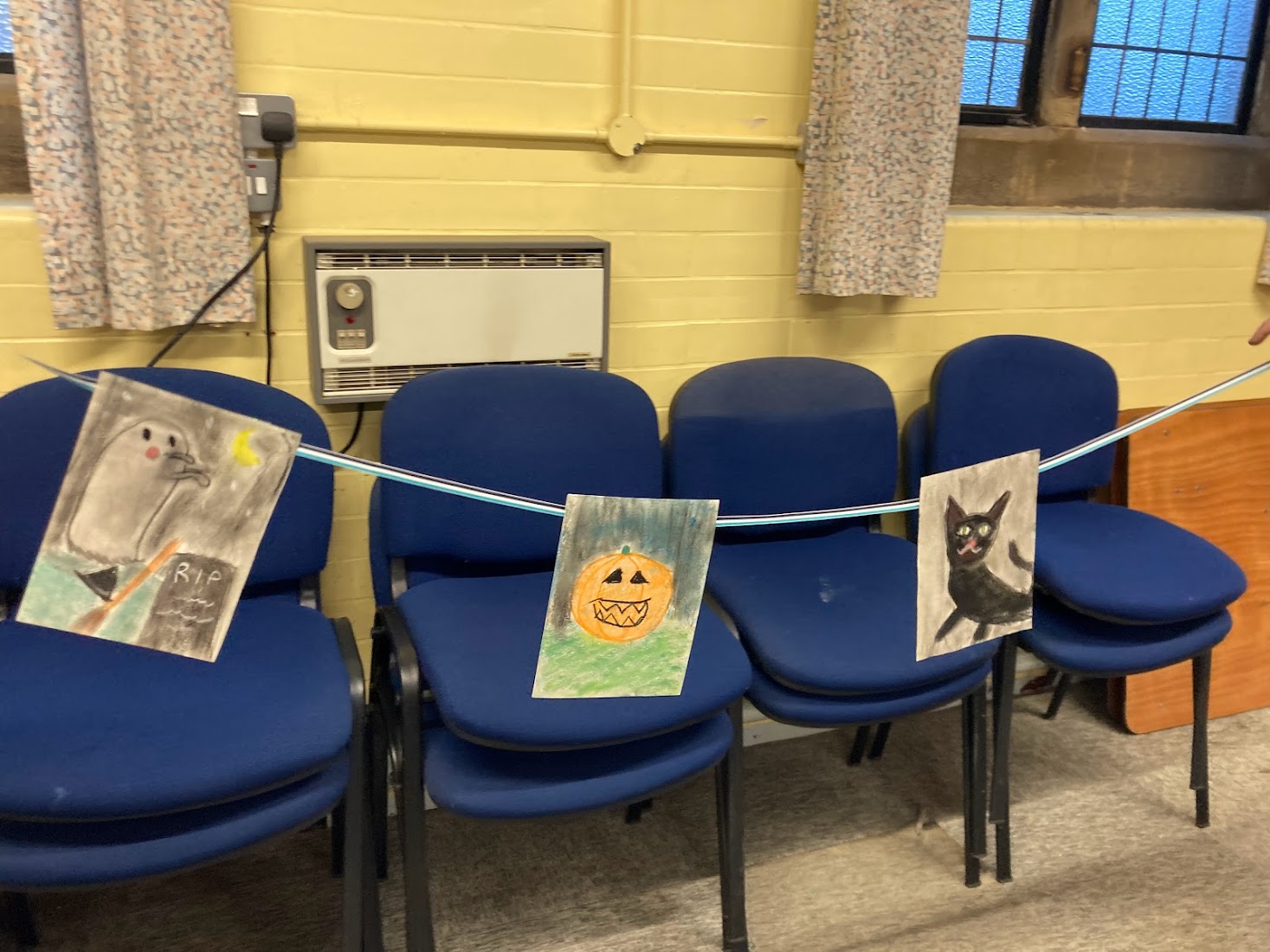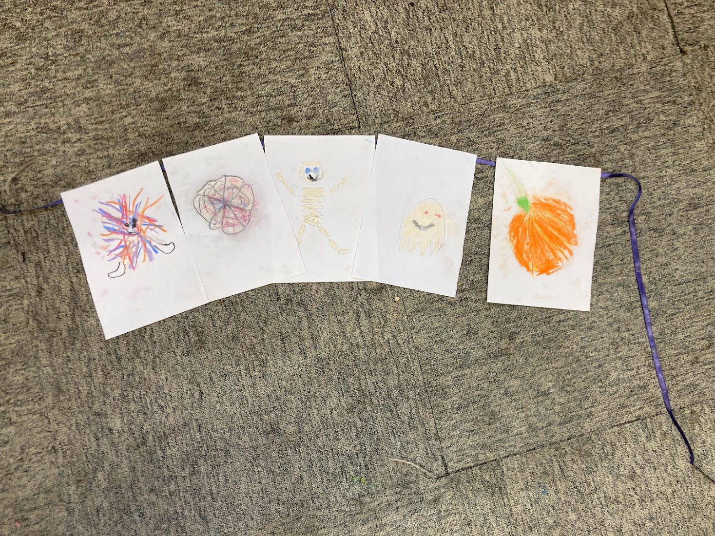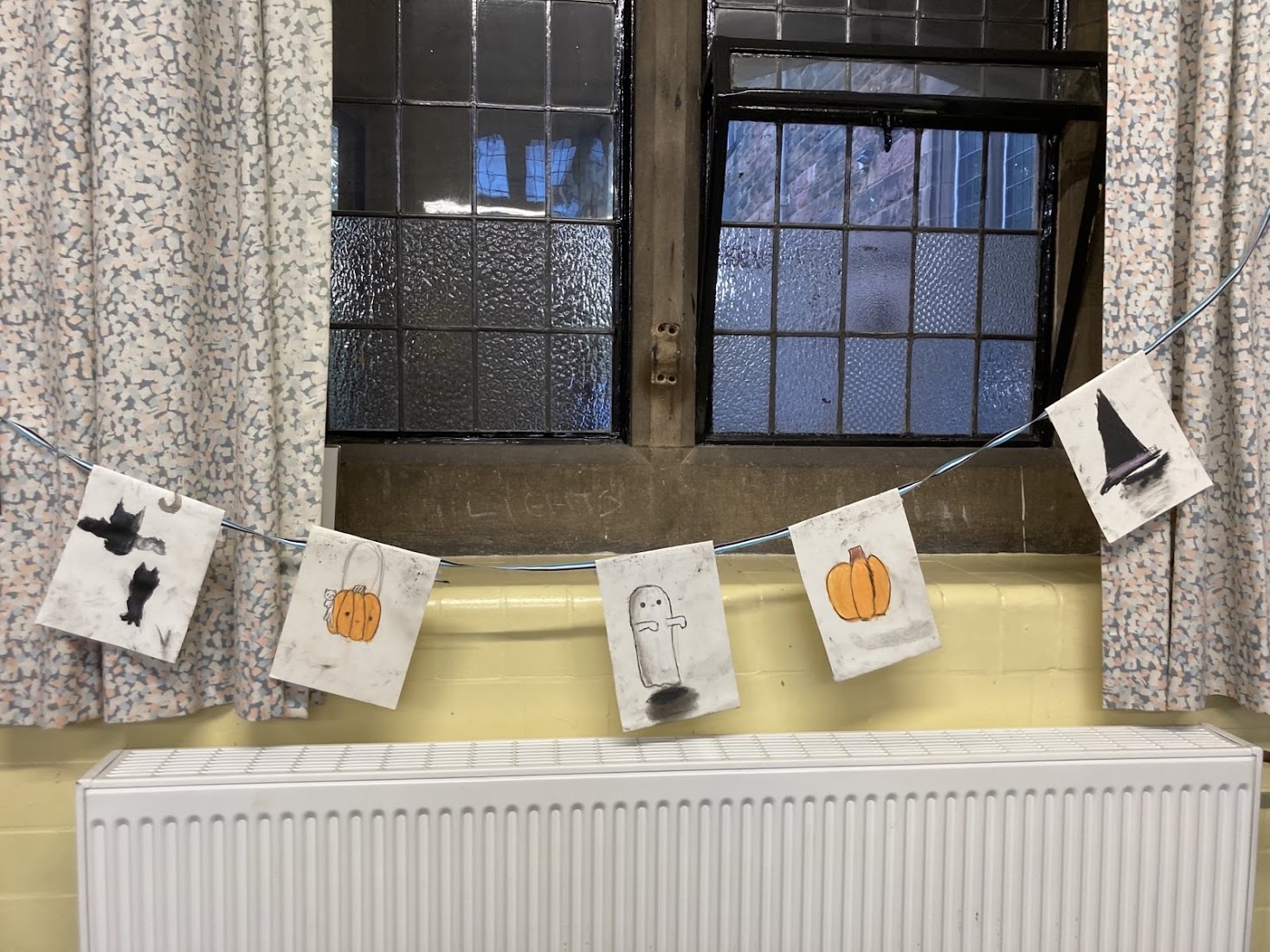 This week we created some spooky Halloween bunting using paper, chalk pastels and ribbon in our Wed & Thurs afternoon sessions. Some of the children enjoyed coming up with a story as they made the bunting, so the order of the pictures on the string followed the story order.