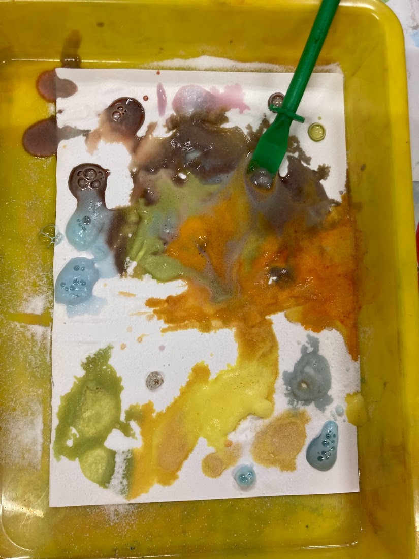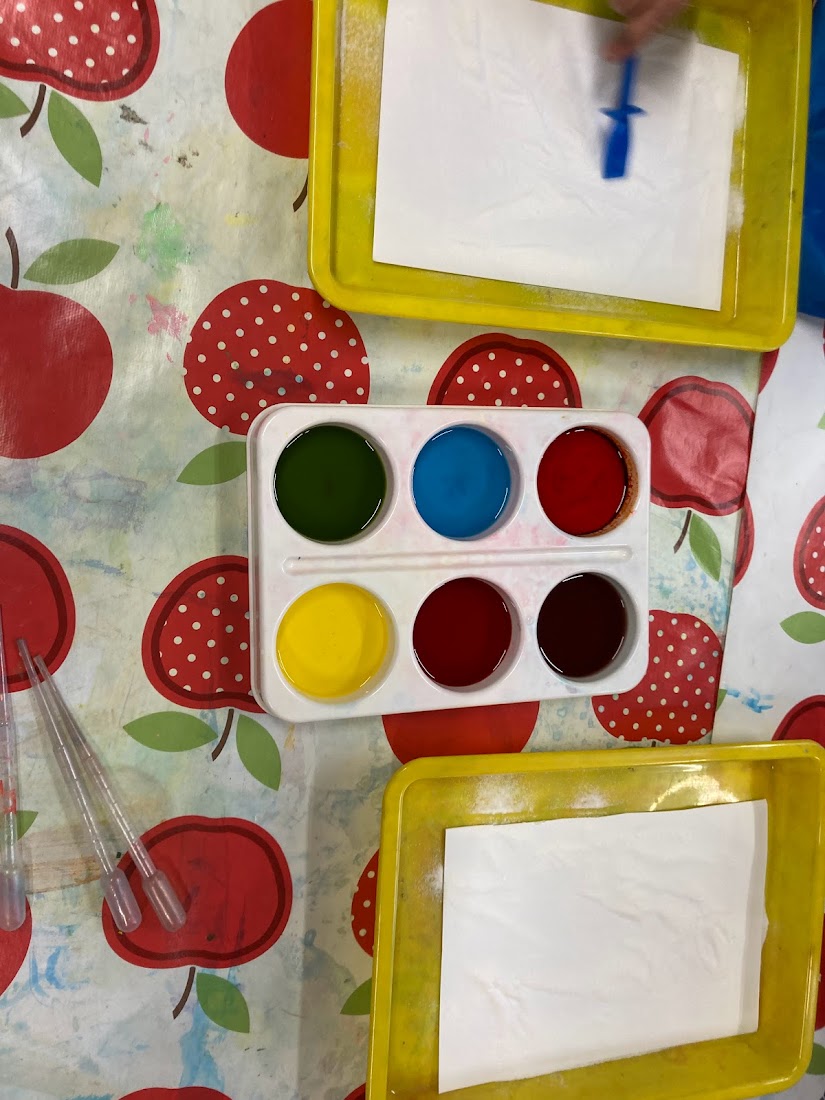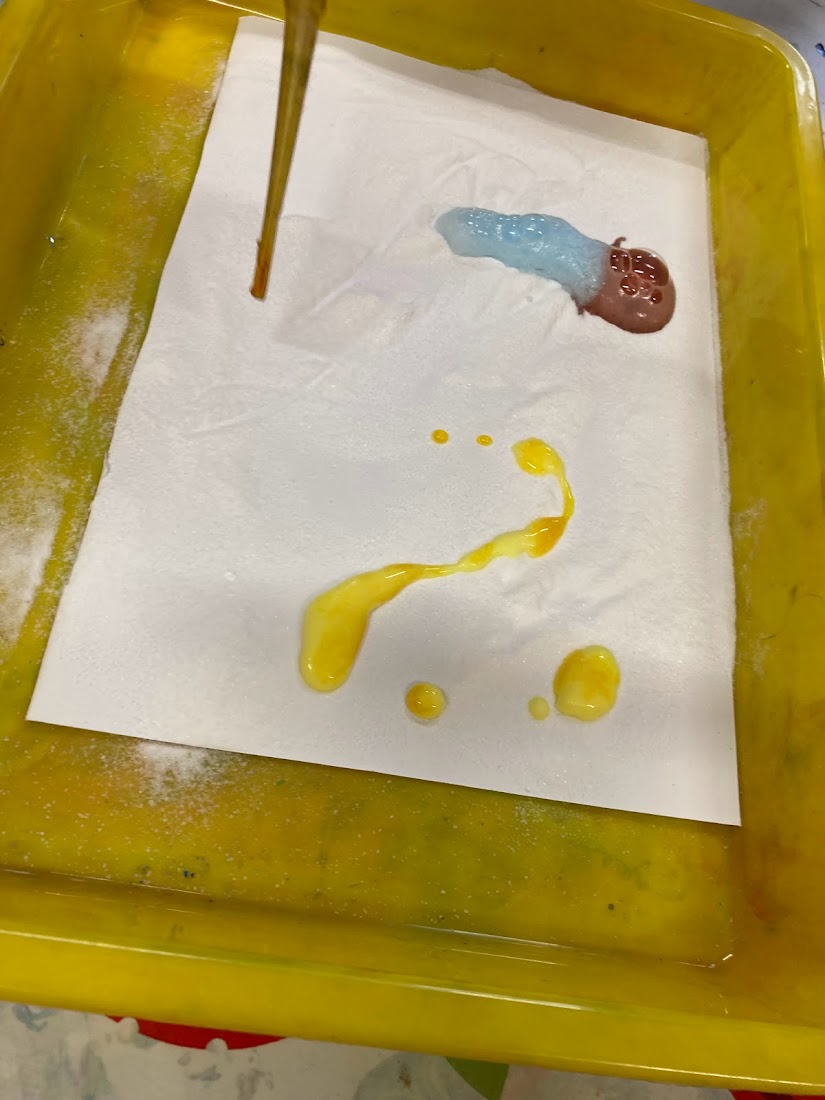Our first experiment involved bicarbonate of soda and vinegar with food colouring mixed in. The children used a pipette to squirt the colourful vinegar onto some paper covered with bicarbonate of soda. The children loved watching the fizzy colours and thought it was like magic! They also enjoyed watching how the colours mixed when you placed two colours near each other.