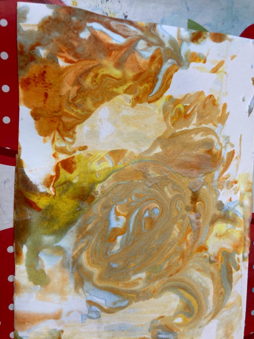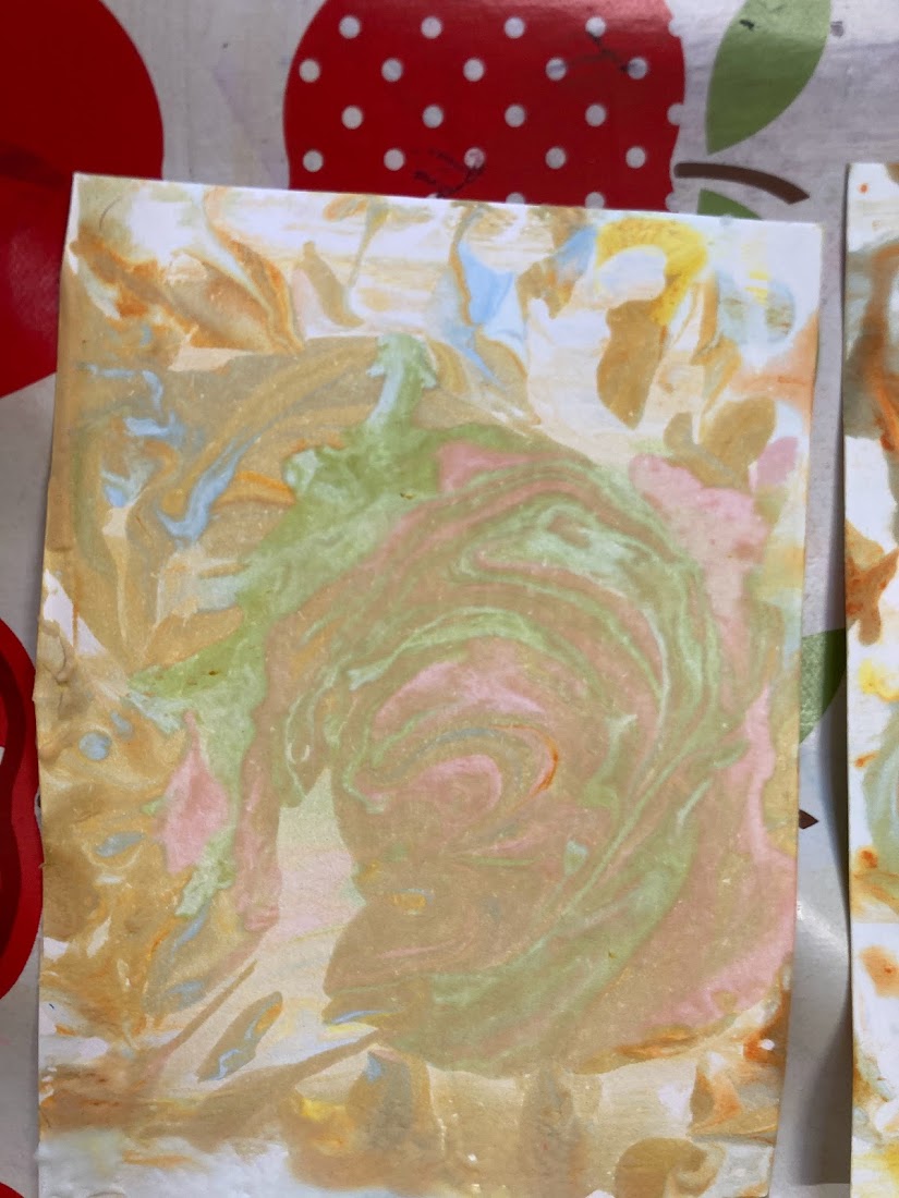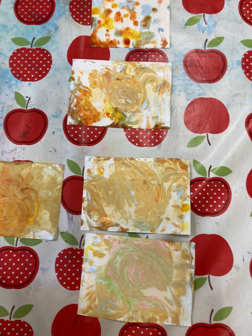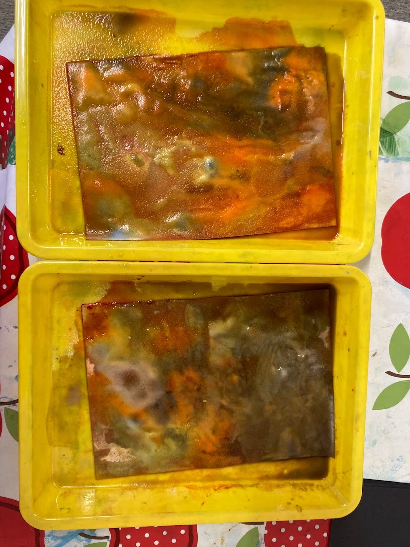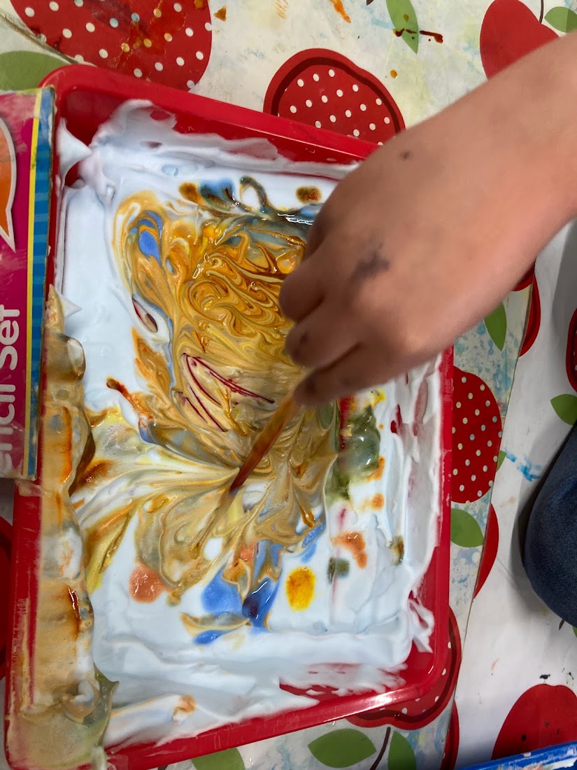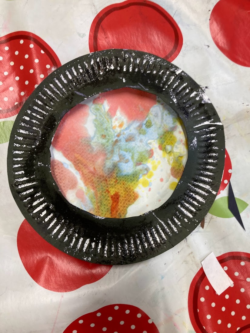For our second experiment we covered a shallow tray in shaving foam and then using a pipette again we added drops of food colouring around the foam before partially mixing the colours together. Then we gently placed paper on top of the foam, pressing down lightly before removing it and using a piece of cardboard to scrap the foam off, leaving the print of the colours behind. We stuck the foam print onto one of our plates for the cauldron and then stuck the second paper plate (which had it’s middle cut out) on top so that it looks like a witch’s cauldron with a magic potion brewing.