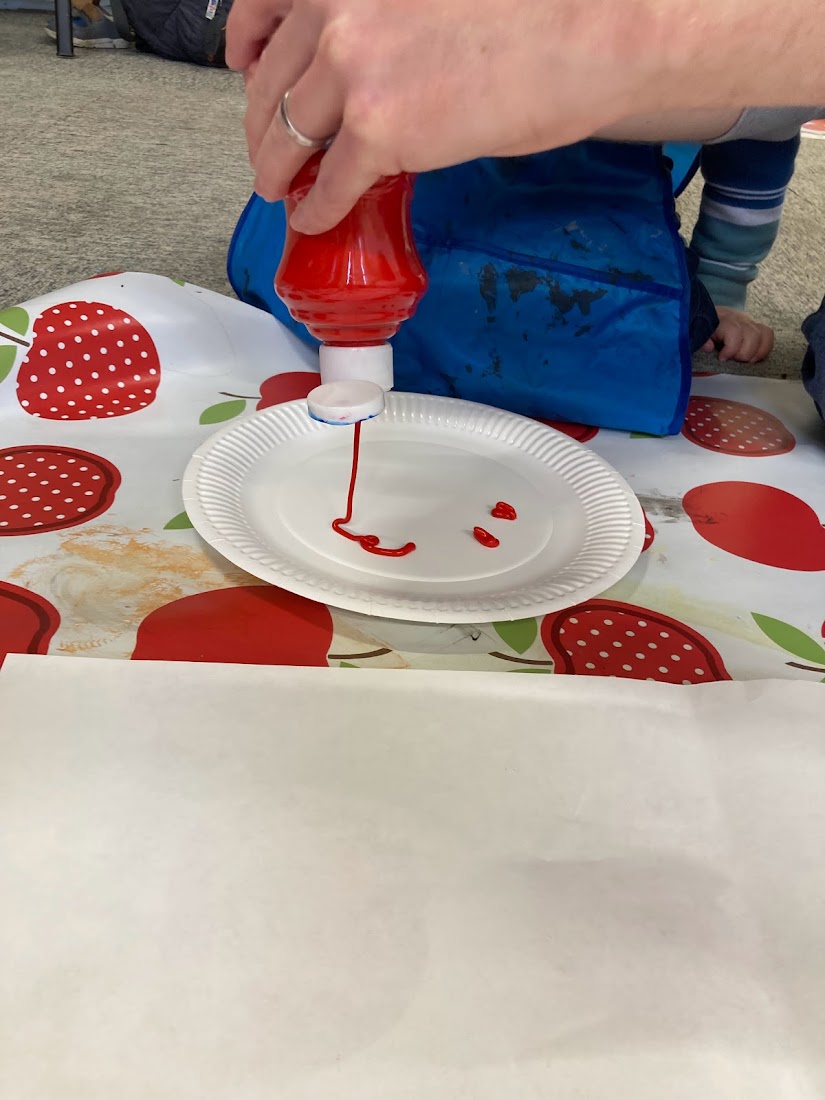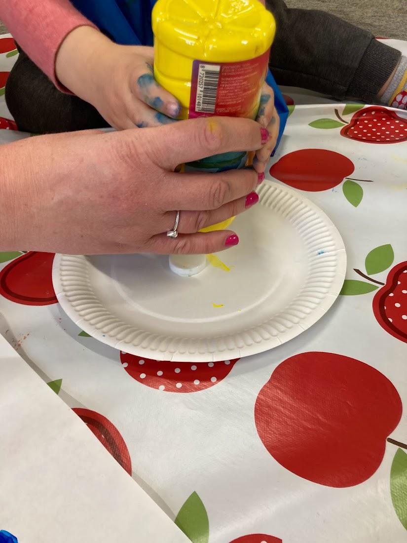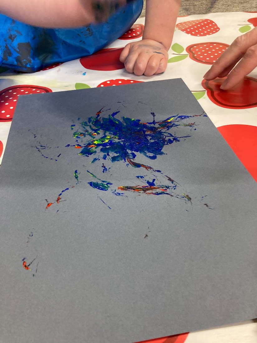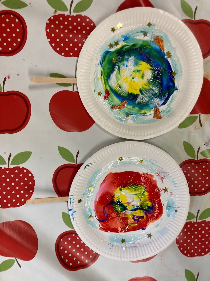 The main craft we made today were some paint spinning Catherine Wheels. These were made by squeezing blobs of two different colours of paint onto a paper plate, which we then flipped upside down onto some paper and spun. Next we added a wooden stick for the handle and some pipe cleaners and stars to the plate.