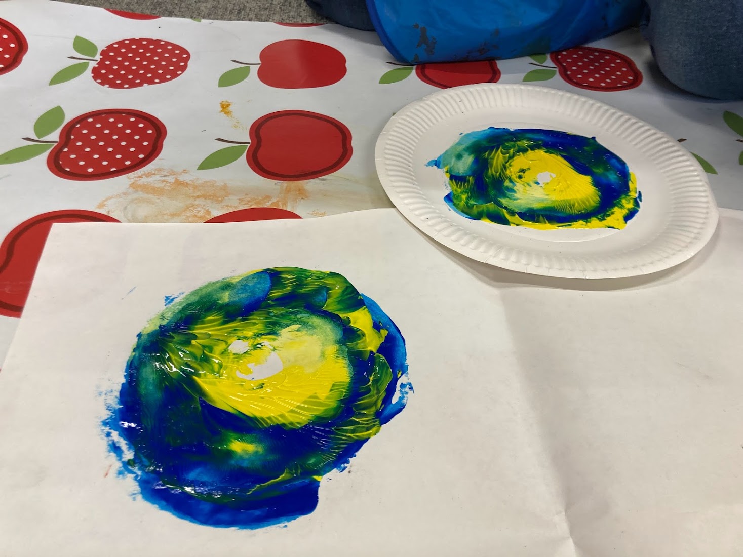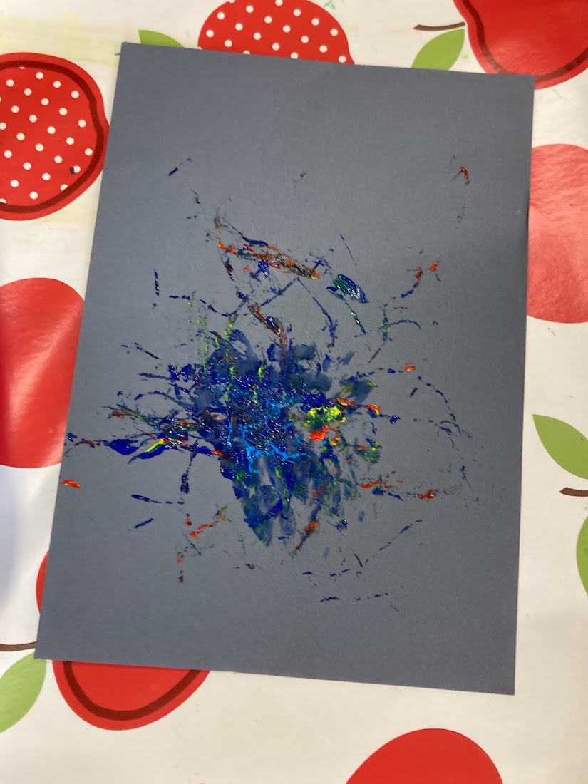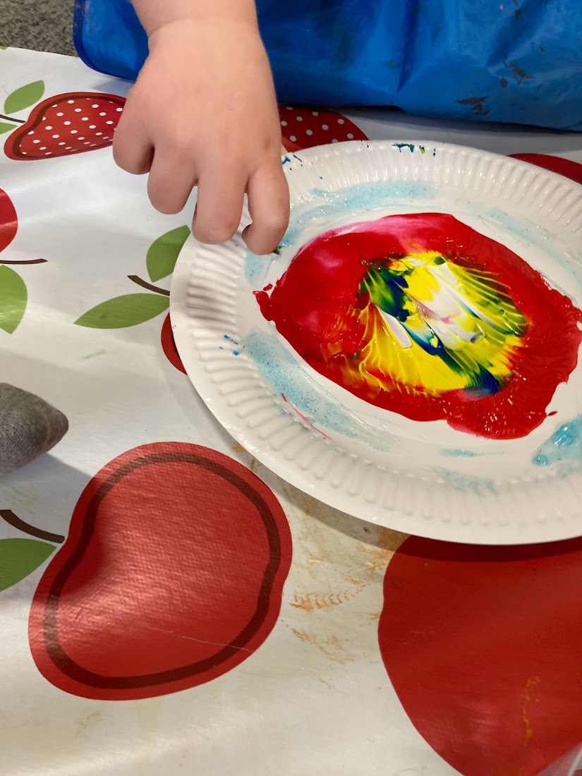 The main craft we made today were some paint spinning Catherine Wheels. These were made by squeezing blobs of two different colours of paint onto a paper plate, which we then flipped upside down onto some paper and spun. Next we added a wooden stick for the handle and some pipe cleaners and stars to the plate.