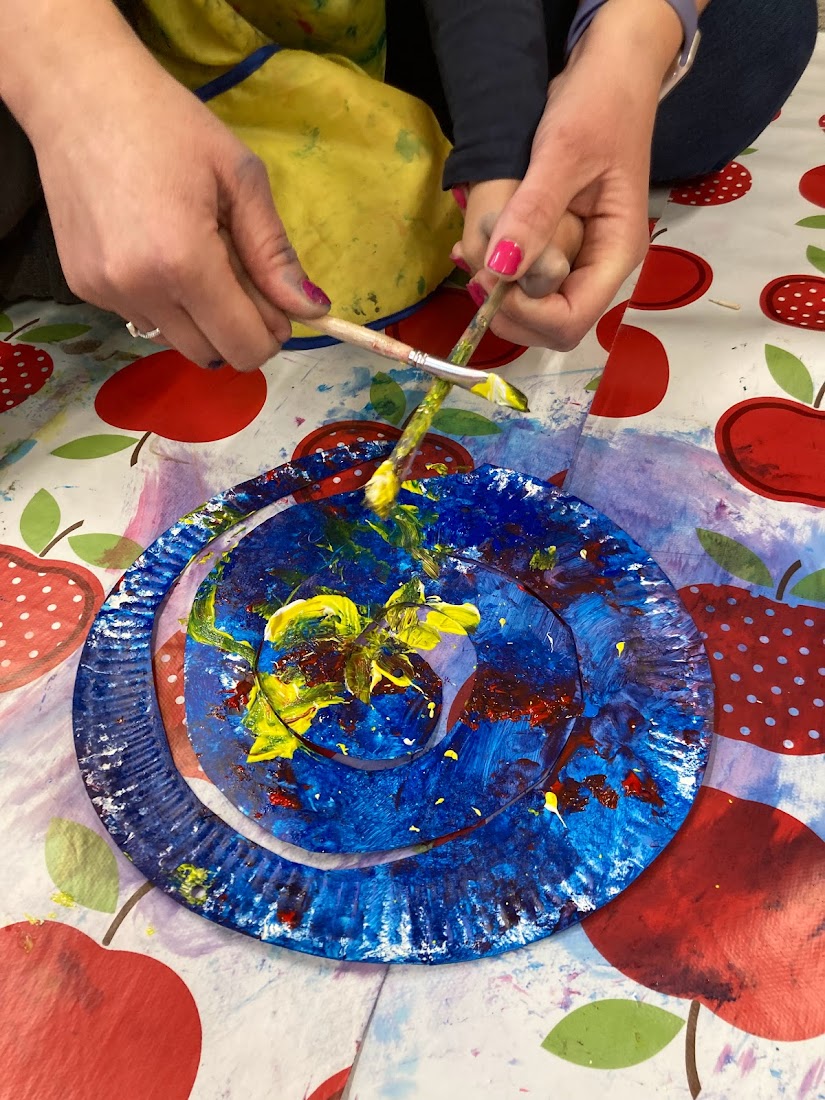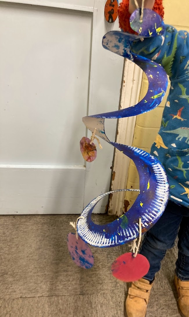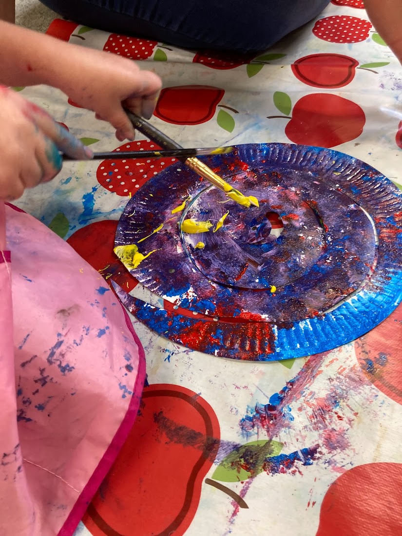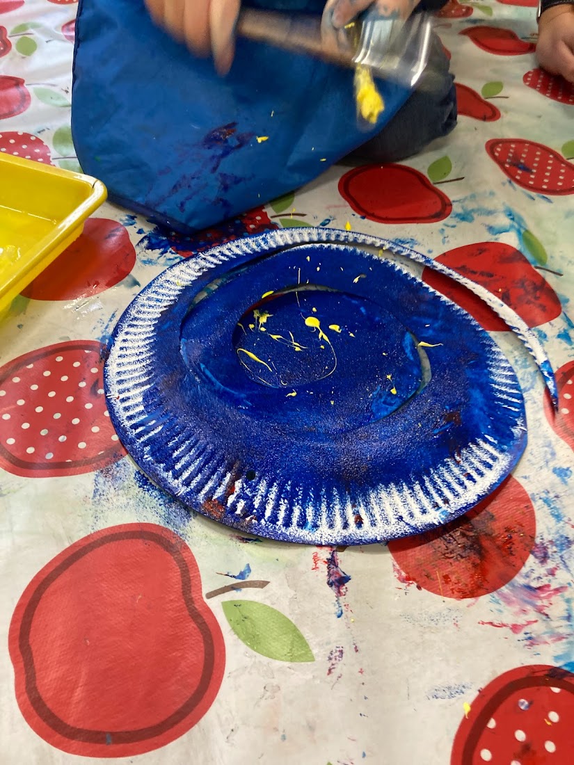 This week we had lots of fun sponge painting some paper plates cut into a spiral. The blue and red paint was squirted directly onto the plate and the toddlers used their sponges to spread it, they enjoyed mixing the red and blue together on the plate. After they had finished sponge painting the next task was splatter painting stars! Everybody loved trying out platter painting and one of the children got more paint on their parent than on their solar system!