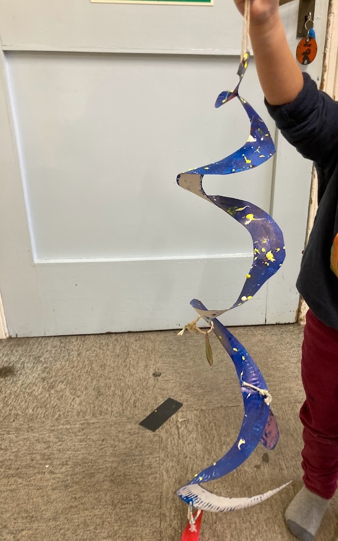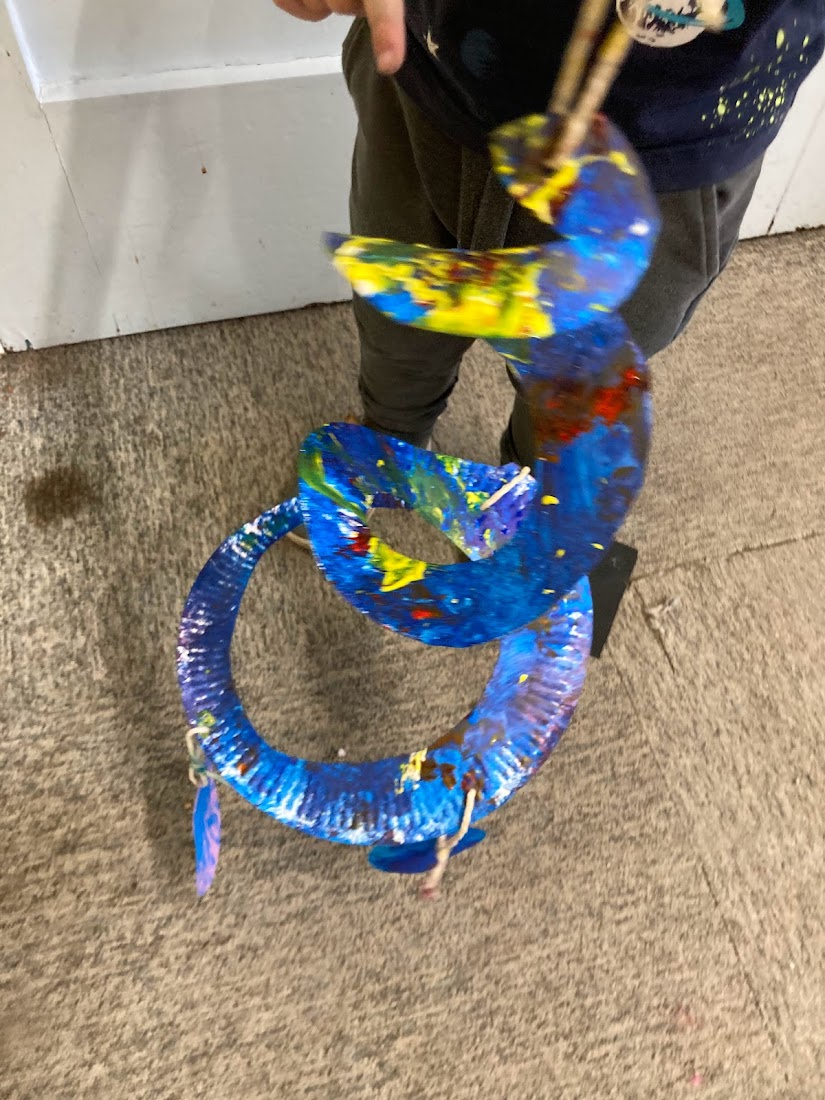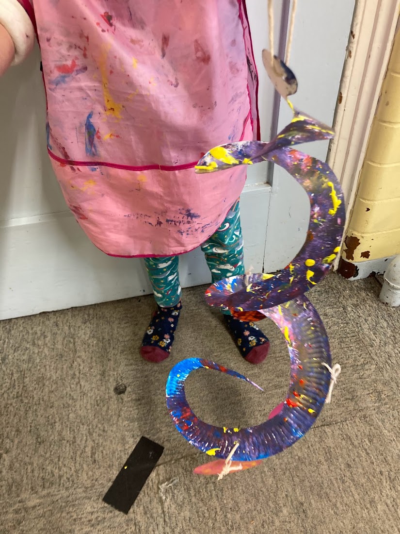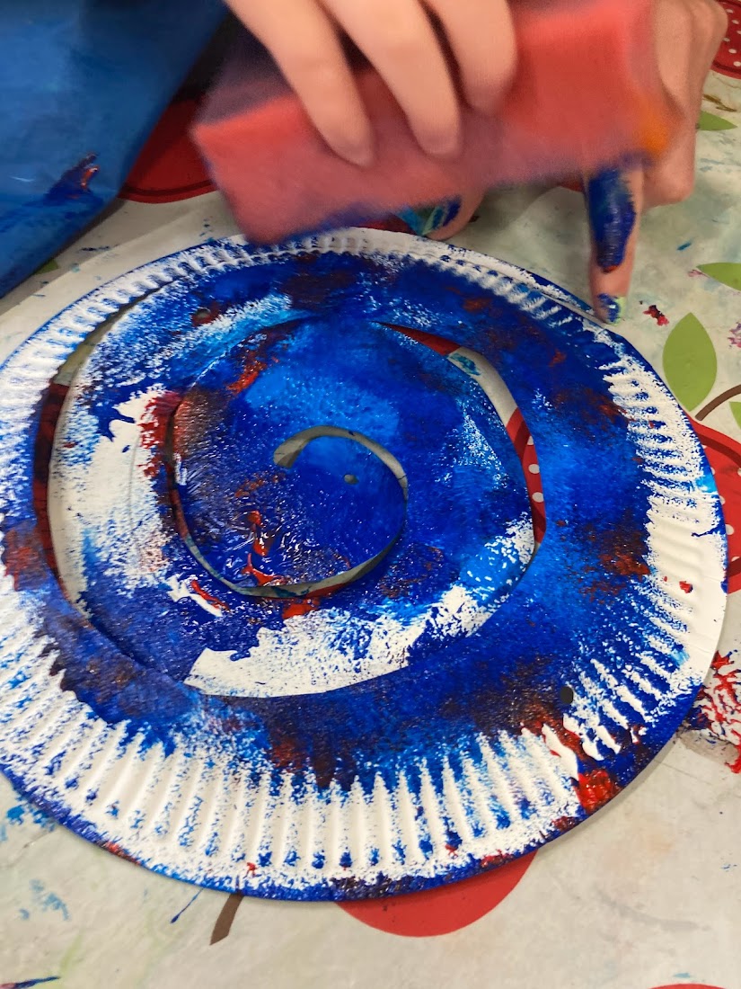 This week we had lots of fun sponge painting some paper plates cut into a spiral. The blue and red paint was squirted directly onto the plate and the toddlers used their sponges to spread it, they enjoyed mixing the red and blue together on the plate. After they had finished sponge painting the next task was splatter painting stars! Everybody loved trying out platter painting and one of the children got more paint on their parent than on their solar system!