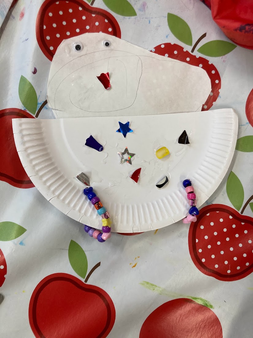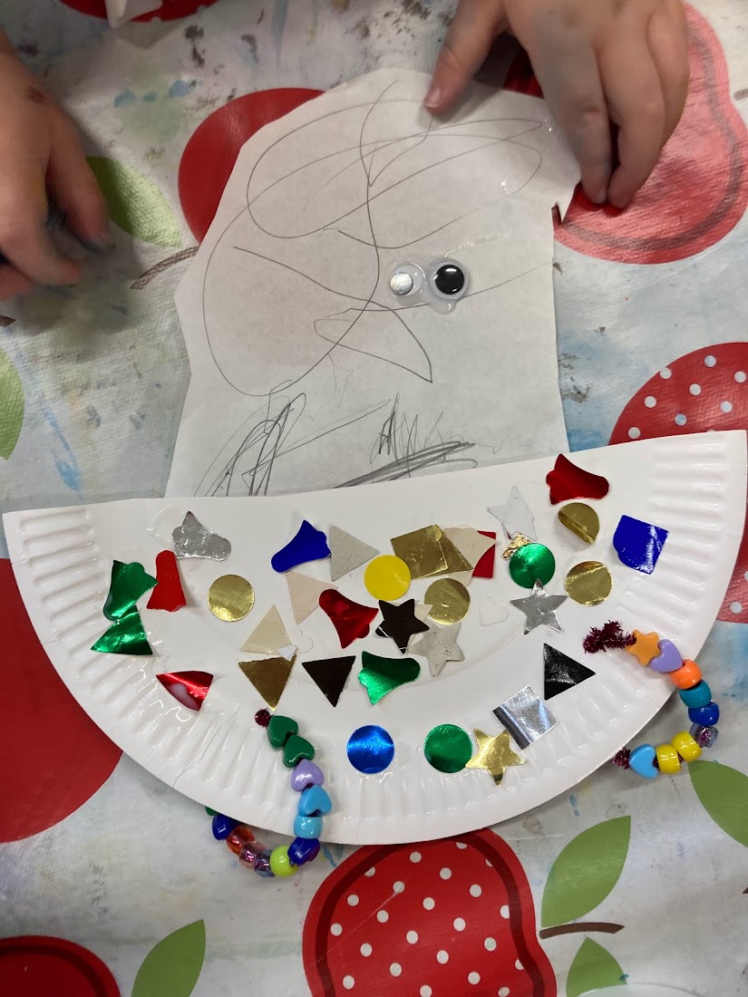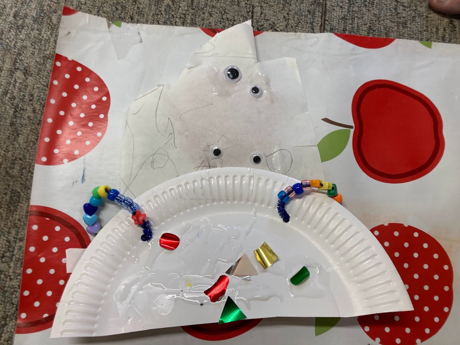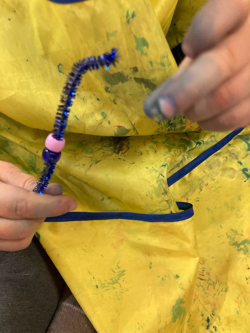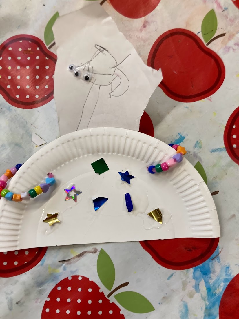 Whilst waiting for the paint to dry (so we could string the solar system together) the children made some alien space ships out of paper plates, they had different shapes to glue on and we also threaded some beads on pipe cleaners to add some fun hoops onto the ships. The toddlers found threading on pipe cleaners a lot easier than on string and had fun choosing different coloured beads. Finally everyone drew their own alien and gave them some googly eyes before sticking them in their space ship.