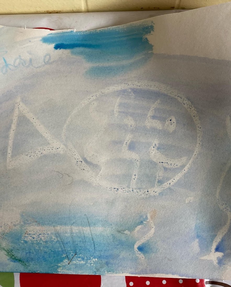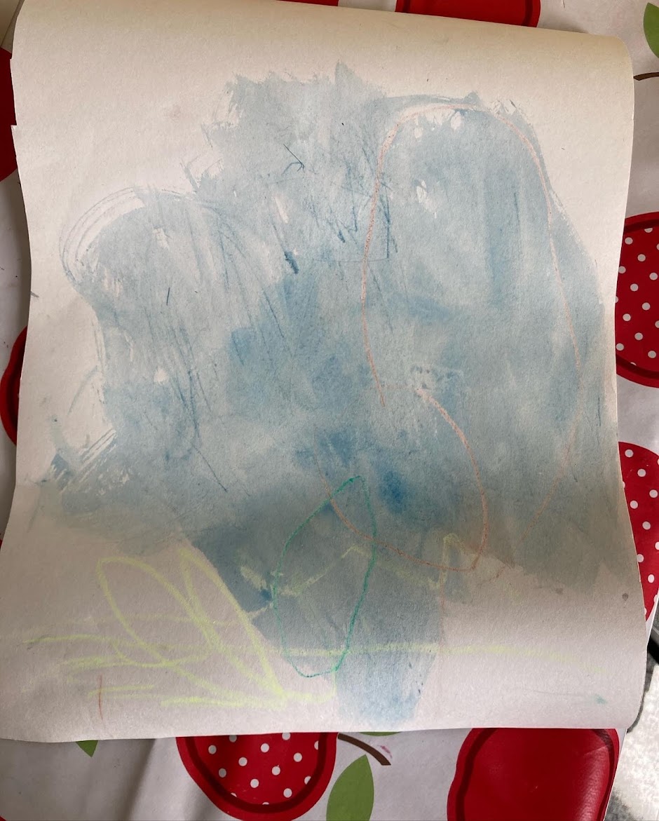During the first half of our session this week the toddlers had lots of fun experimenting with wax resist painting. To begin with they had a massive piece of paper rolled out on the floor to have fun covering! Although they loved uncovering ‘magic pictures’ with the paint the toddlers enjoyed experimenting with colour mixing more. After we finished the big picture a couple of the toddlers had fun making under water pictures with blue watercolour paint and the wax crayons. The fish were named Nemo and Freddie.