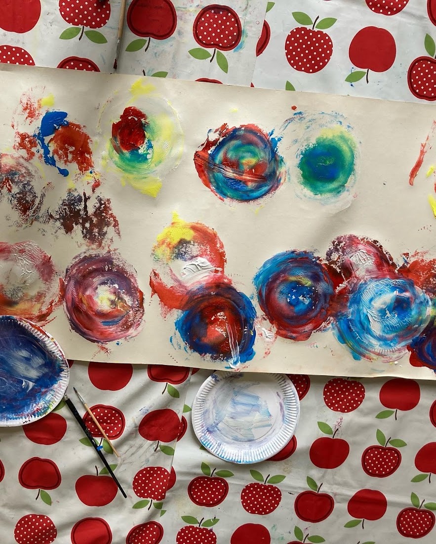 Everyone wanted to try out paint spinning which two of the children used to make their fantastic paper plate garlands. They were inspired by the plate spinning art our toddler group had created the previous week which were on our display.