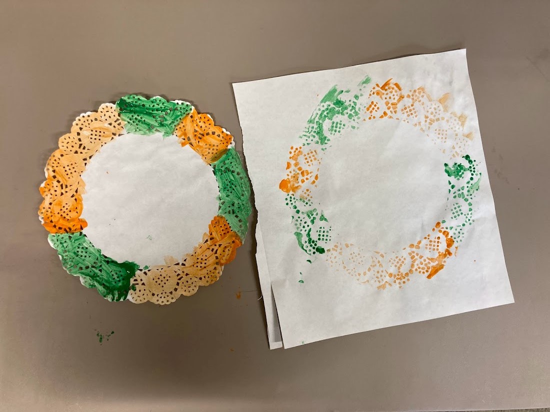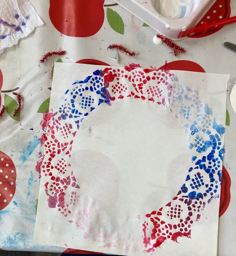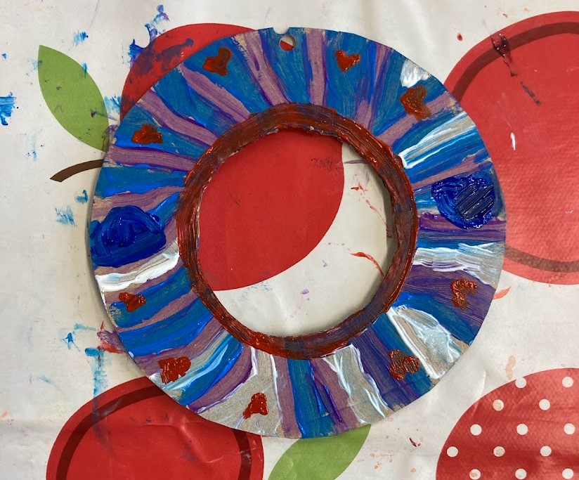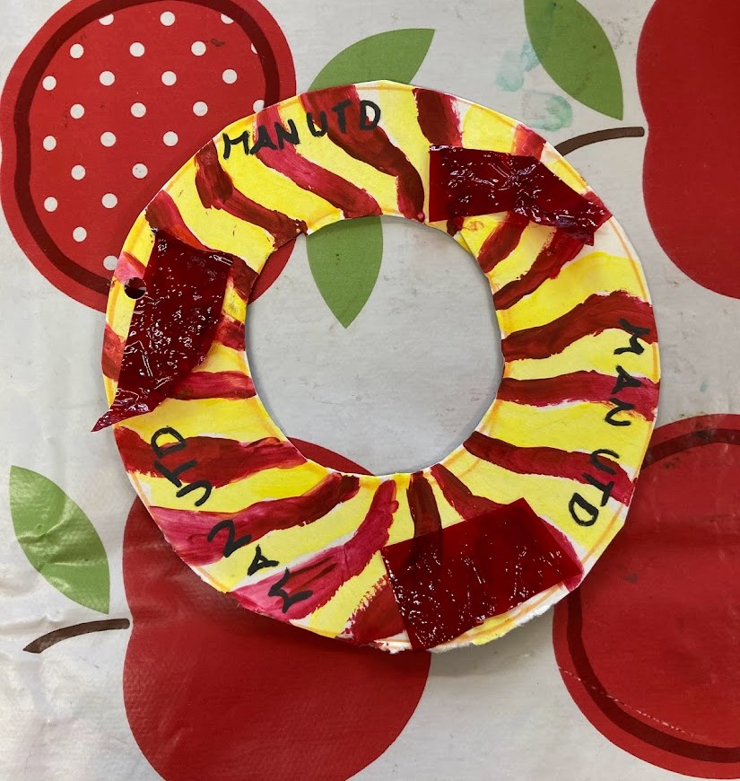 Next we made some garlands, some of the children used the British flag colours but most decided they wanted to try using different colours or themes. We ended up with a variety of ways of creating garlands. Some garlands were made out of paper plates, some by using a paper doily as a stencil and several with a ring cut out of cardboard. The cardboard ring garlands ended up being a mix of painted and collage.