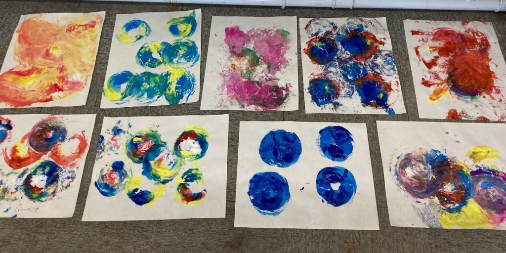 During the last part of todays session we spontaneously decided to make spin paintings again and experiment with mixing the colours. We experimented with mixing by trying spin the plates for longer, pressing two plates together and using brushes on the spin paintings to drag wet paint from one section to another.